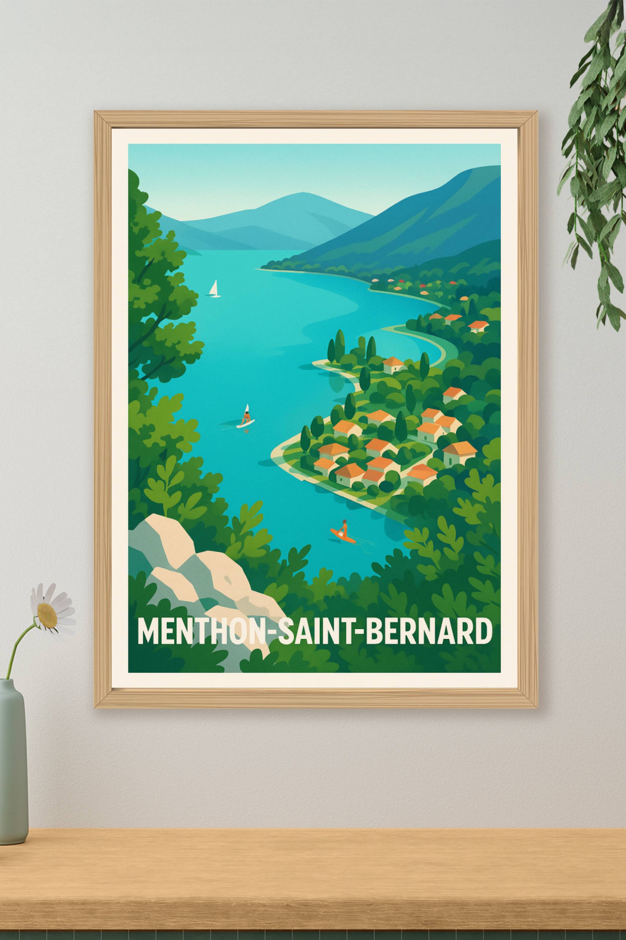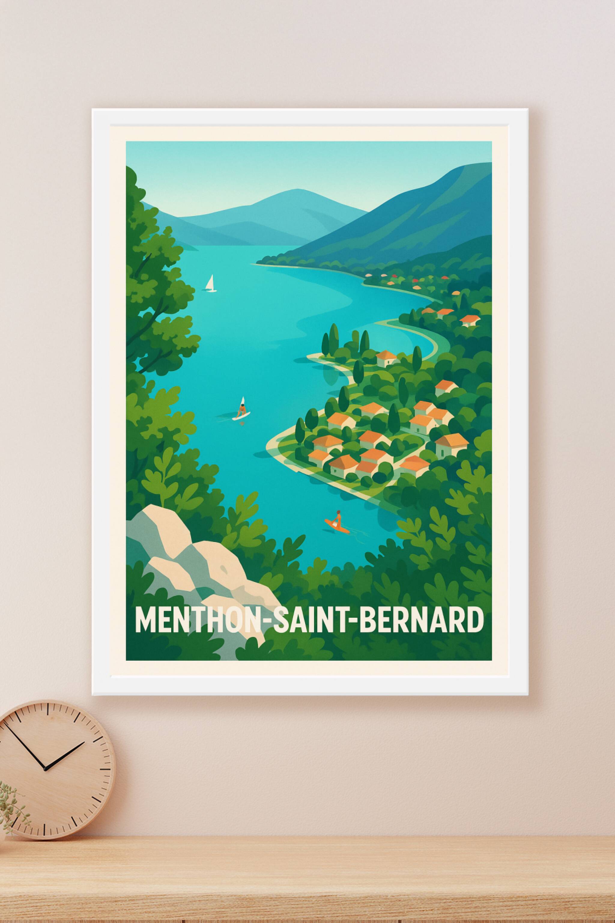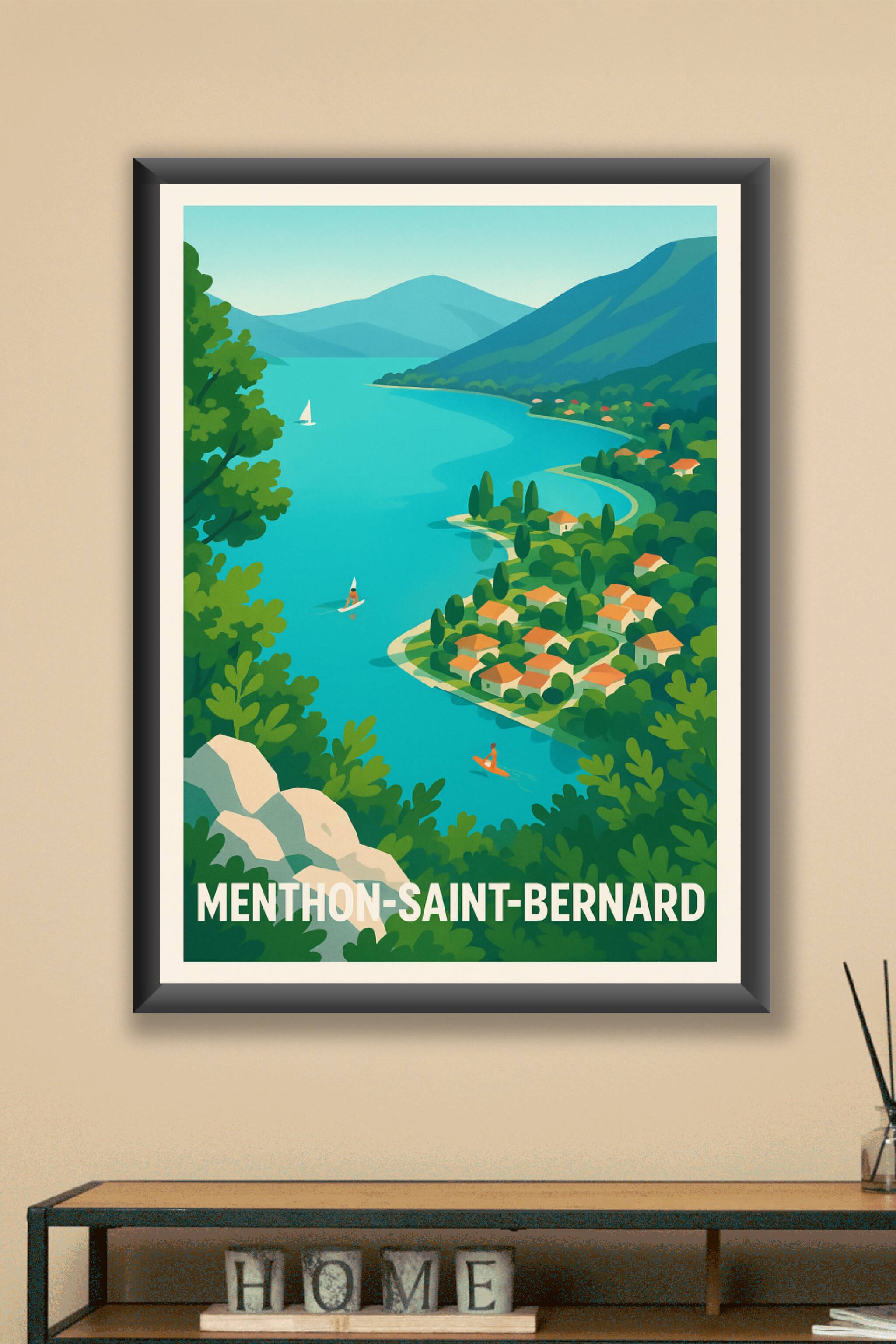 Découvrez la douceur de vivre de Menthon-Saint-Bernard avec cette magnifique affiche illustrée mettant en avant ses eaux turquoise et ses paysages ...