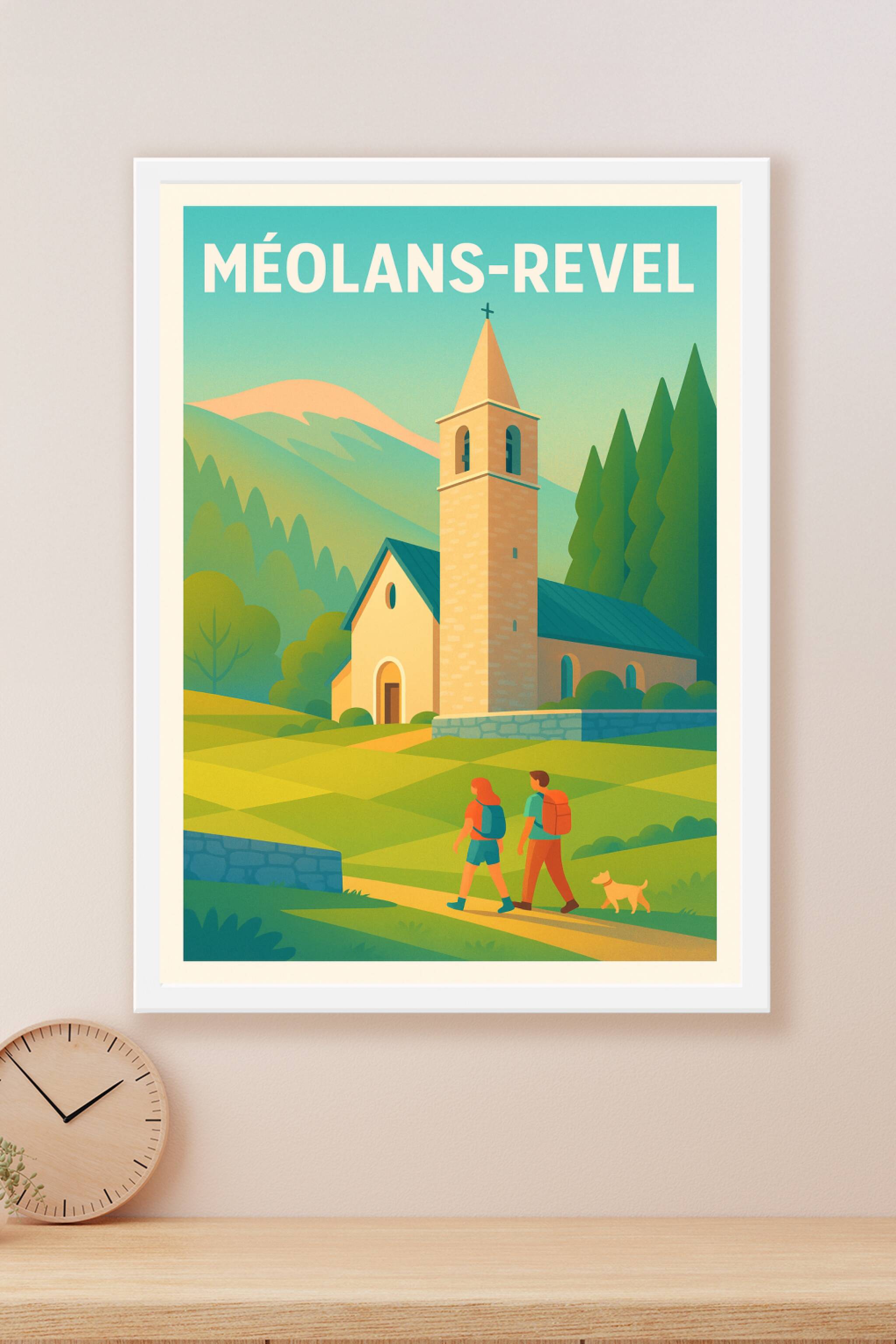 Découvrez la beauté sereine de Méolans-Revel à travers ce poster illustré aux teintes douces et apaisantes. Cette affiche met en scène une charmant...