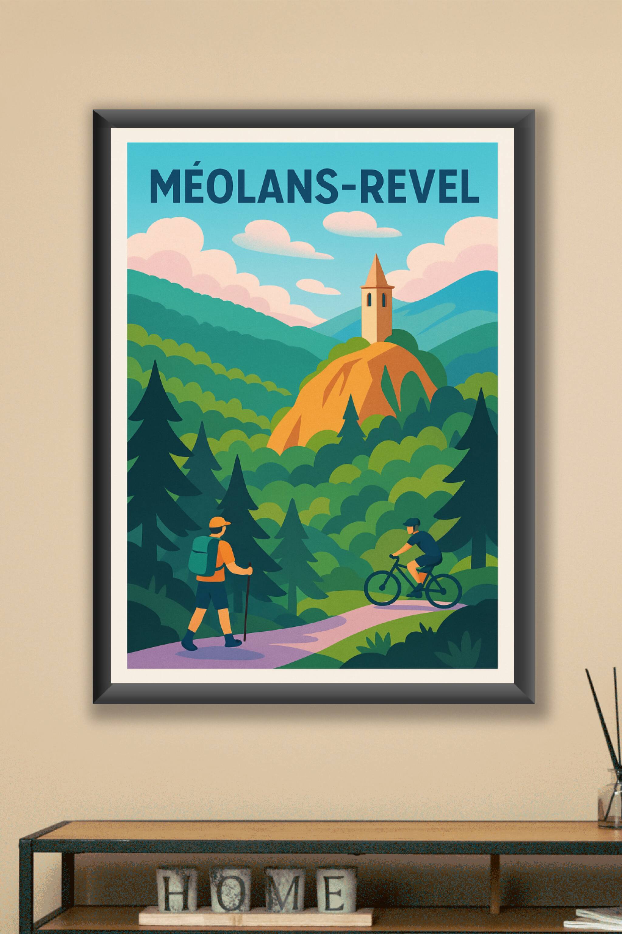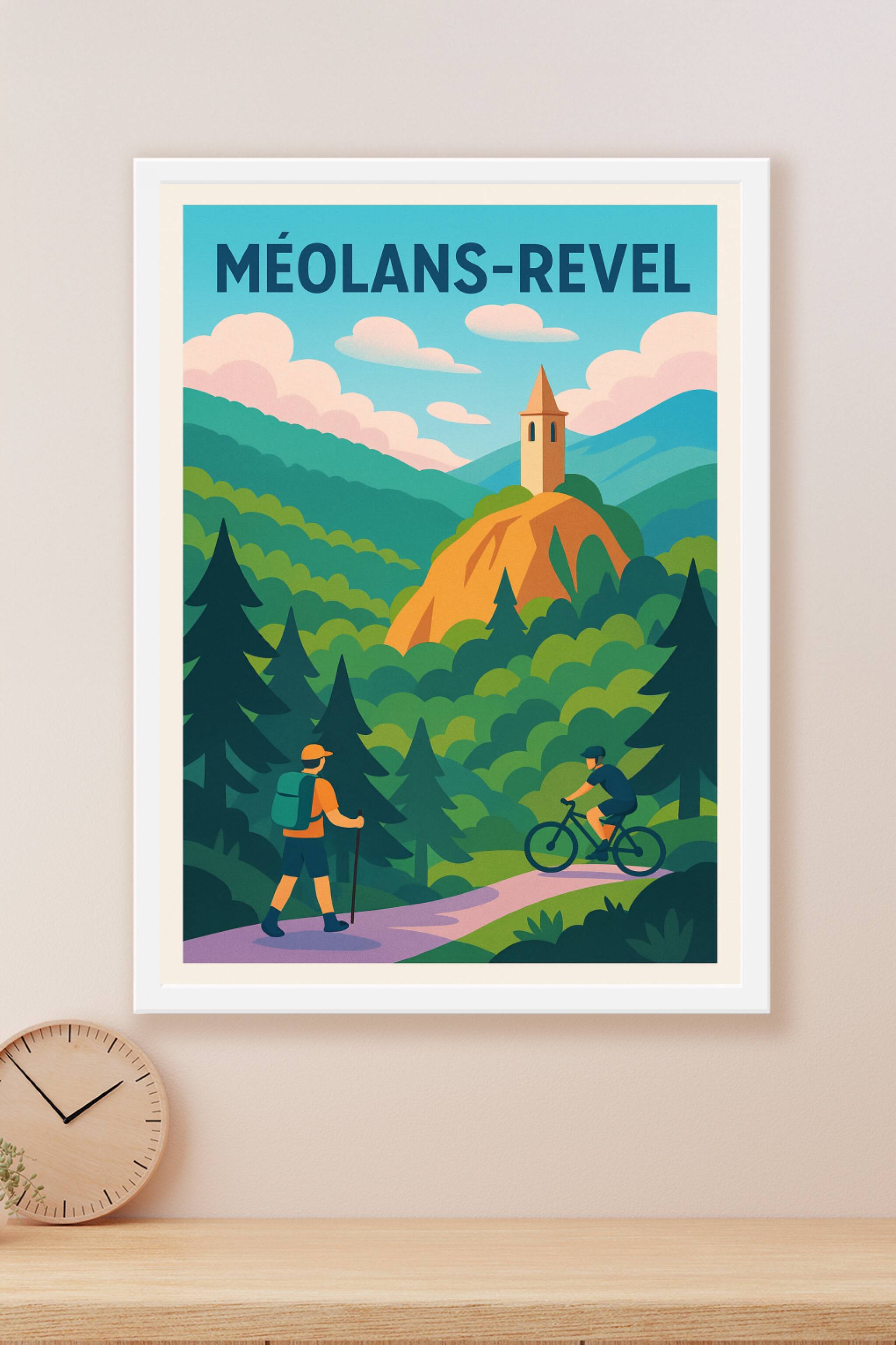 Découvrez la beauté sauvage et paisible de Méolans-Revel avec cette affiche illustrée mettant en scène les activités de randonnée et de vélo au cœu...