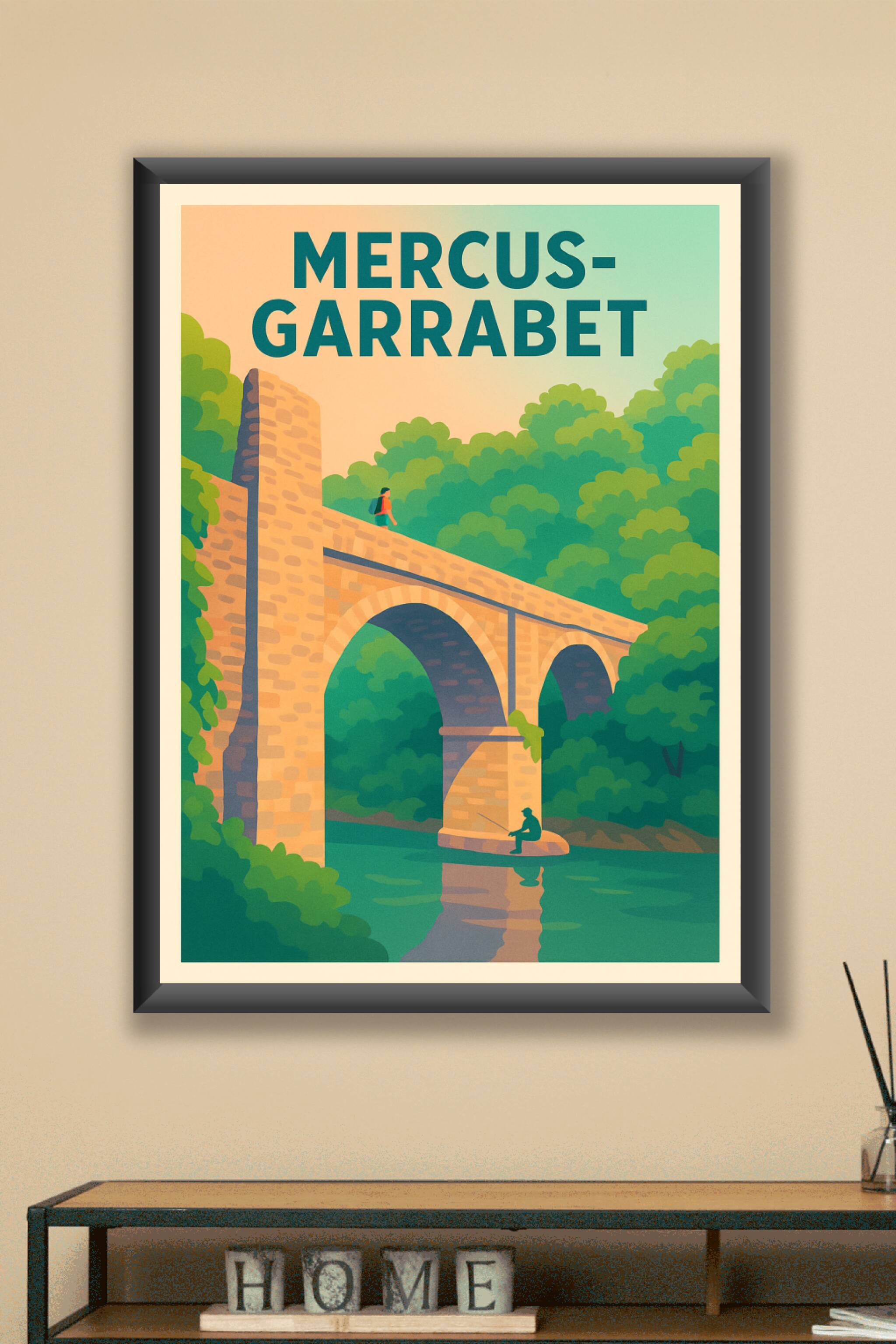 Découvrez l'ambiance paisible et authentique de Mercus-Garrabet avec cette superbe affiche illustrant un vieux pont en pierre surplombant une riviè...