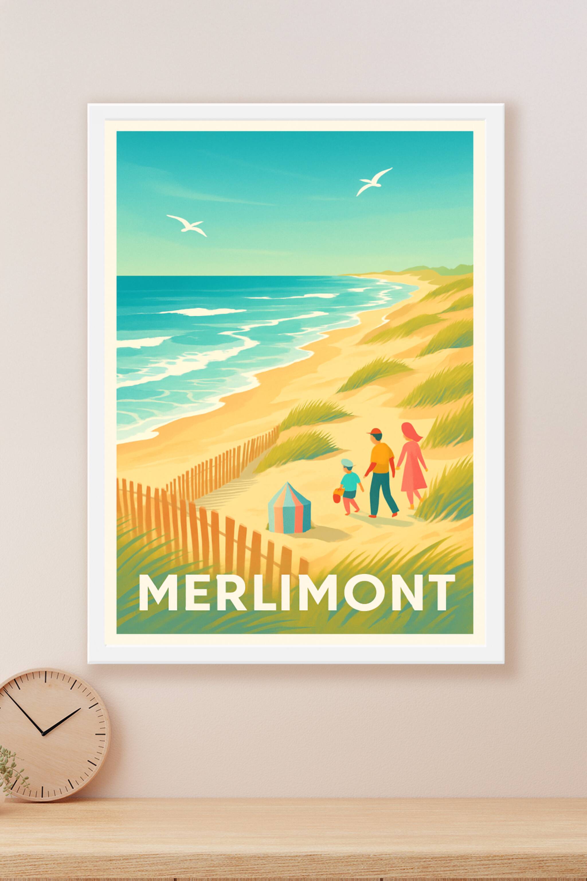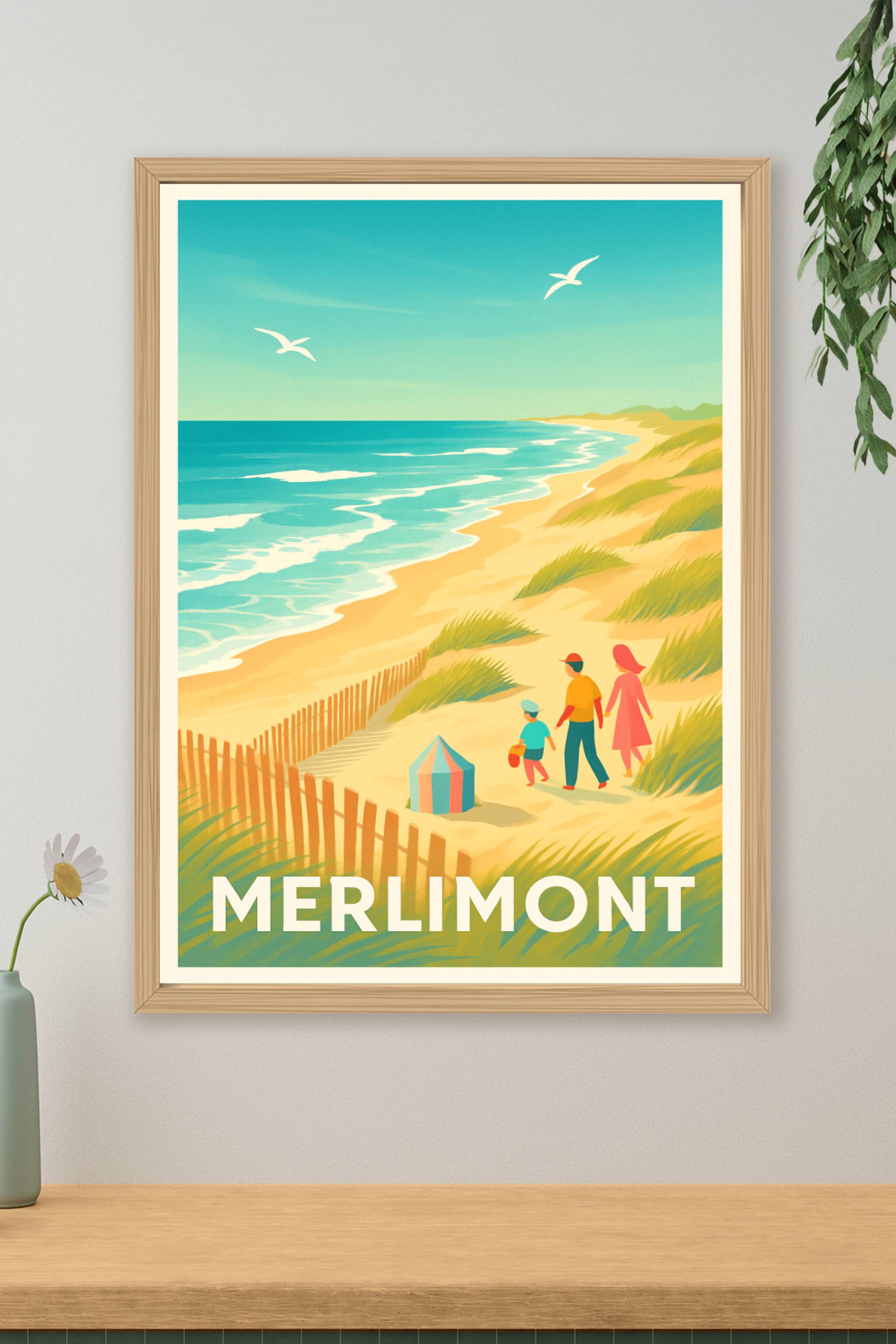 Découvrez l'atmosphère douce et lumineuse de Merlimont avec cette superbe affiche illustrée qui capture le charme de ses plages de sable fin et ses...