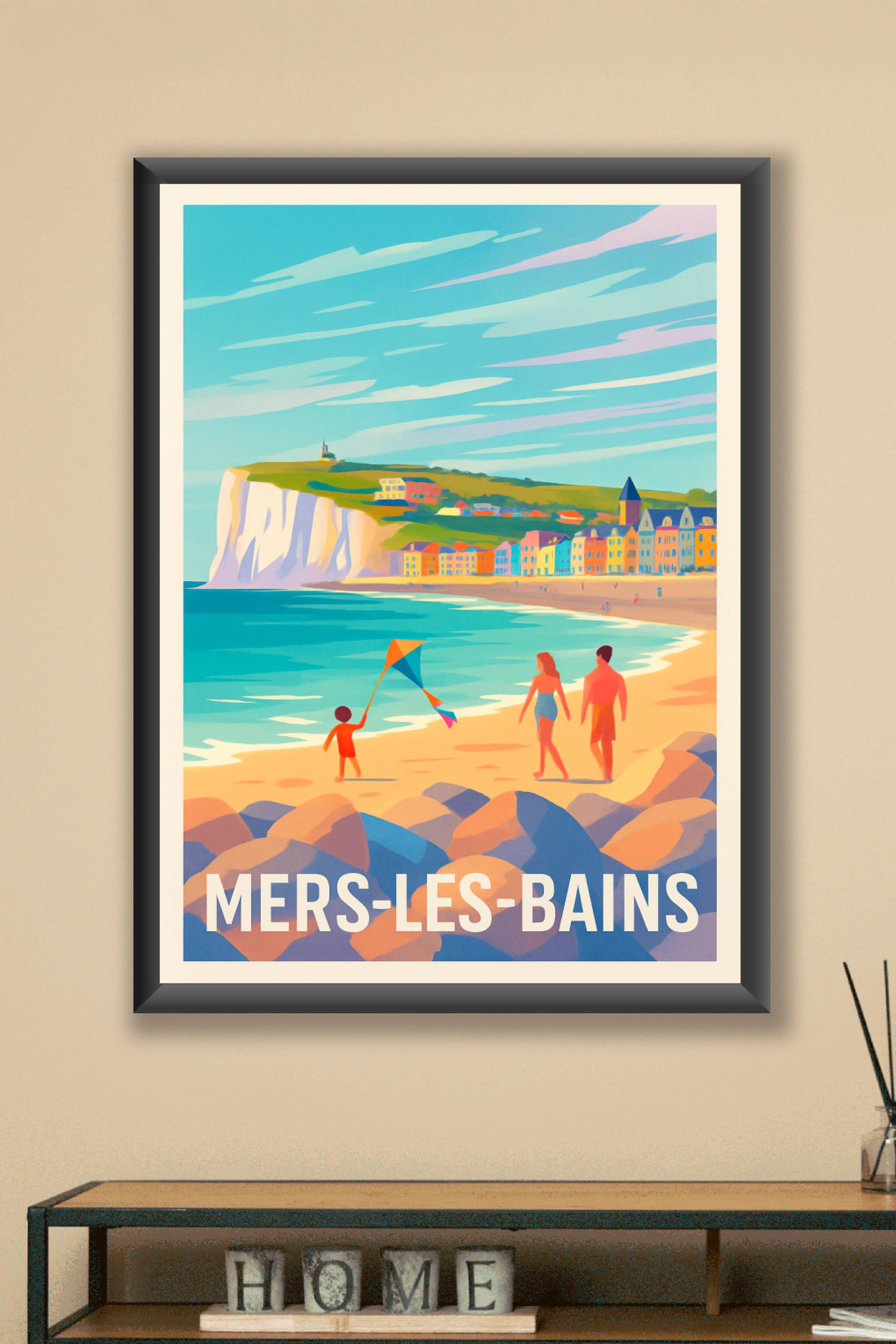 Découvrez l'atmosphère charmante et lumineuse de Mers-les-Bains avec cette affiche illustrée aux couleurs vives et au style rétro. Ce poster met en...