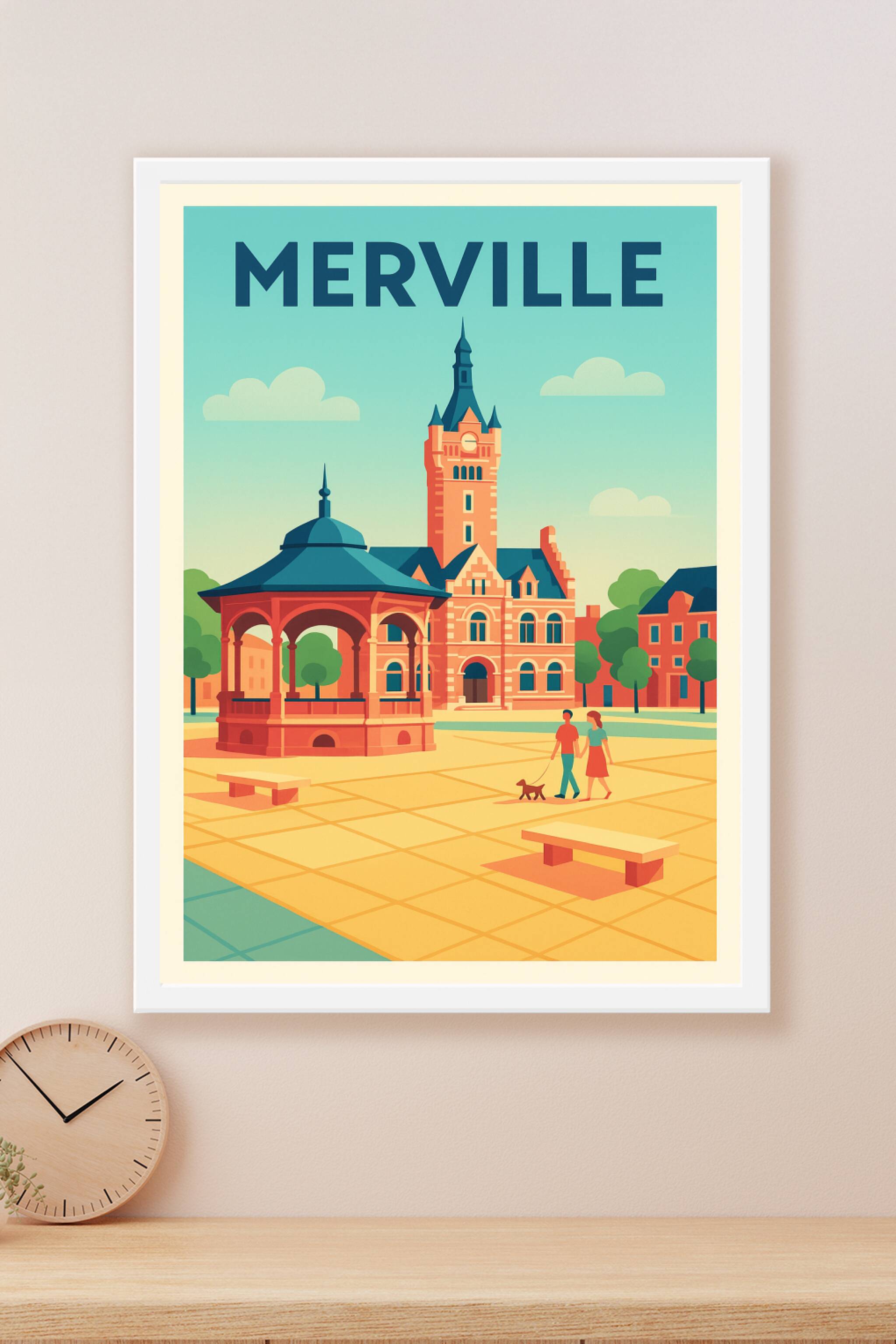 Découvrez l'élégance intemporelle de Merville à travers cette affiche illustrée au style rétro moderne. Cette scène paisible met en avant un lieu e...