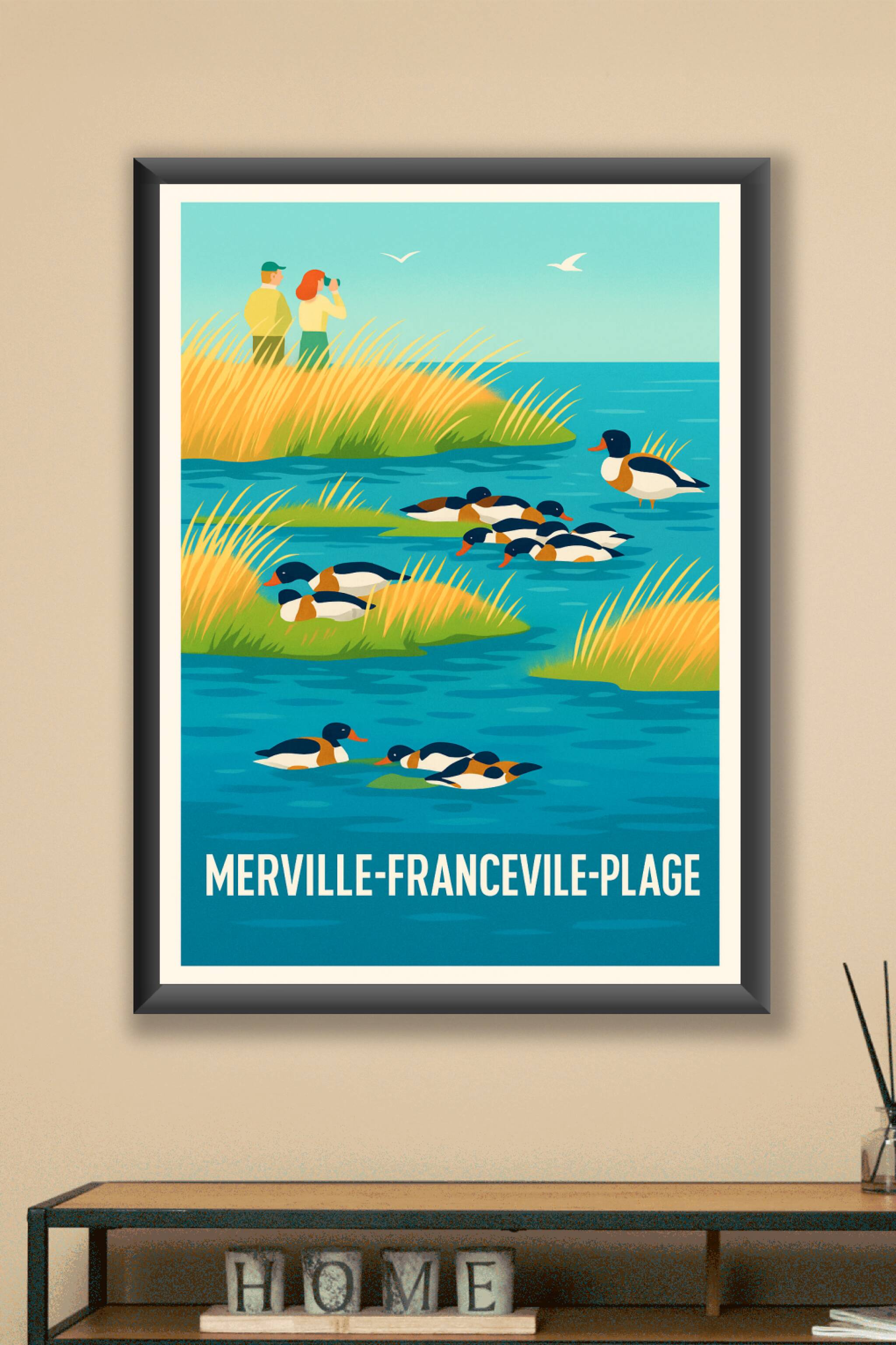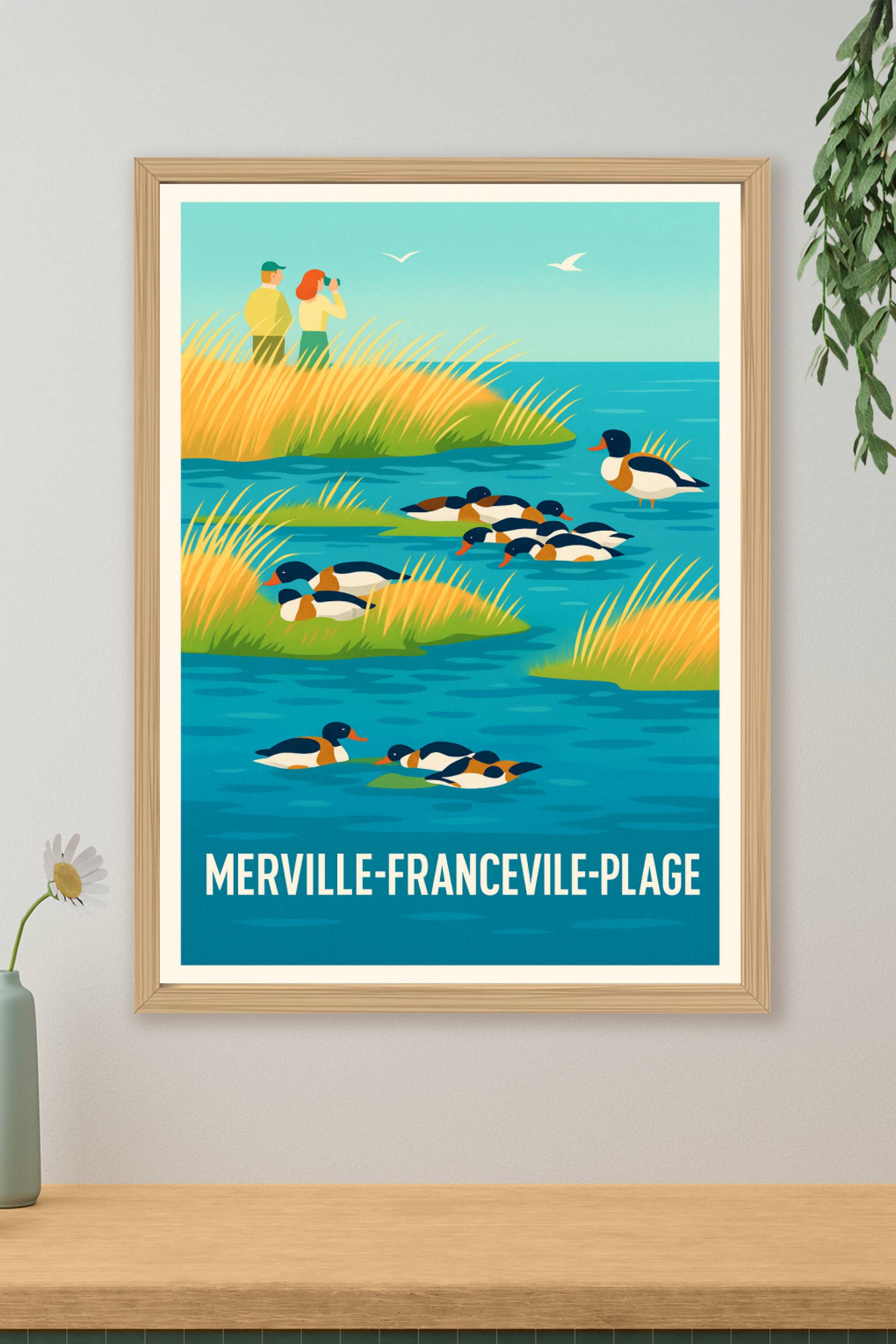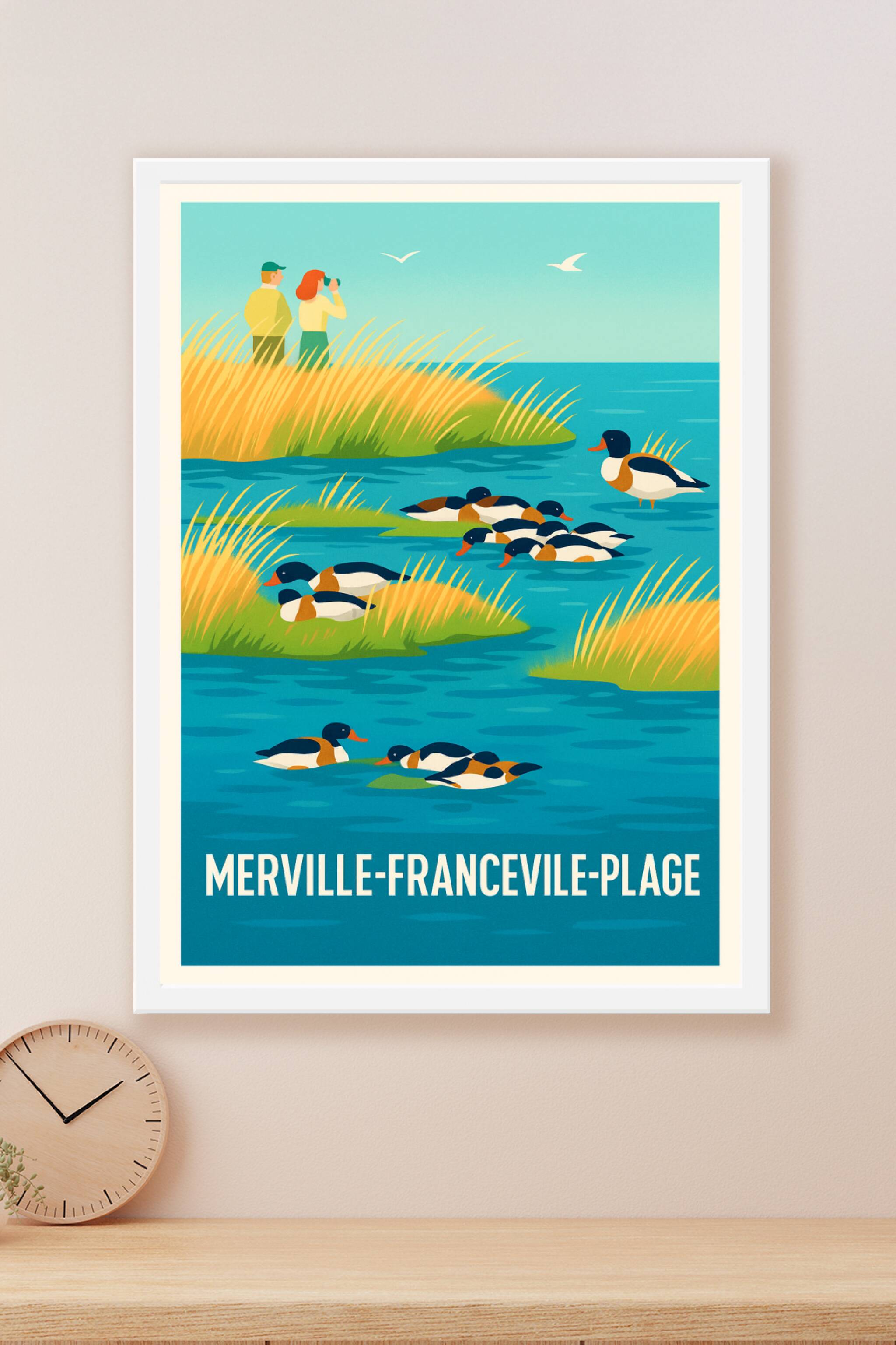 Découvrez la douceur de vivre à Merville-Franceville-Plage avec cette affiche illustrant un paisible paysage naturel où canards et roseaux se fonde...