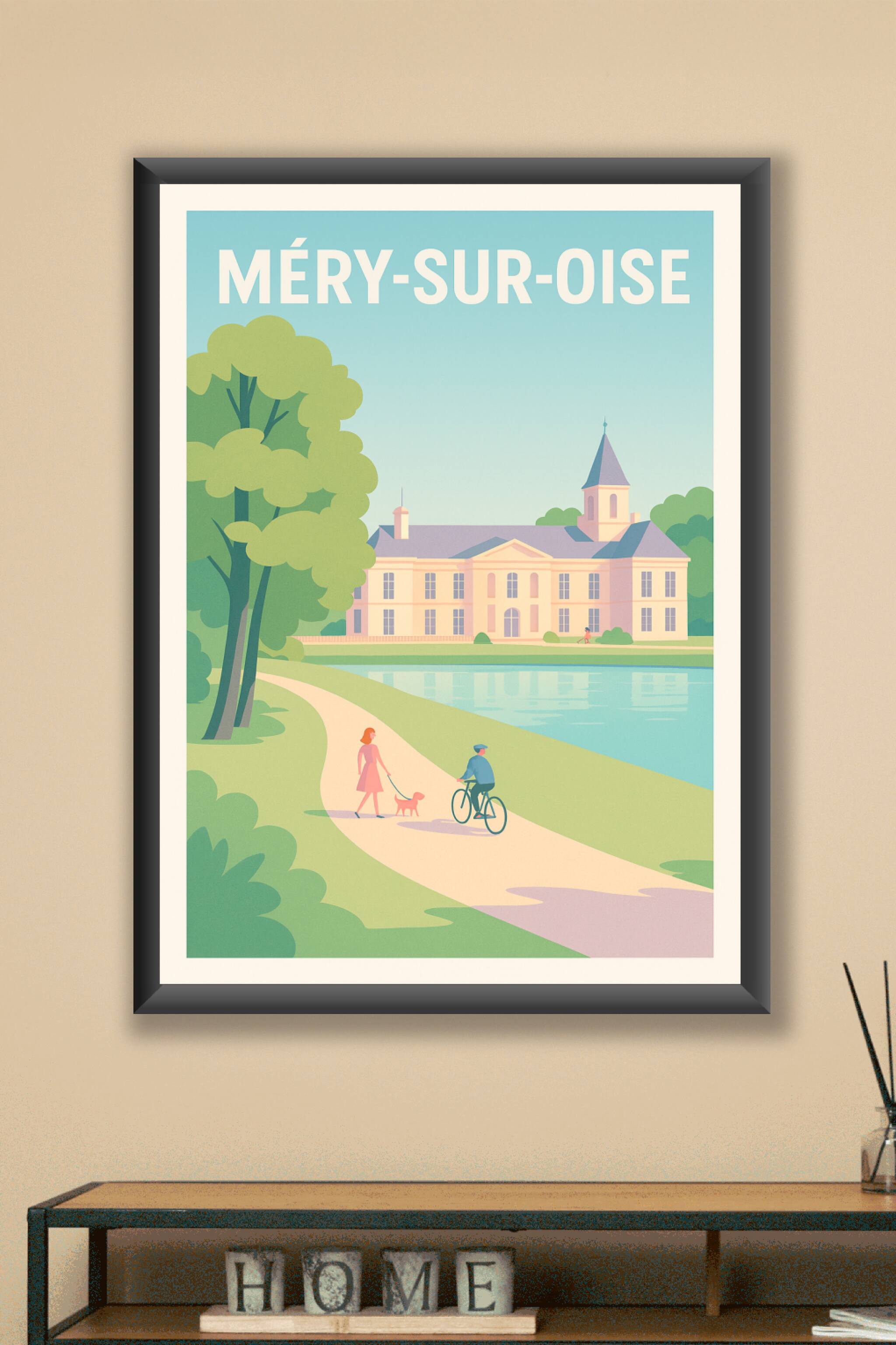 Découvrez la douceur de vivre à Méry-sur-Oise avec ce poster illustré représentant une promenade paisible au bord d'un étang, sur fond de château é...