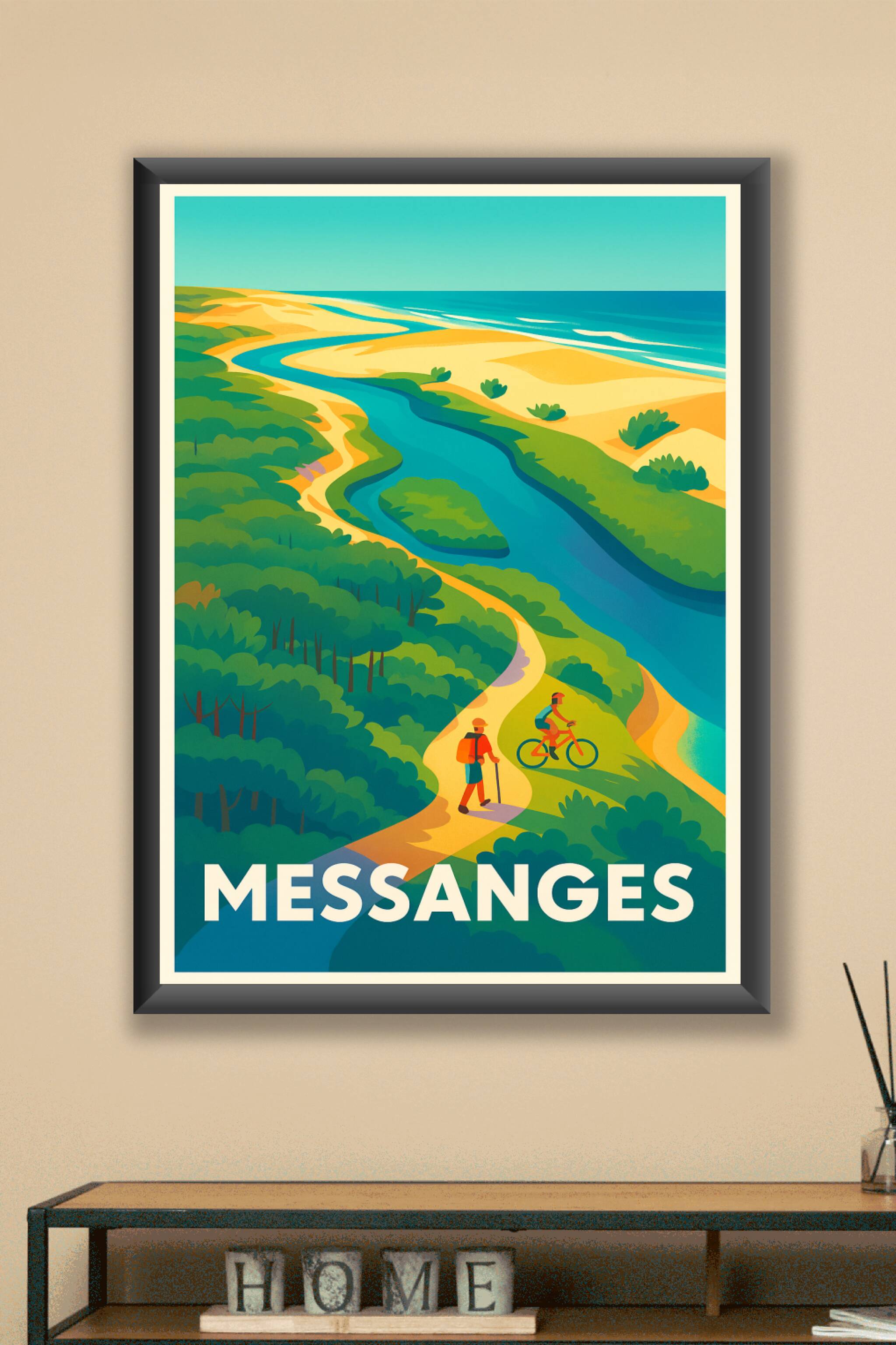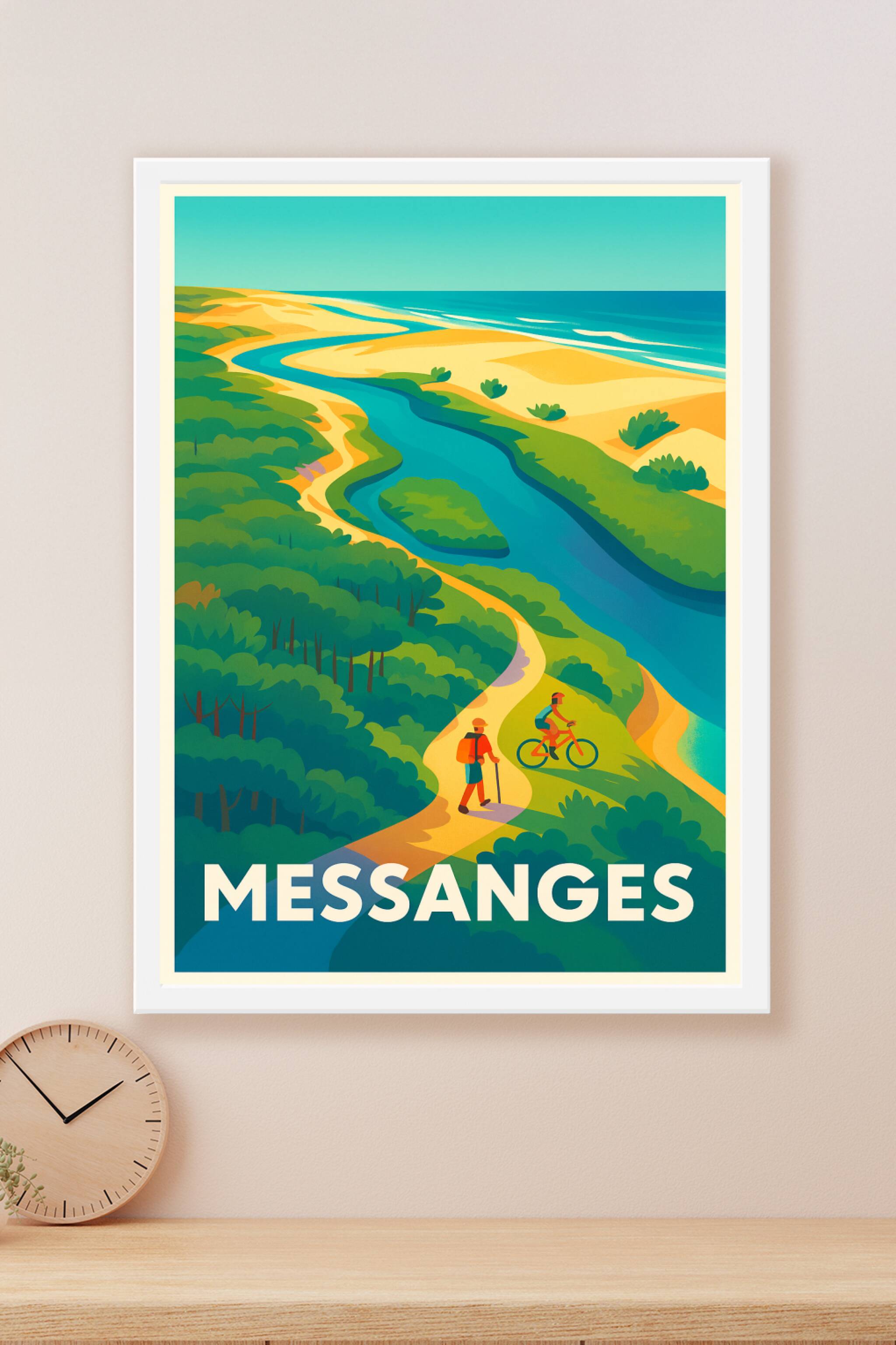Redécouvrez la beauté sauvage de Messanges à travers cette affiche vibrante qui met en scène les paysages entre forêts luxuriantes, dunes dorées et...