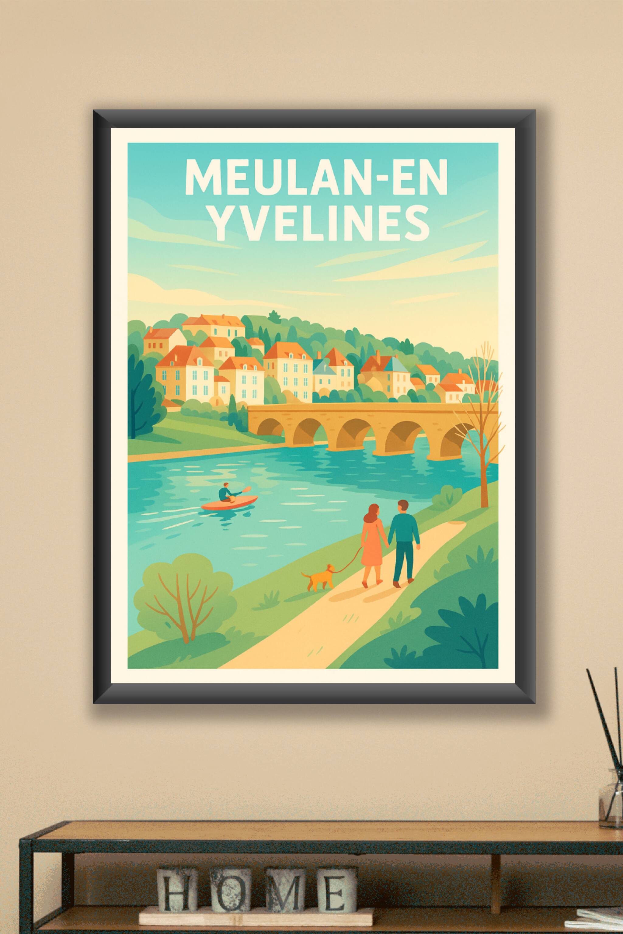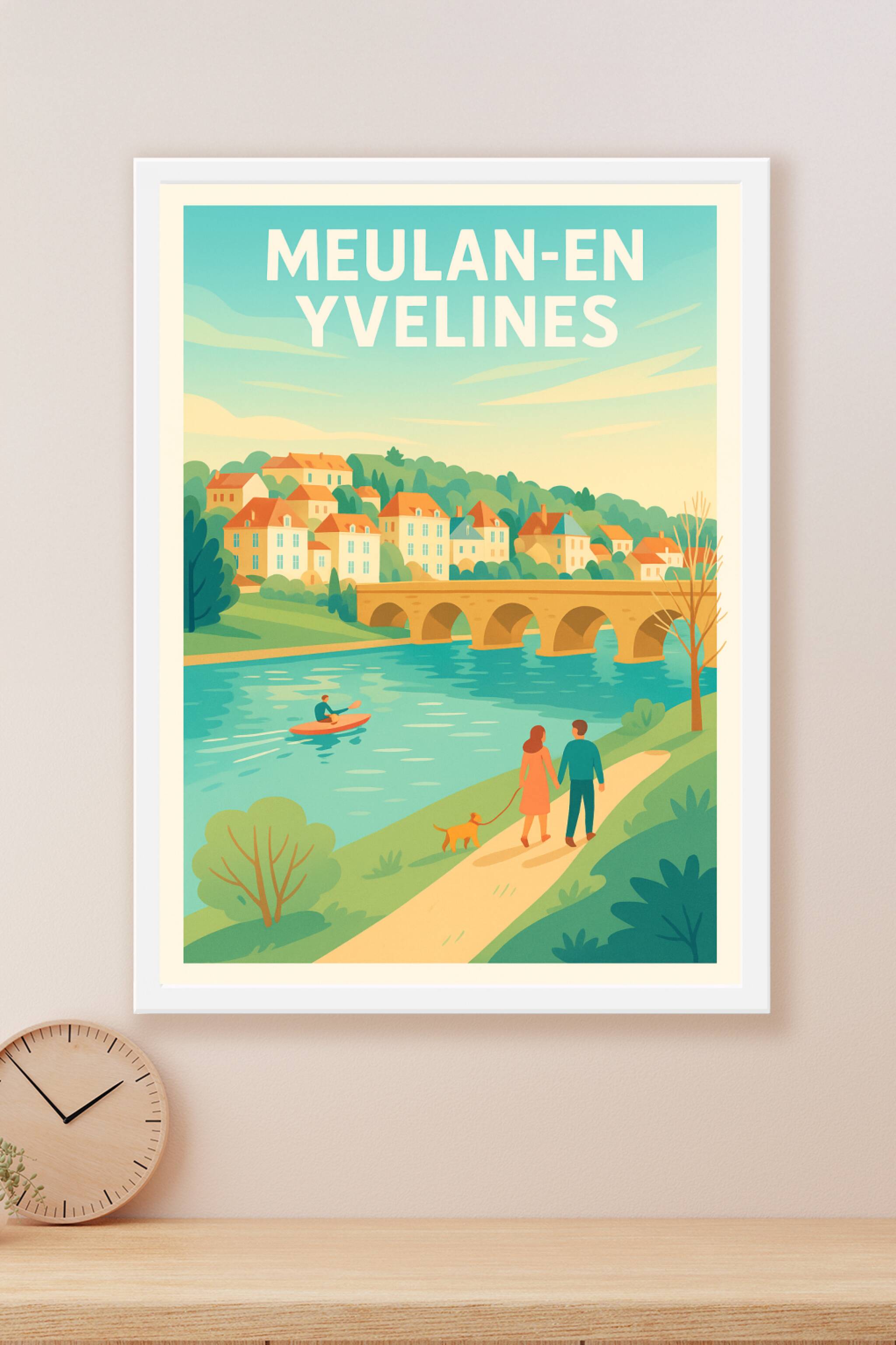 Découvrez le charme paisible de Meulan-en-Yvelines avec cette affiche illustrée au style vintage, qui met en scène un paysage bucolique entre riviè...