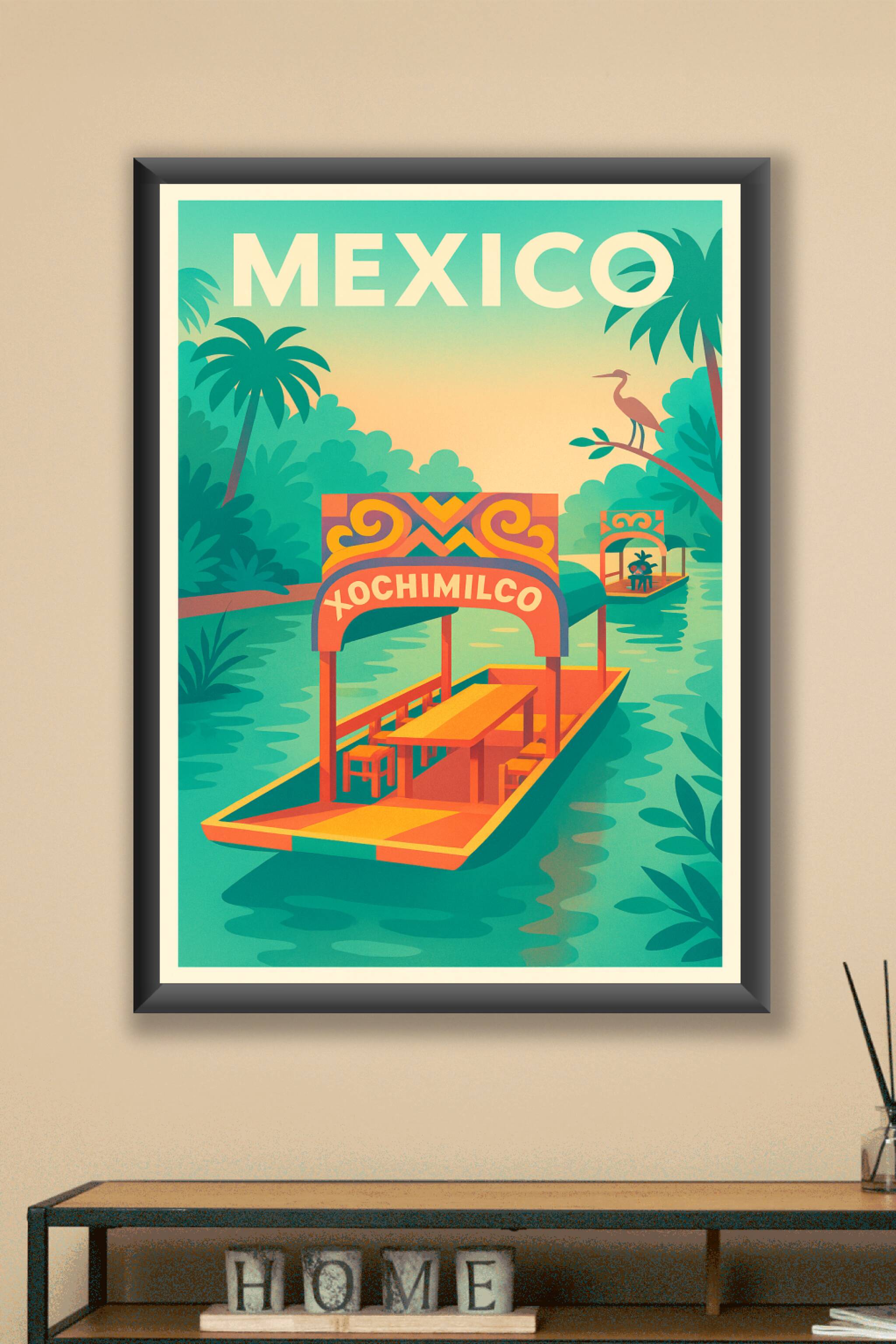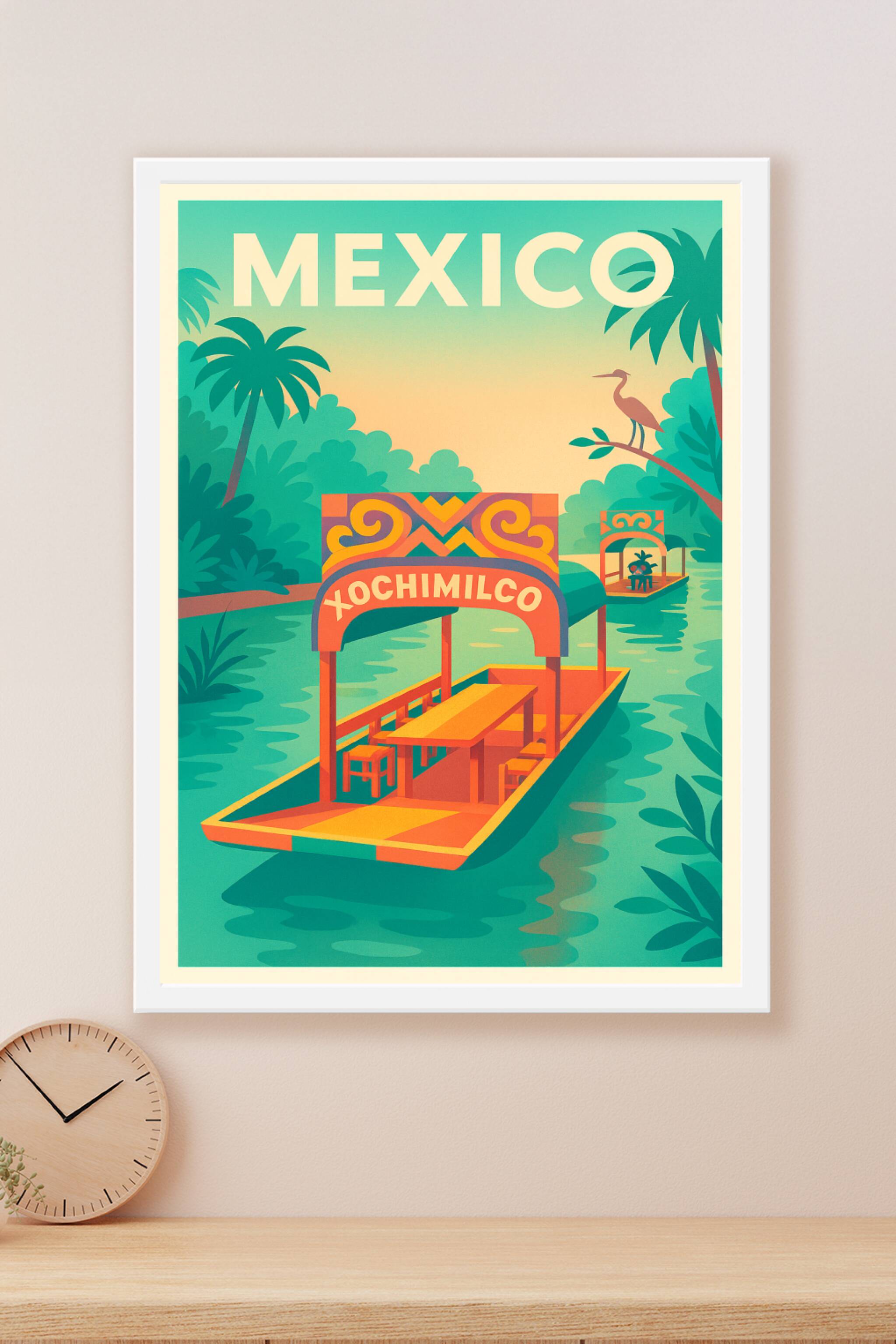 Découvrez la magie de Xochimilco à Mexico avec cette affiche au style vibrant et rétro, mettant en scène les fameuses trajineras colorées naviguant...