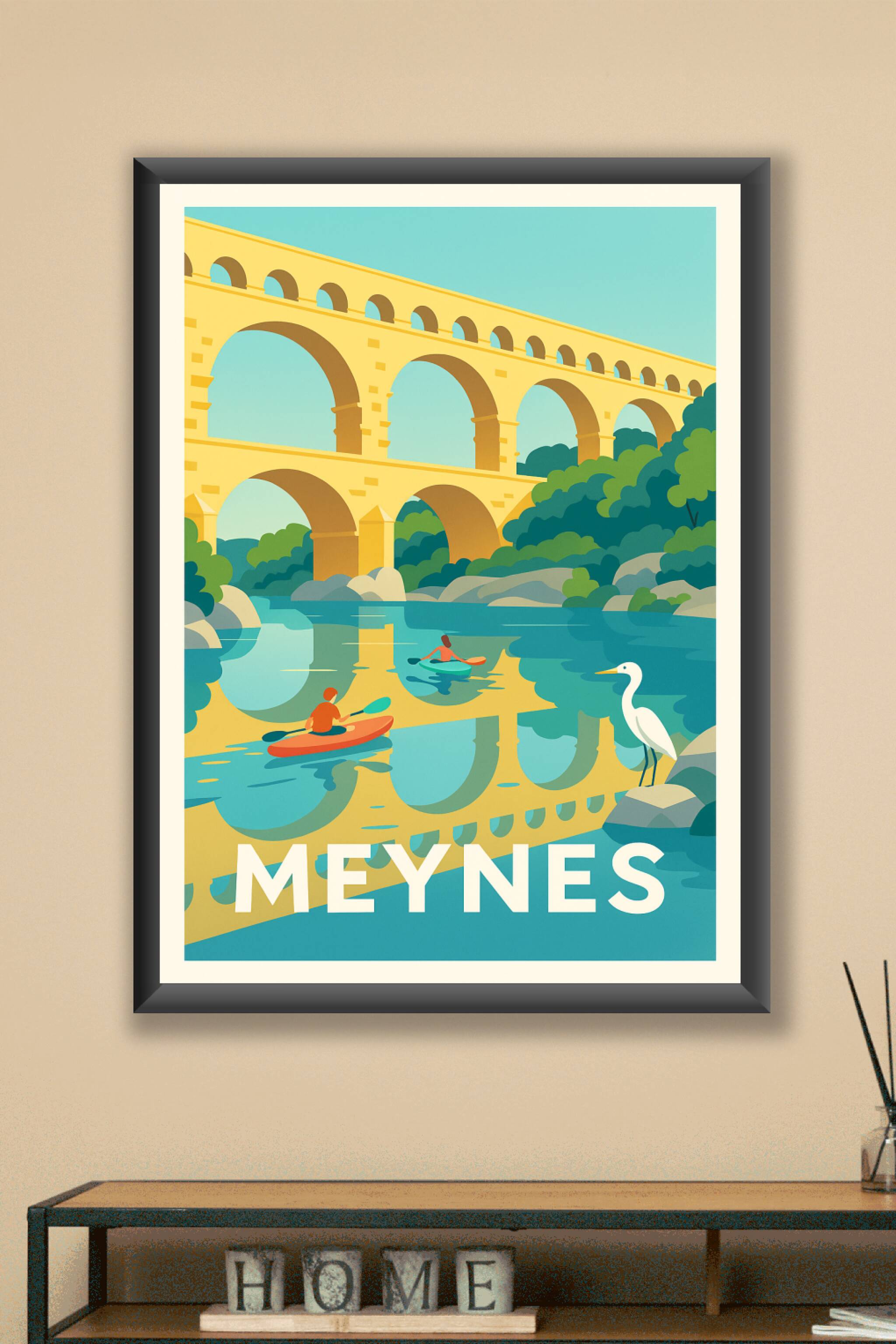 Découvrez la beauté paisible de Meynes avec cette affiche illustrée où le célèbre aqueduc se reflète dans une rivière calme, bercée par la présence de kayakistes et d'une élégante aigrette. Ce poster harmonieux capture l'essence d'une promenade en pleine nature, idéale pour apporter une touche de fraîcheur et de sérénité à votre décoration intérieure. Disponible en tirage "Fine Art" sur papier 305g coton de haute qualité, cette affiche est disponible en formats A1 à A4, avec ou sans cadre. Profitez de la finesse d'impression premium, 100% made in France, pour sublimer votre espace ou offrir un souvenir authentique de Meynes.