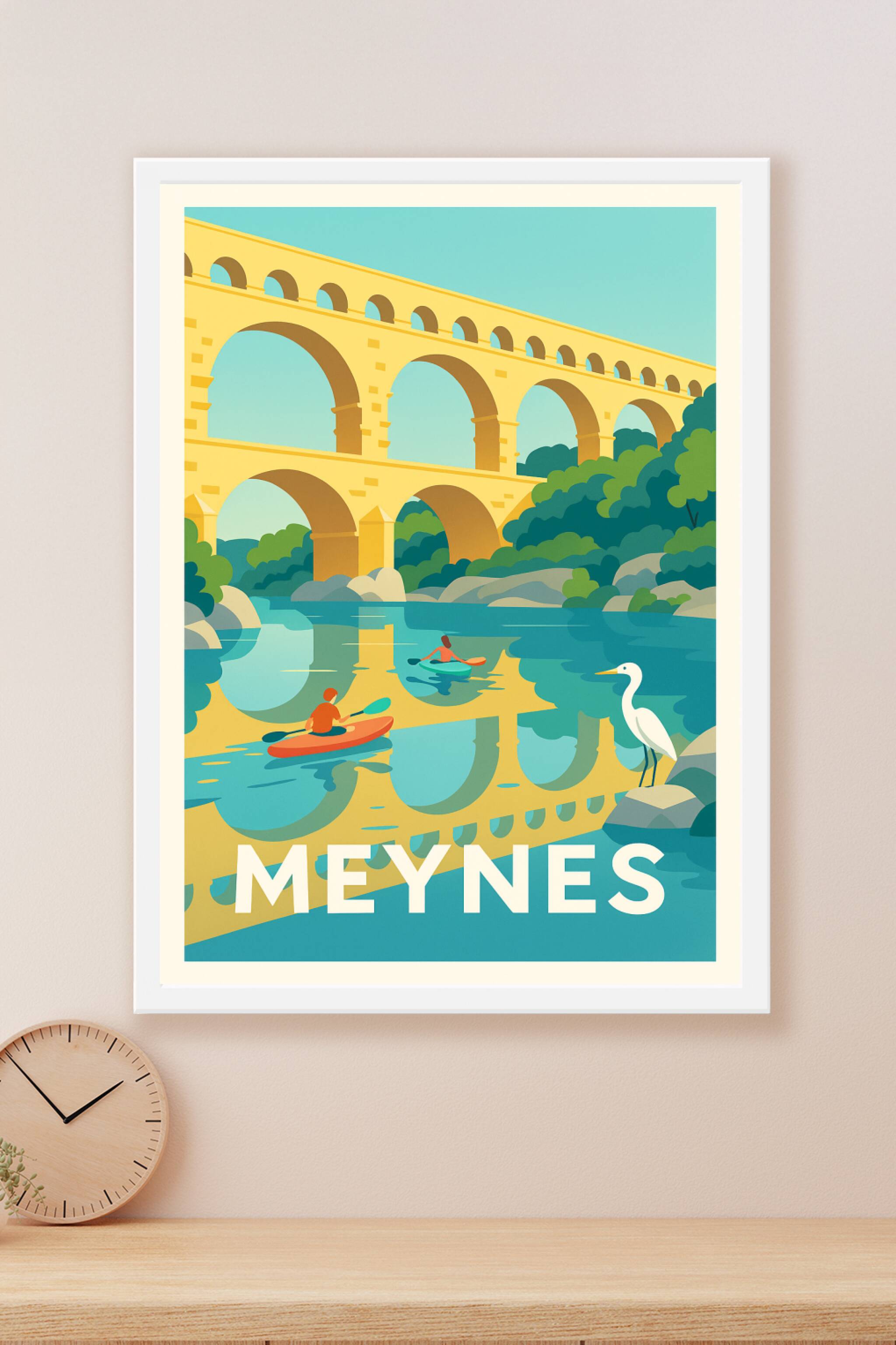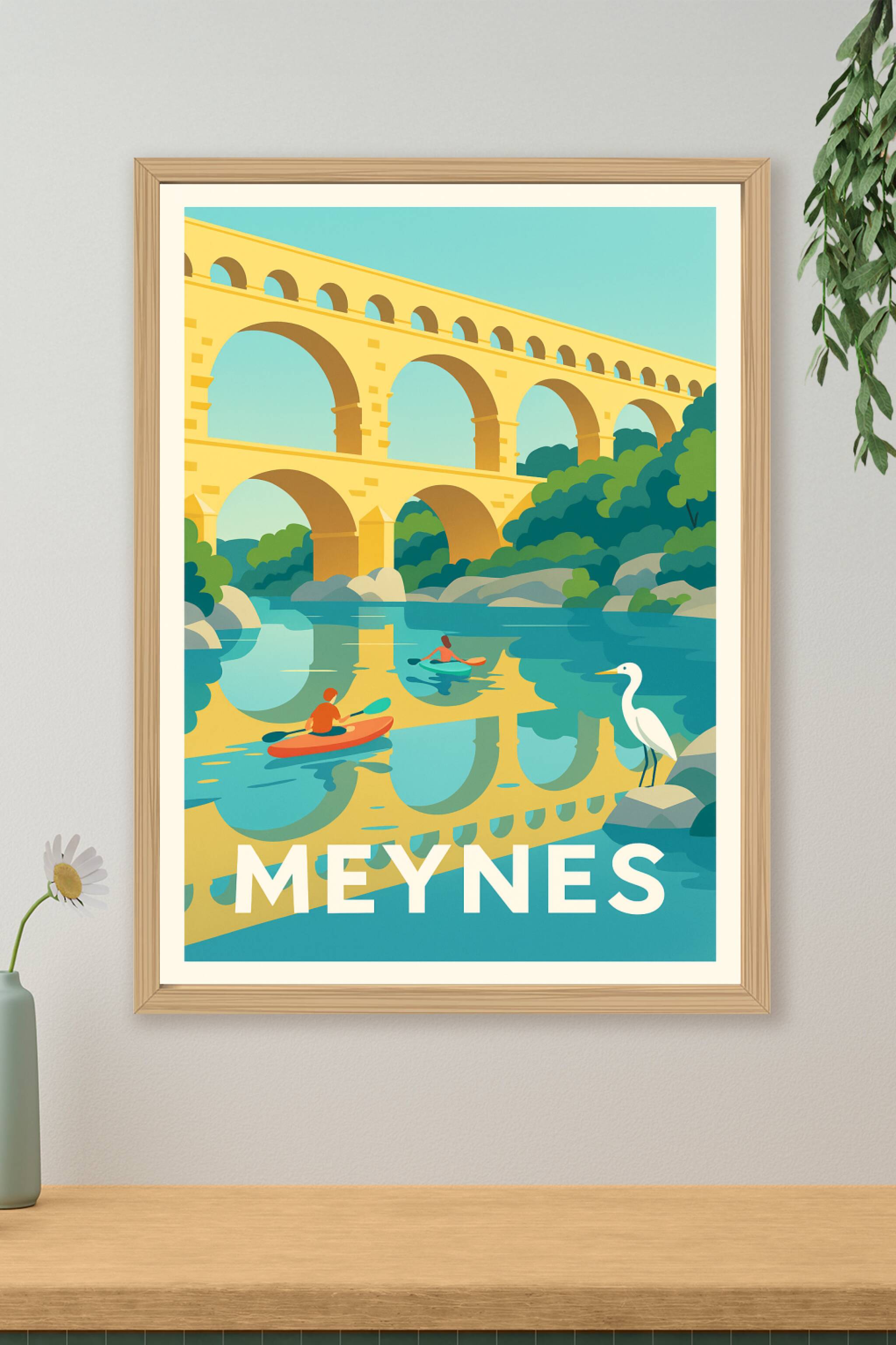 Découvrez la beauté paisible de Meynes avec cette affiche illustrée où le célèbre aqueduc se reflète dans une rivière calme, bercée par la présence...