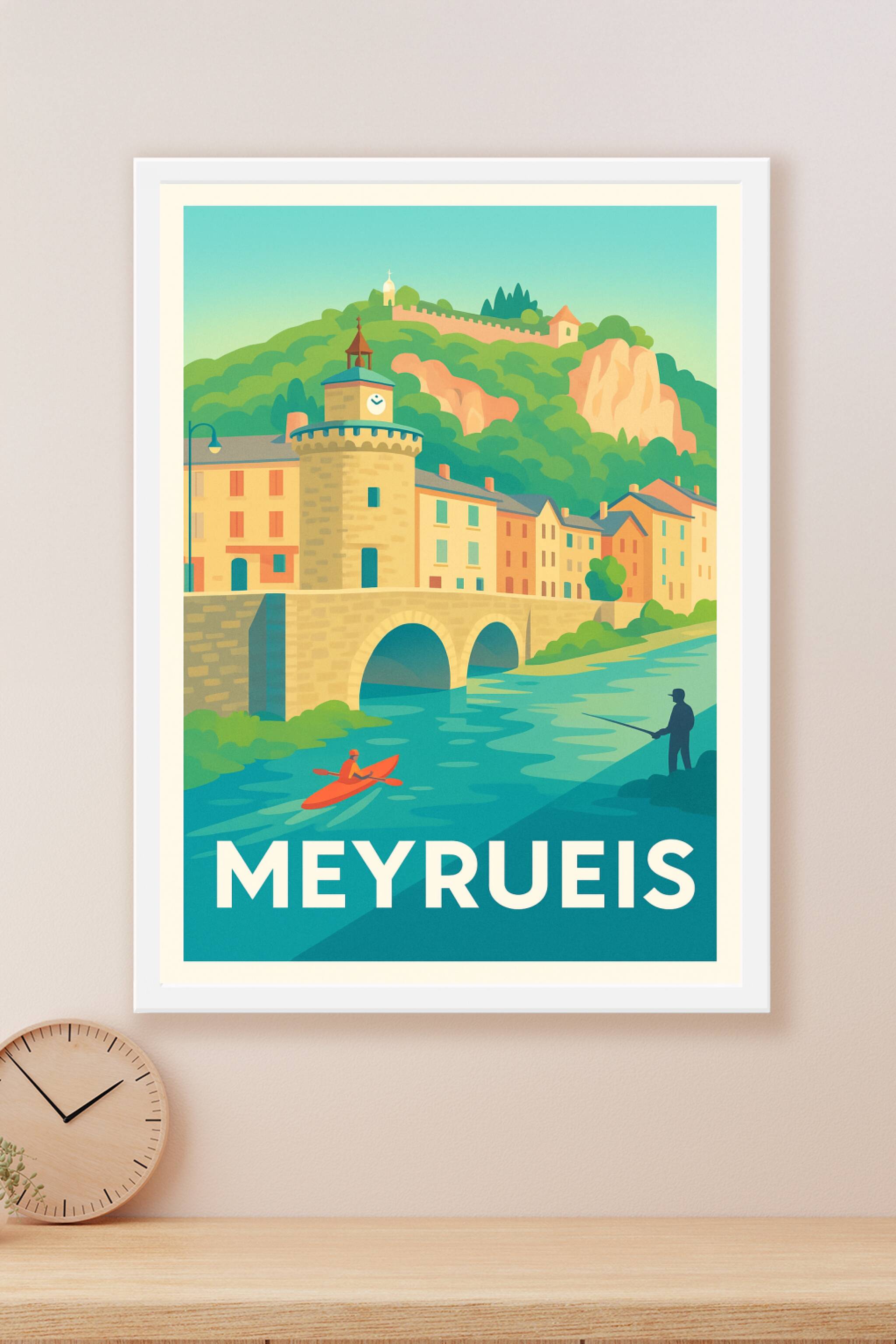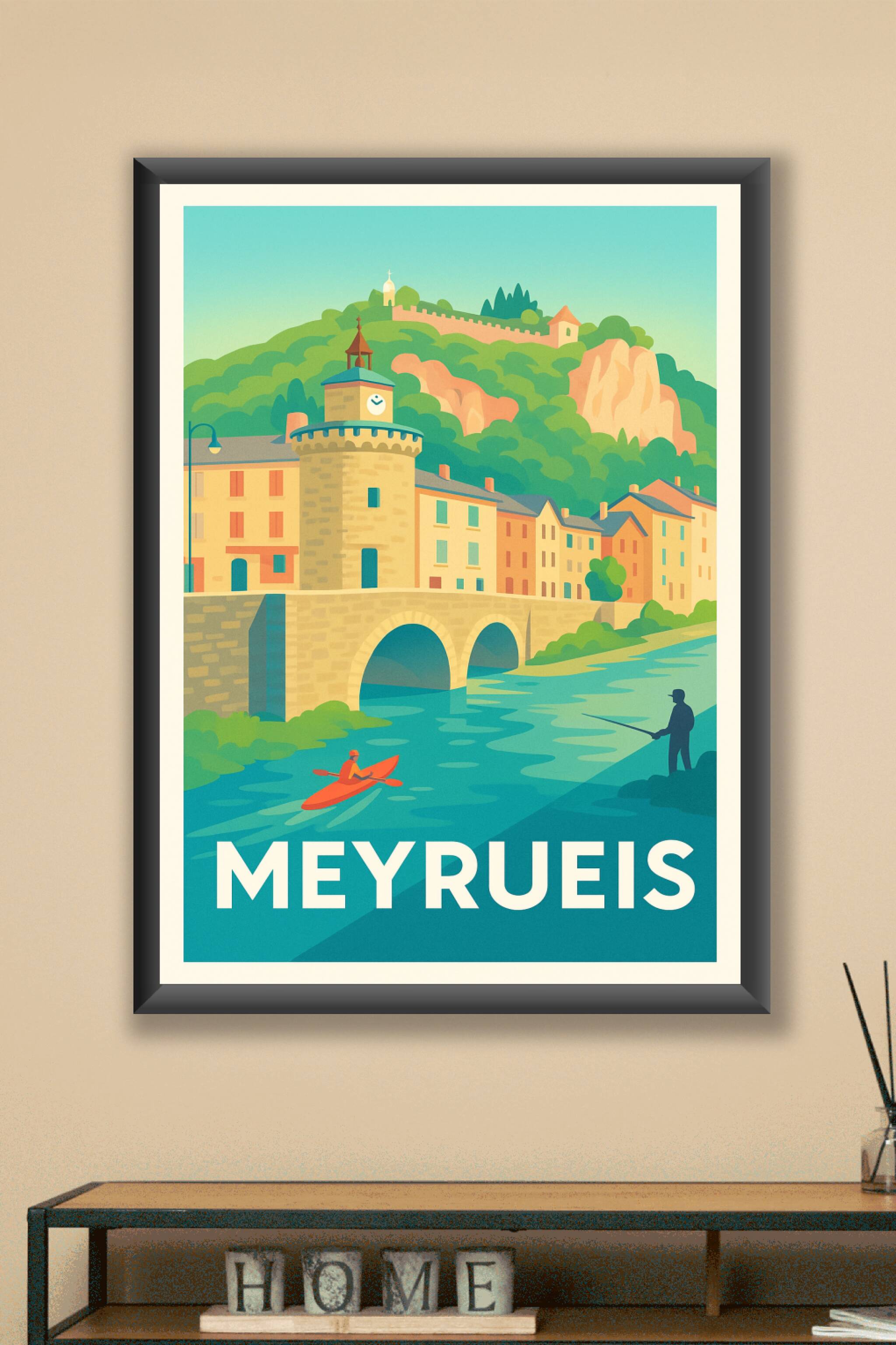 Découvrez la douceur de vivre de Meyrueis avec cette affiche illustrée mettant en scène son pont emblématique et les maisons colorées bordant la rivière, dans un décor de montagnes verdoyantes. Ce poster évoque à la fois la tranquillité des activités de plein air et le riche patrimoine architectural de cette charmante ville du sud de la France. Imprimée en tirage "Fine Art" sur un papier 305g coton, cette affiche offre une qualité d'impression exceptionnelle, aux couleurs vives et durables. Disponible en formats A1 à A4, avec ou sans cadre, ce poster est parfait pour apporter une touche d'authenticité et de sérénité à votre décoration intérieure ou pour offrir un souvenir raffiné de Meyrueis.