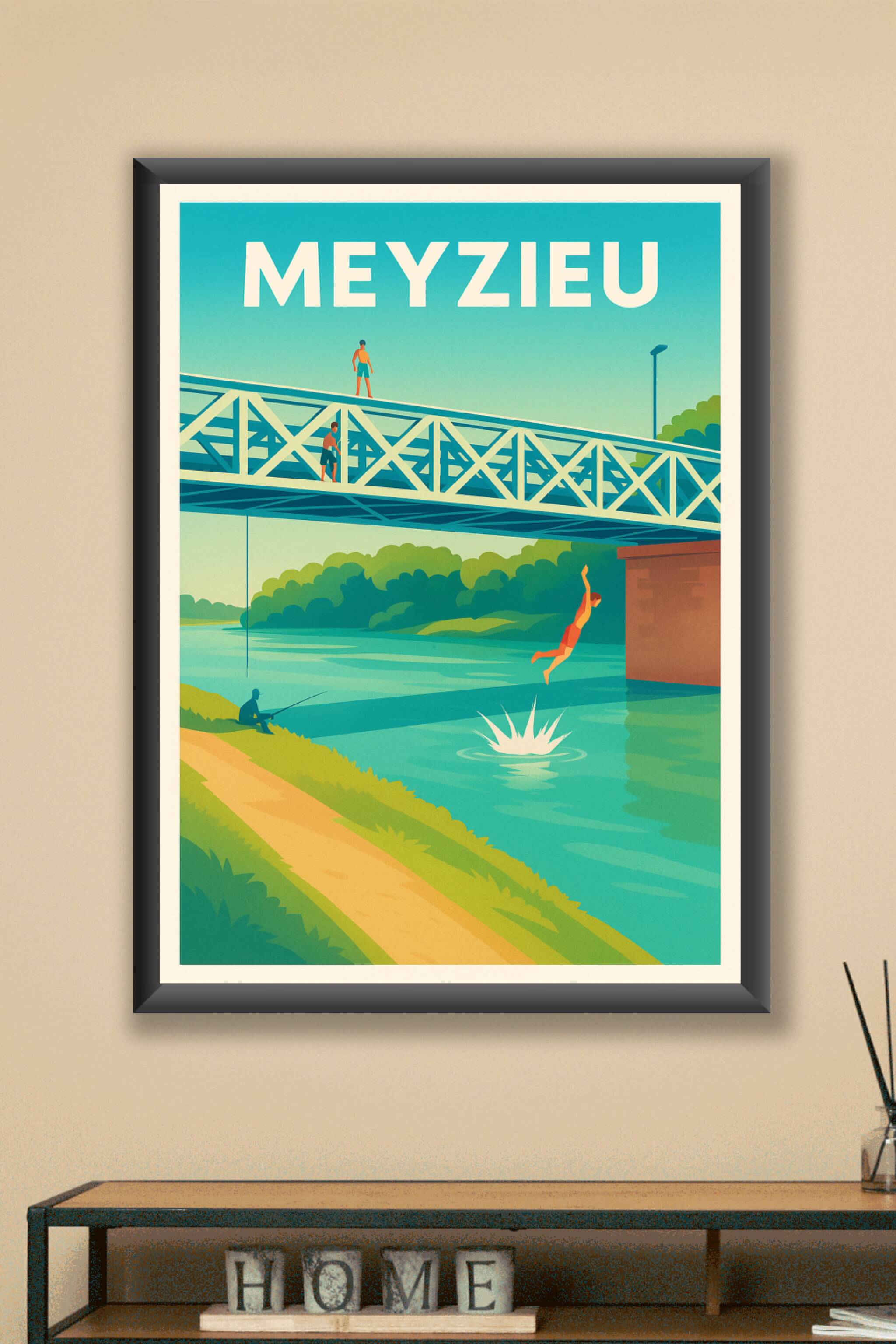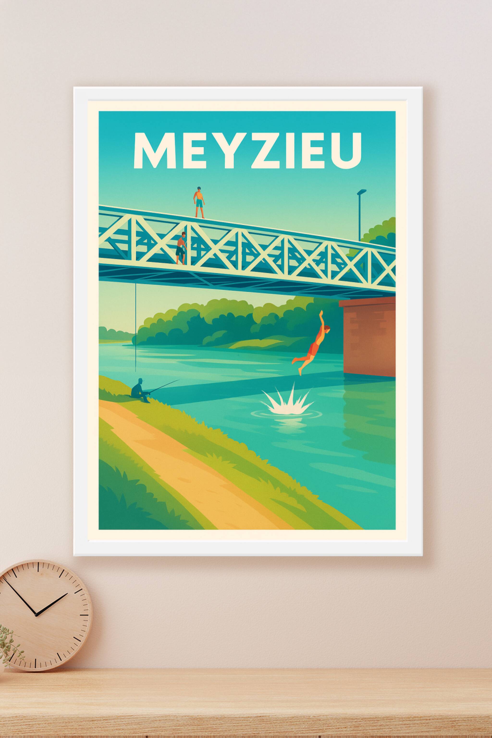 Découvrez la douceur et la fraîcheur des bords du Rhône à Meyzieu avec cette affiche illustrée au style vintage et lumineux. Représentant des jeunes plongeant depuis un pont, cette scène capture un moment d'insouciance et de joie estivale.Ce poster est imprimé en tirage "Fine Art" sur papier 305g coton, garantissant une qualité d'impression exceptionnelle, des couleurs éclatantes et une longévité optimale. Disponible en formats A1 à A4, avec ou sans cadre, cette affiche se révèle idéale pour apporter une touche de fraîcheur et de dynamisme à votre décoration intérieure.Profitez d'une fabrication 100% française pour offrir ou vous offrir un souvenir unique de Meyzieu.