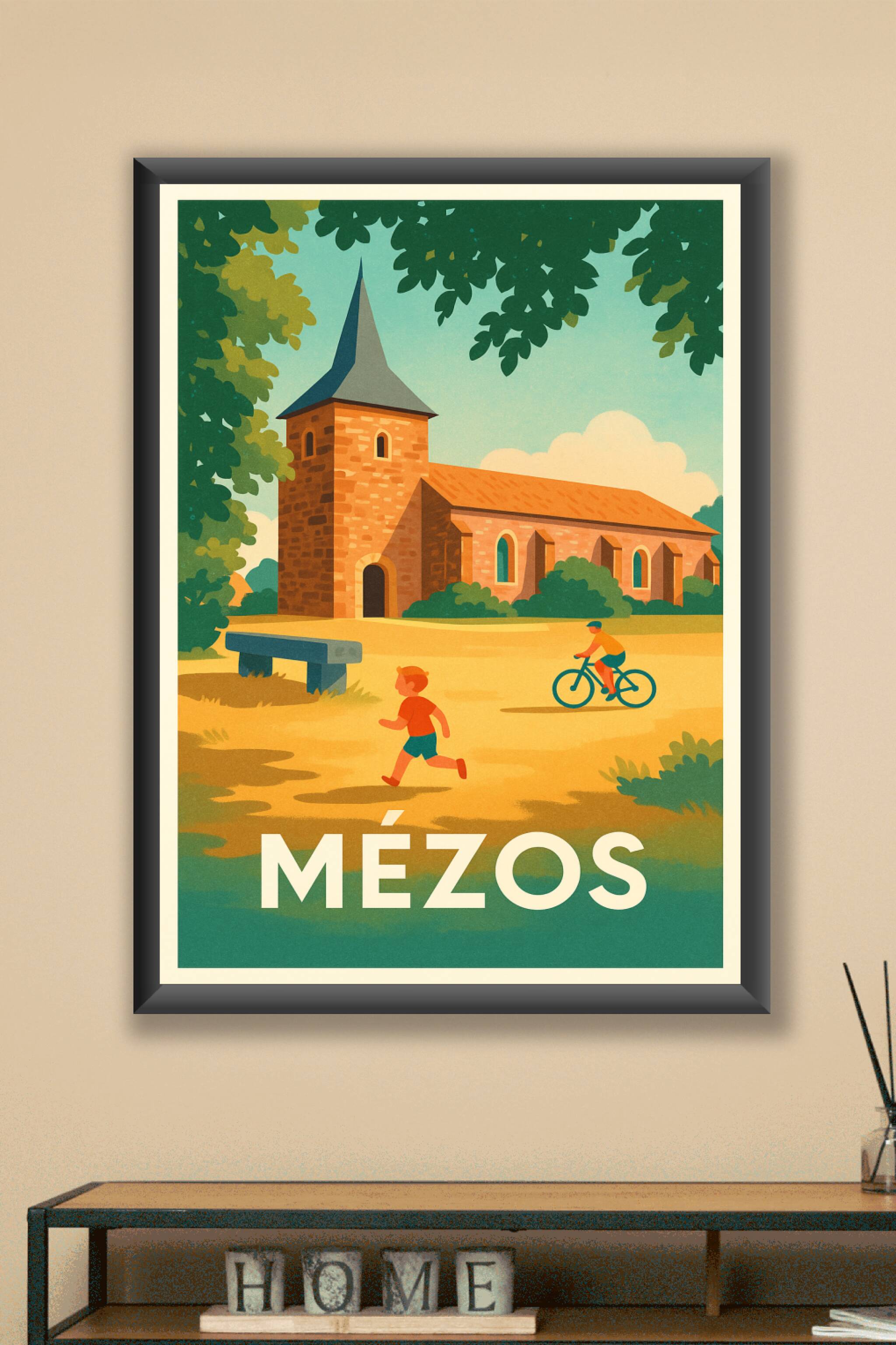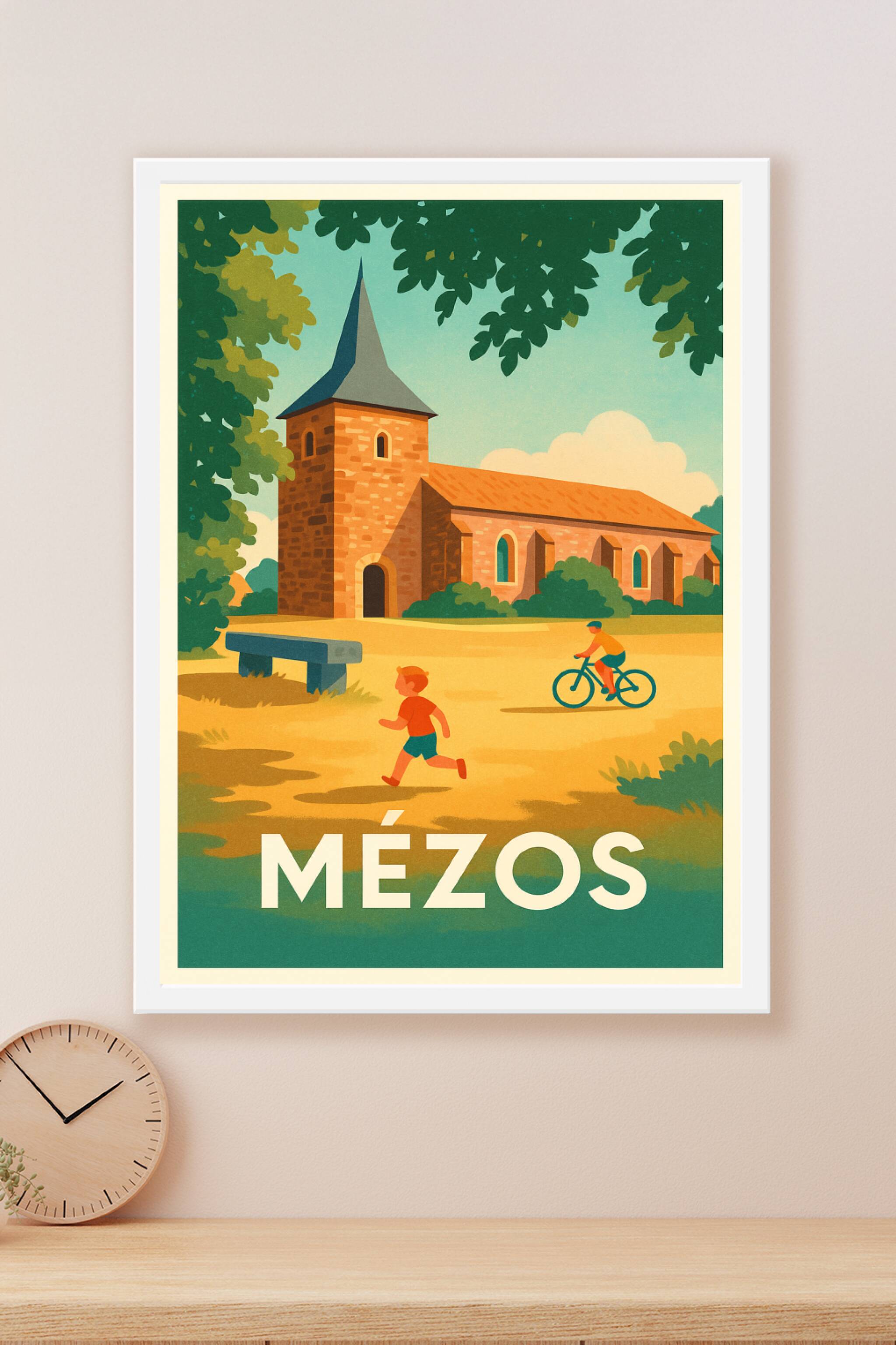 Découvrez l'atmosphère paisible et bucolique de Mézos avec cette affiche illustrée aux couleurs chaudes et apaisantes mettant en scène l'église de ...