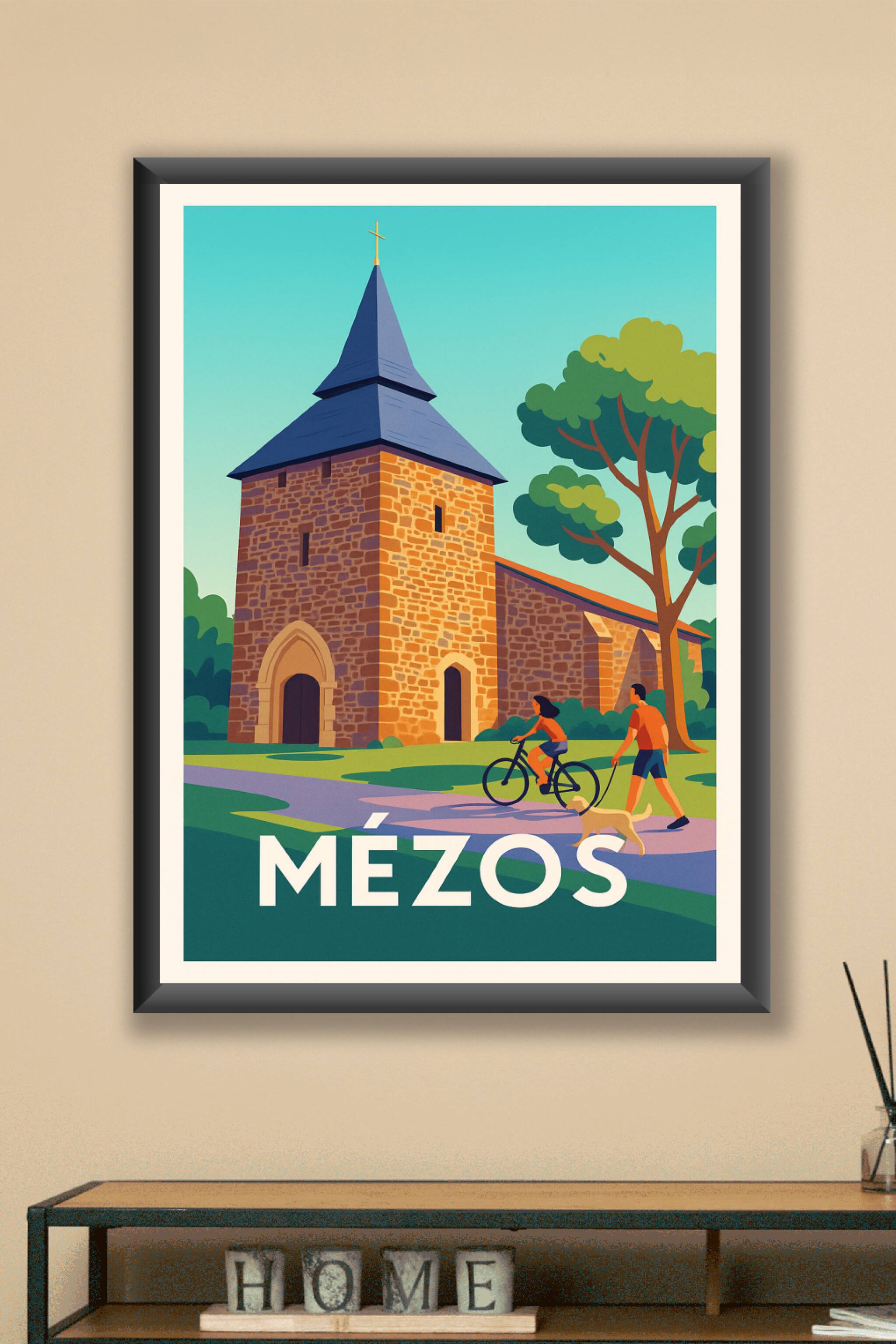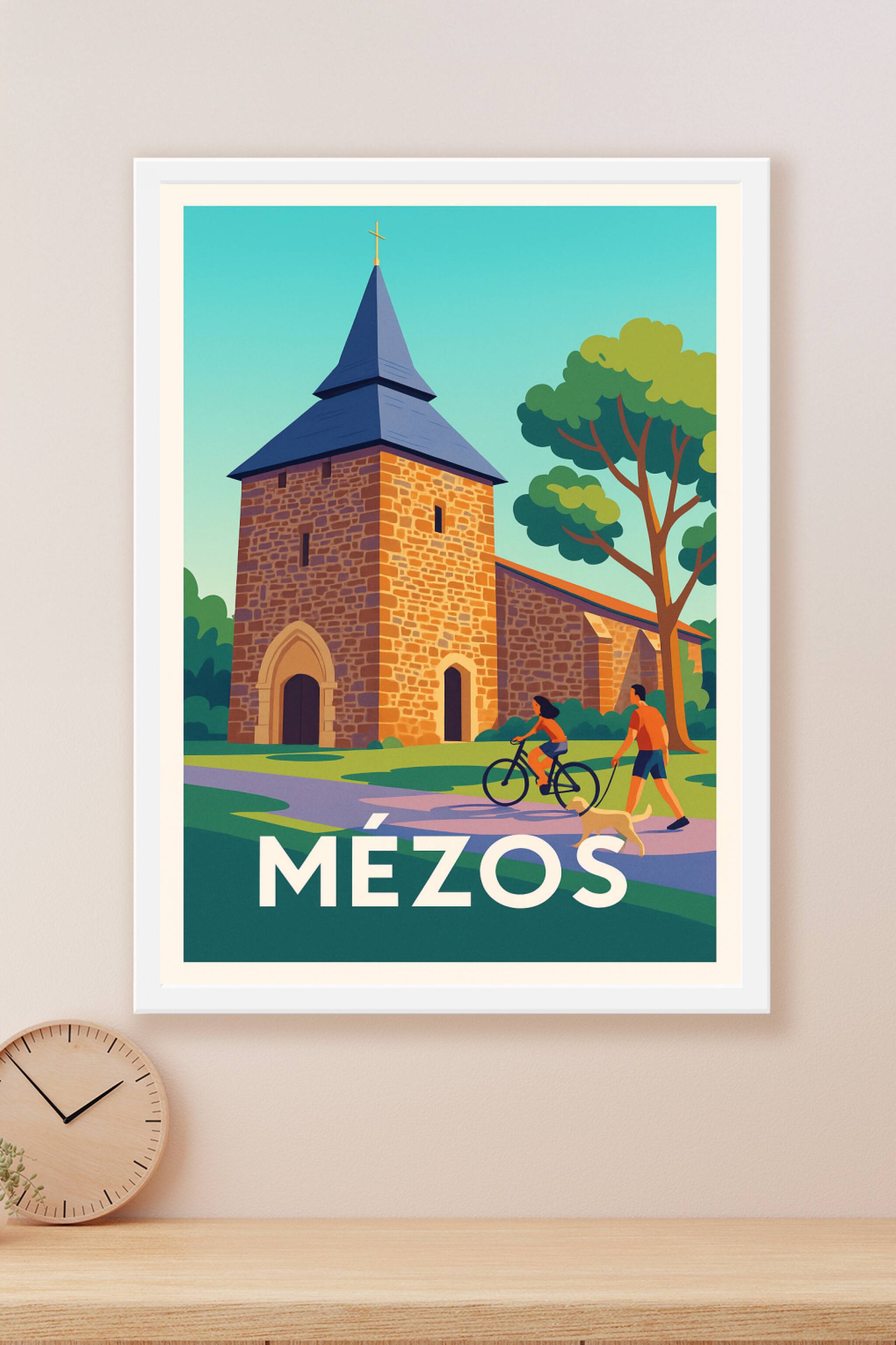 Découvrez la sérénité et le charme rustique de Mézos avec ce poster illustré mettant en scène son architecture traditionnelle et son ambiance paisi...