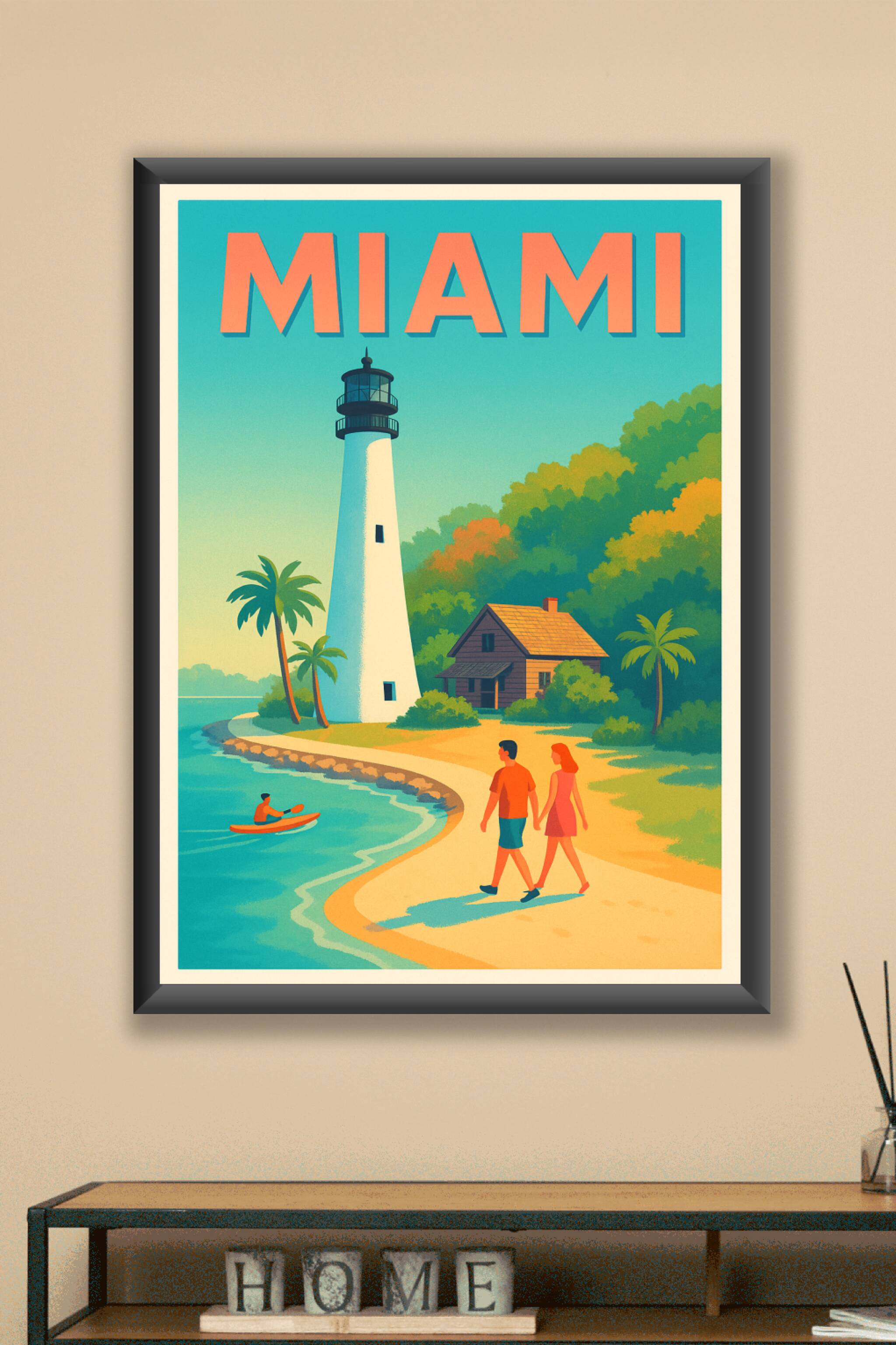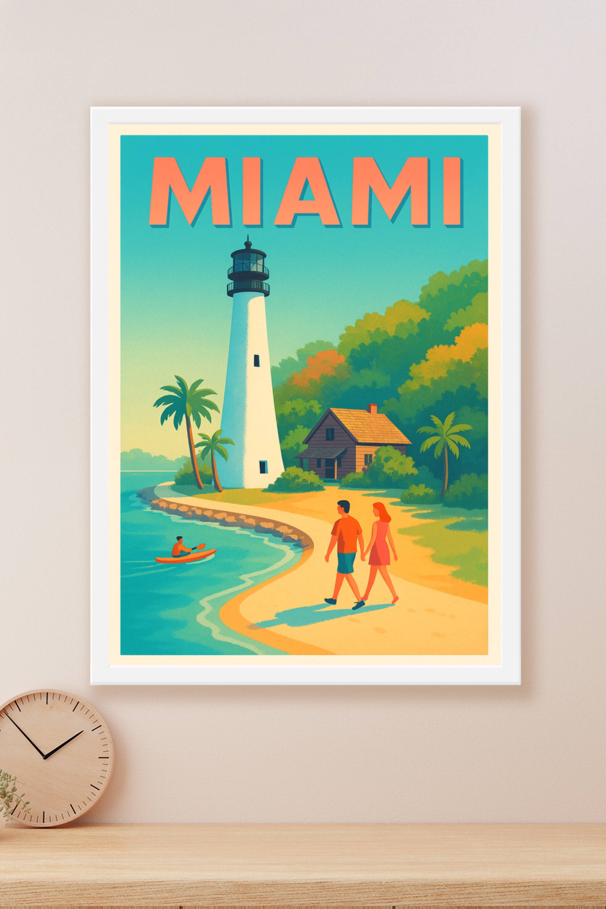 Imprégnez-vous de la douceur de vivre de Miami avec cette affiche au style vintage illustrant une scène paisible au bord de l'eau, où se dressent u...