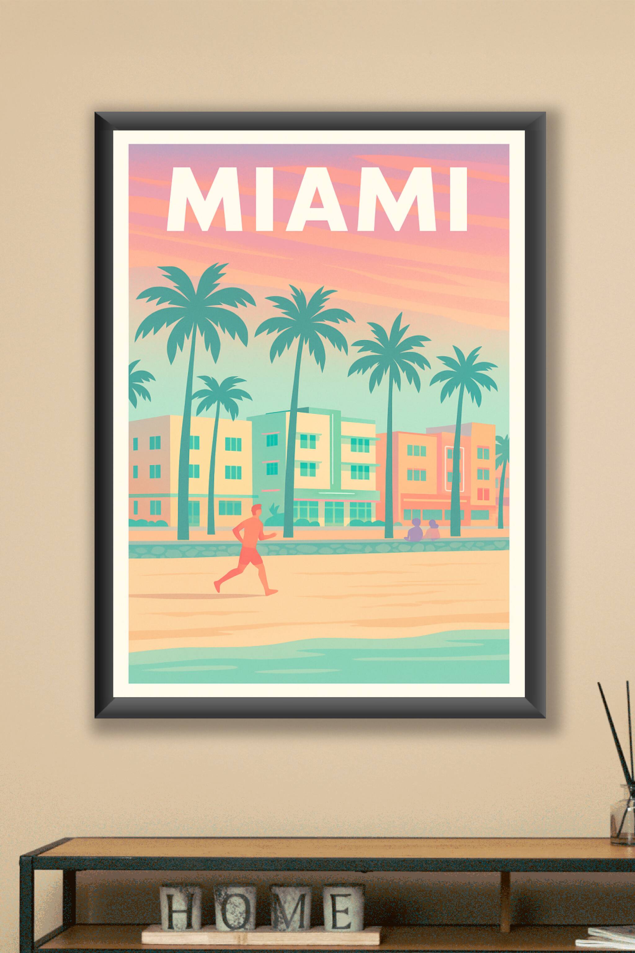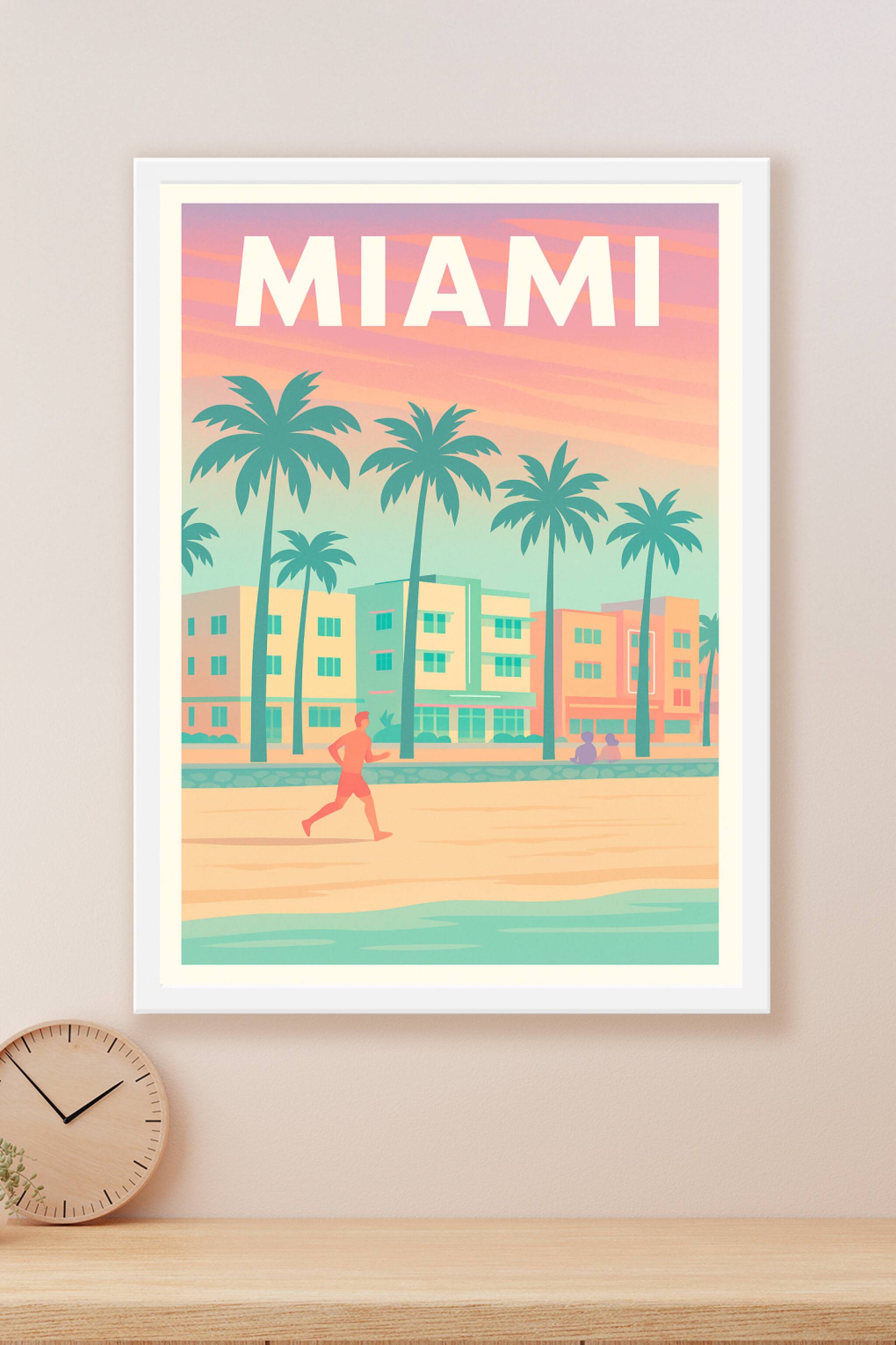 Découvrez l'ambiance unique de Miami avec cette affiche au style vintage évoquant les célèbres plages bordées de palmiers et d'architecture art déc...