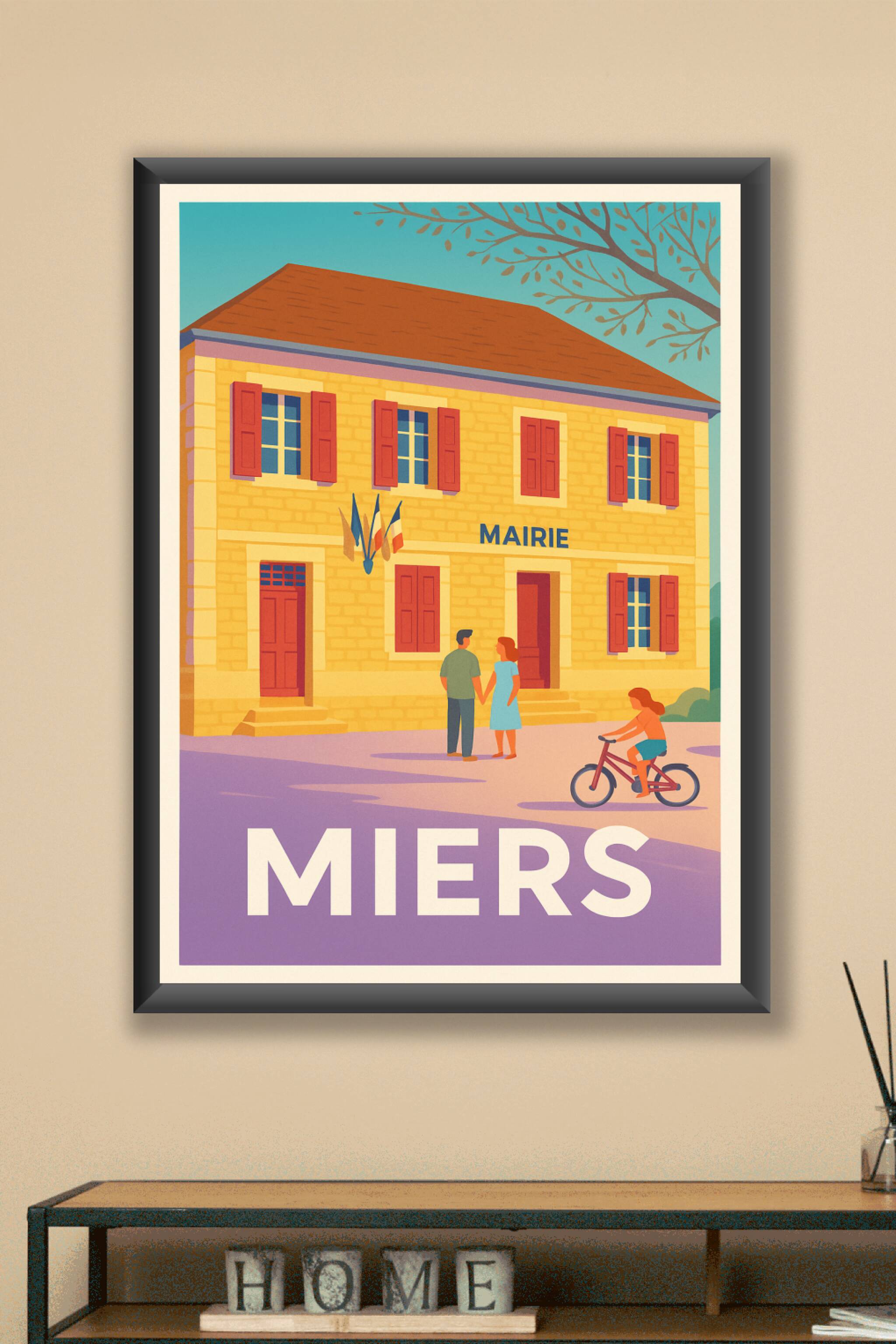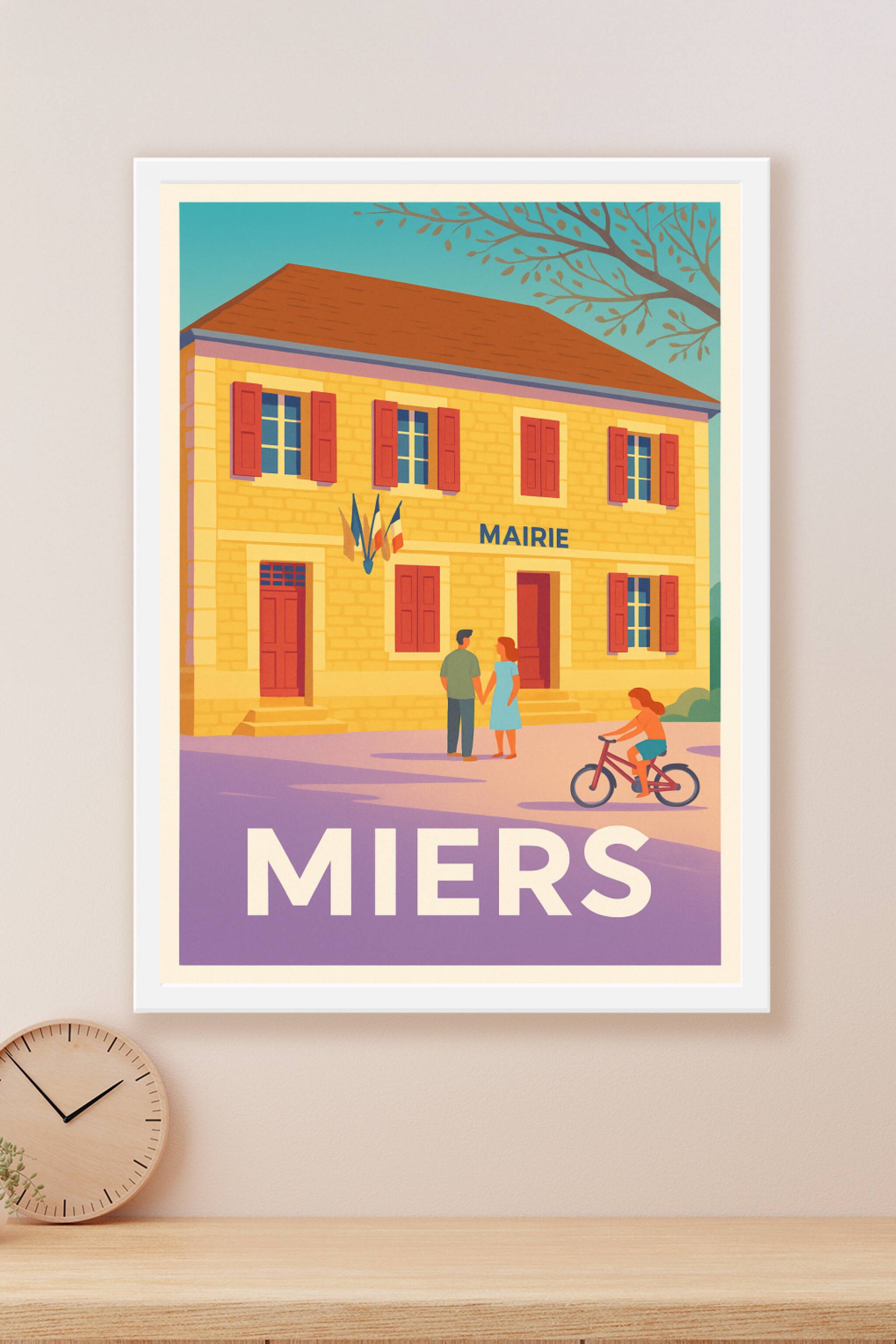 Découvrez cette affiche illustrant la mairie de Miers, un symbole chaleureux de l'authenticité rurale française. Ce poster au design épuré et color...