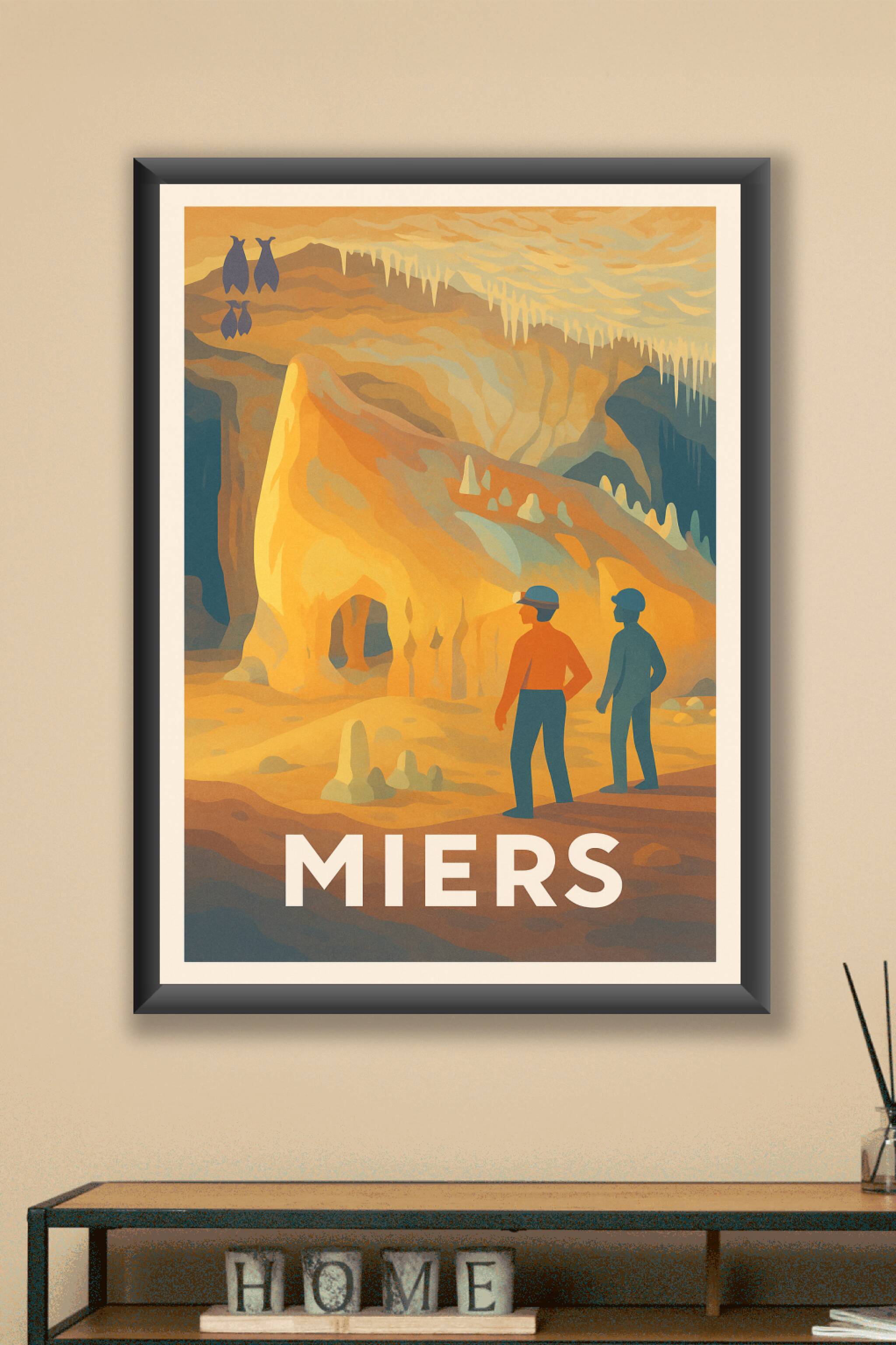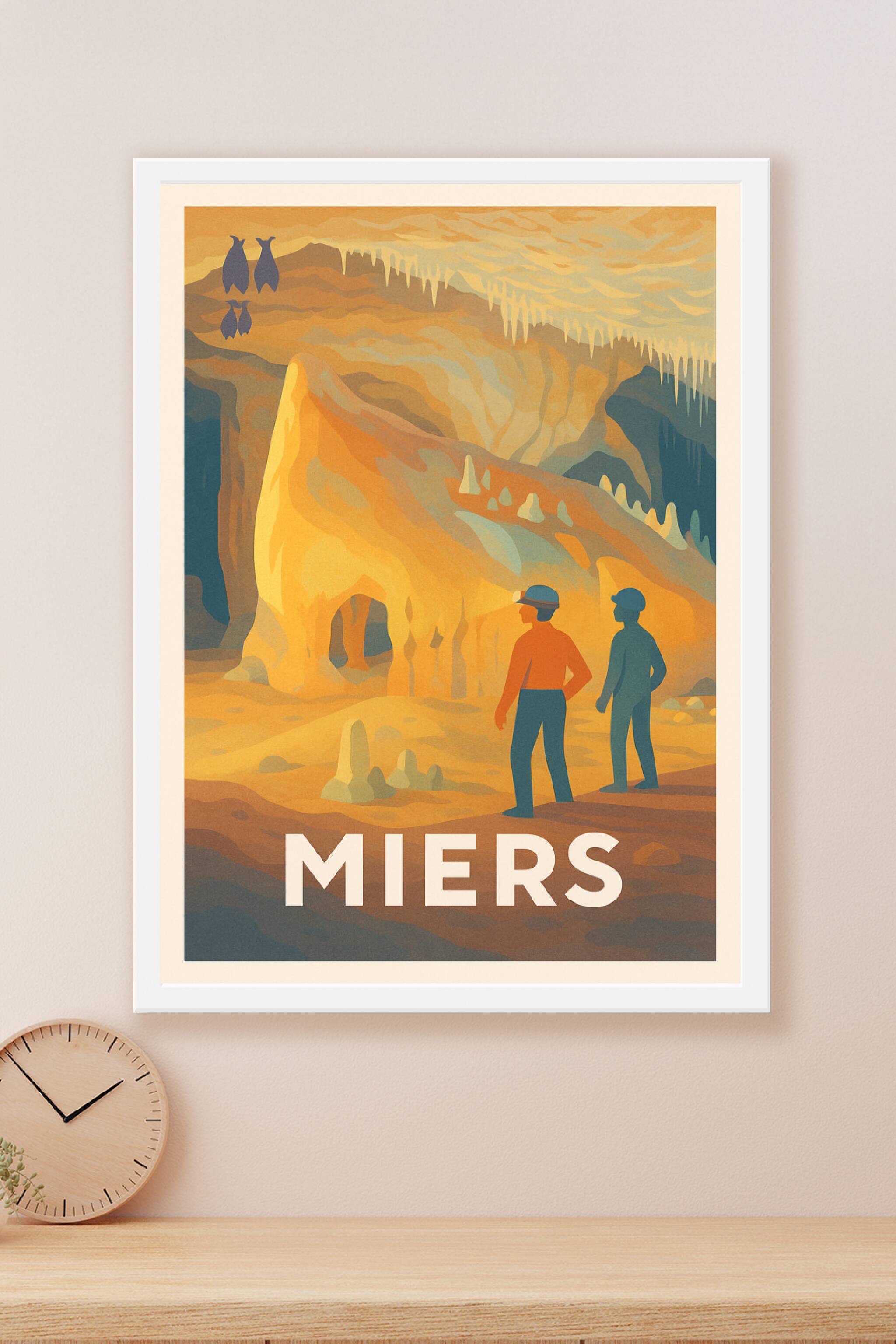Découvrez la magie des grottes de Miers avec cette affiche au style vintage qui capture l'ambiance mystérieuse et fascinante des cavernes naturelle...