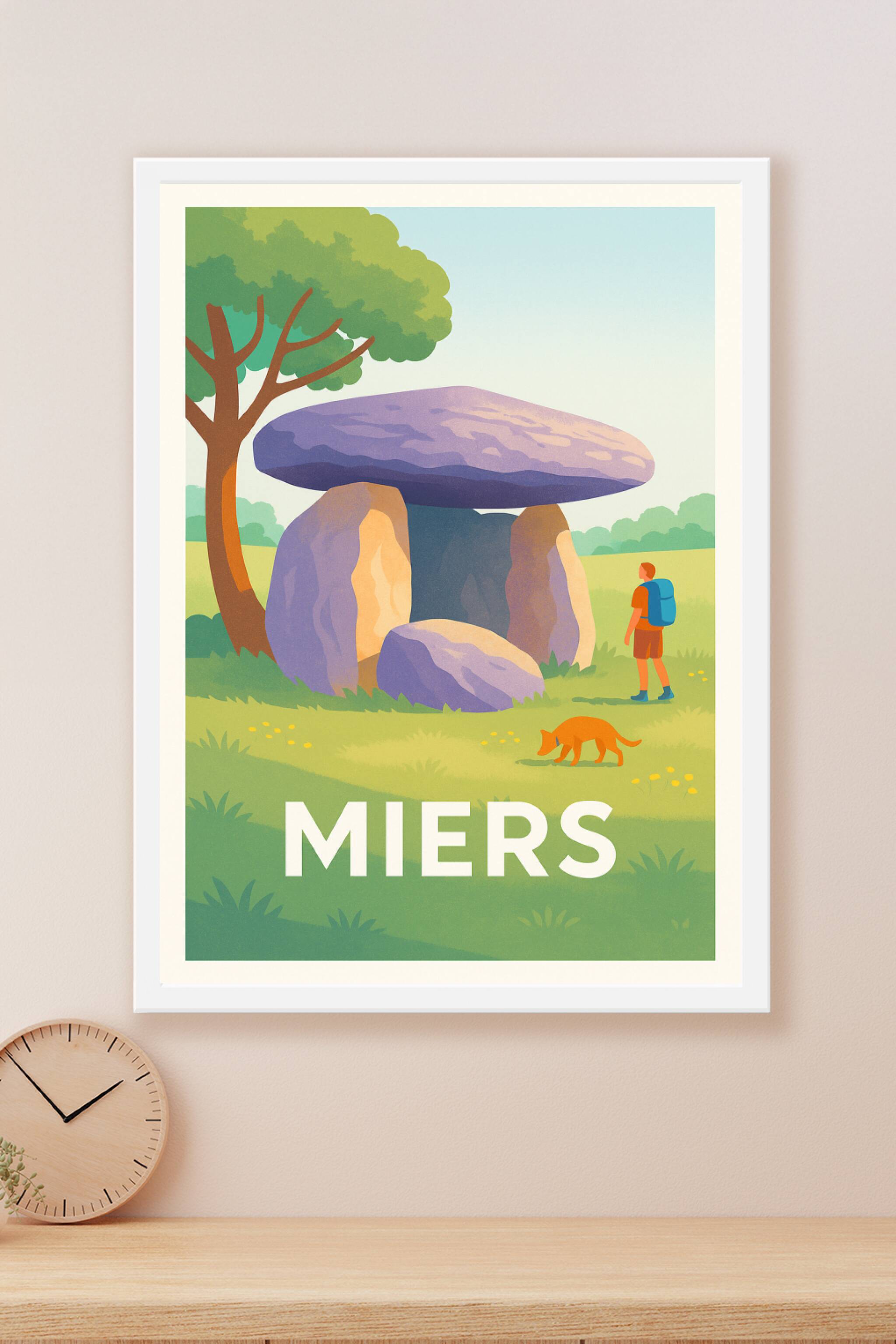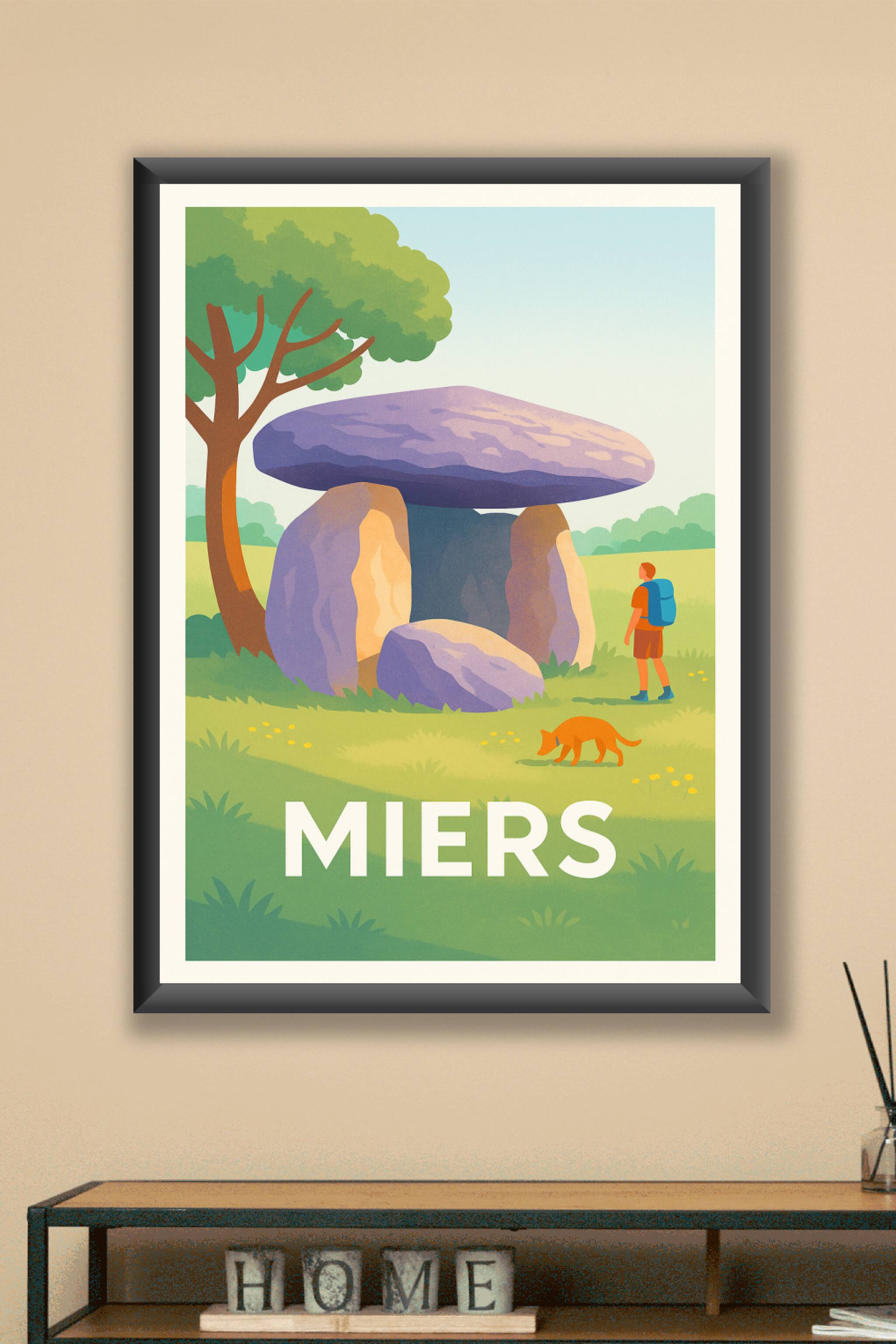 Découvrez la beauté intemporelle de Miers avec cette affiche illustrée mettant en avant un dolmen emblématique niché au cœur de la nature verdoyant...