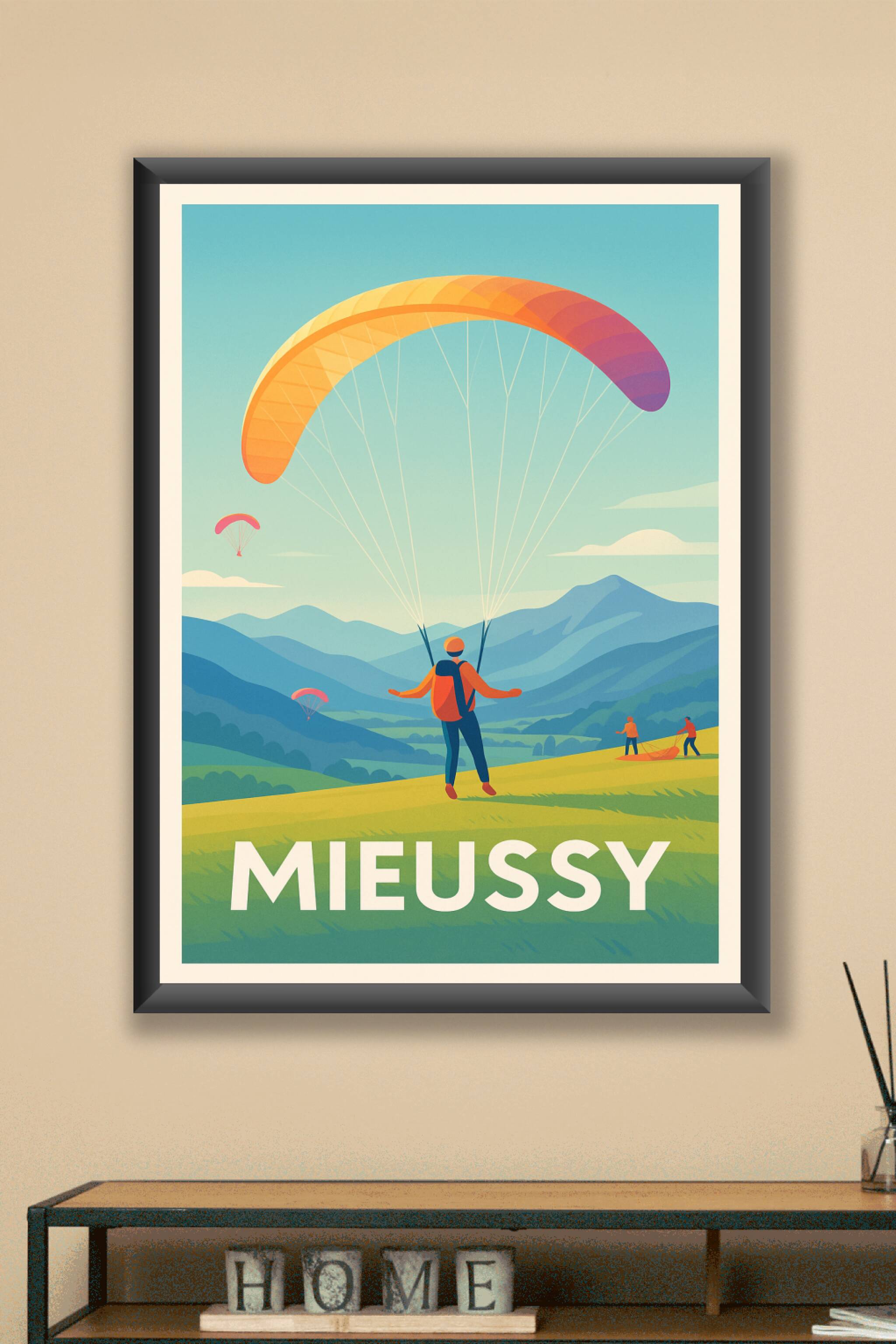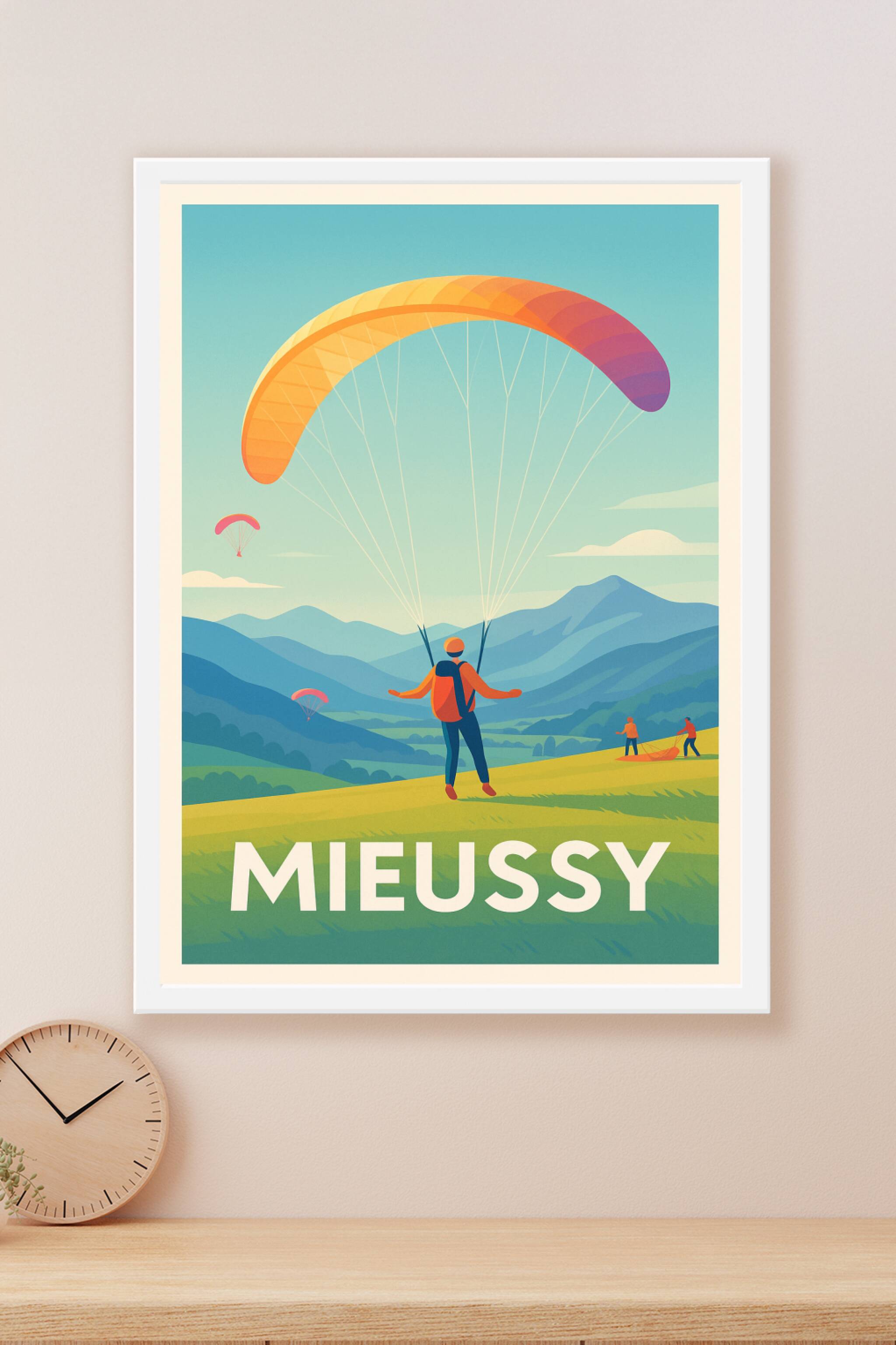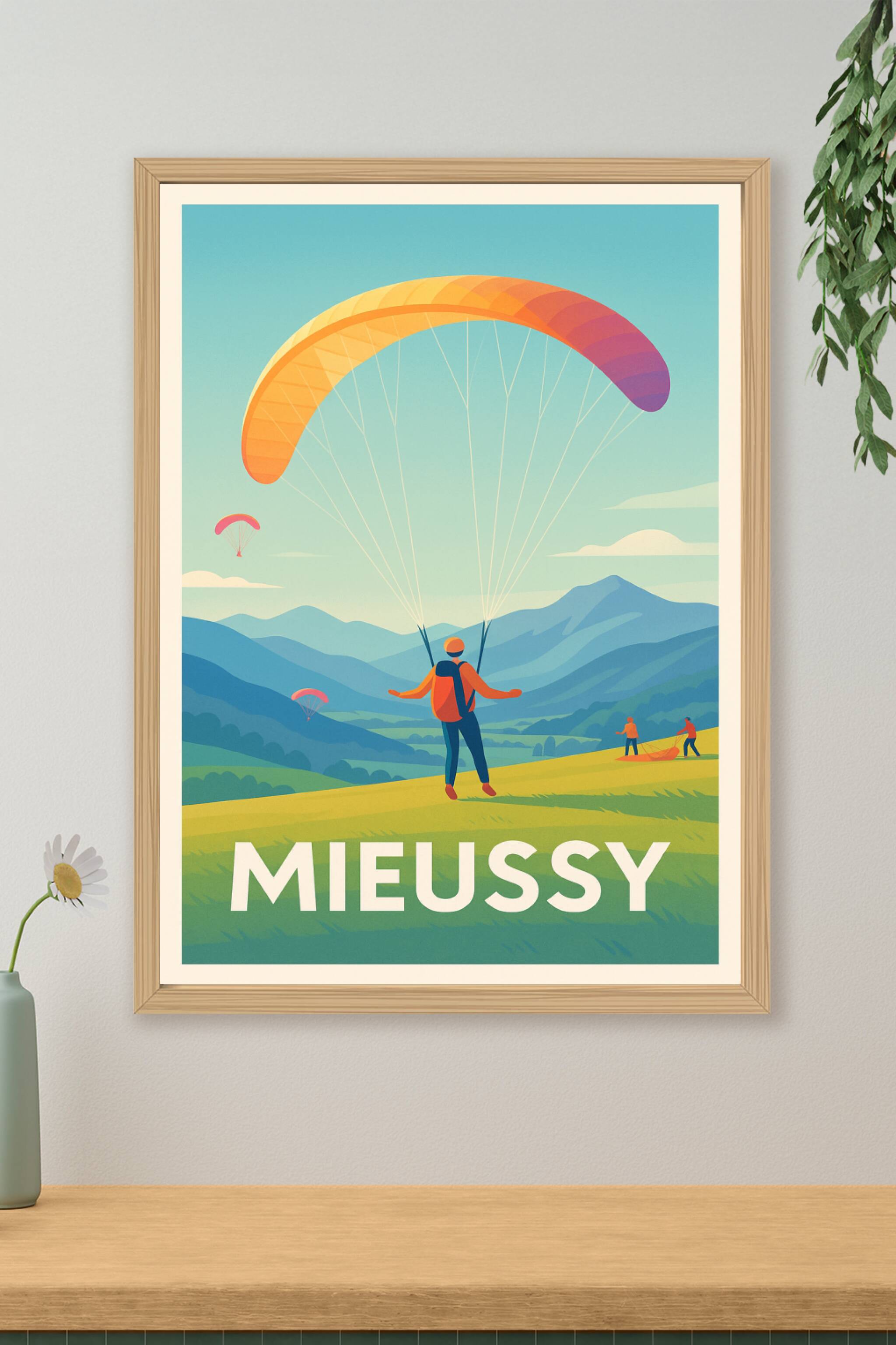 Découvrez l'univers aérien et vibrant de Mieussy avec cette affiche illustrée mettant en scène des amateurs de parapente évoluant au-dessus des maj...