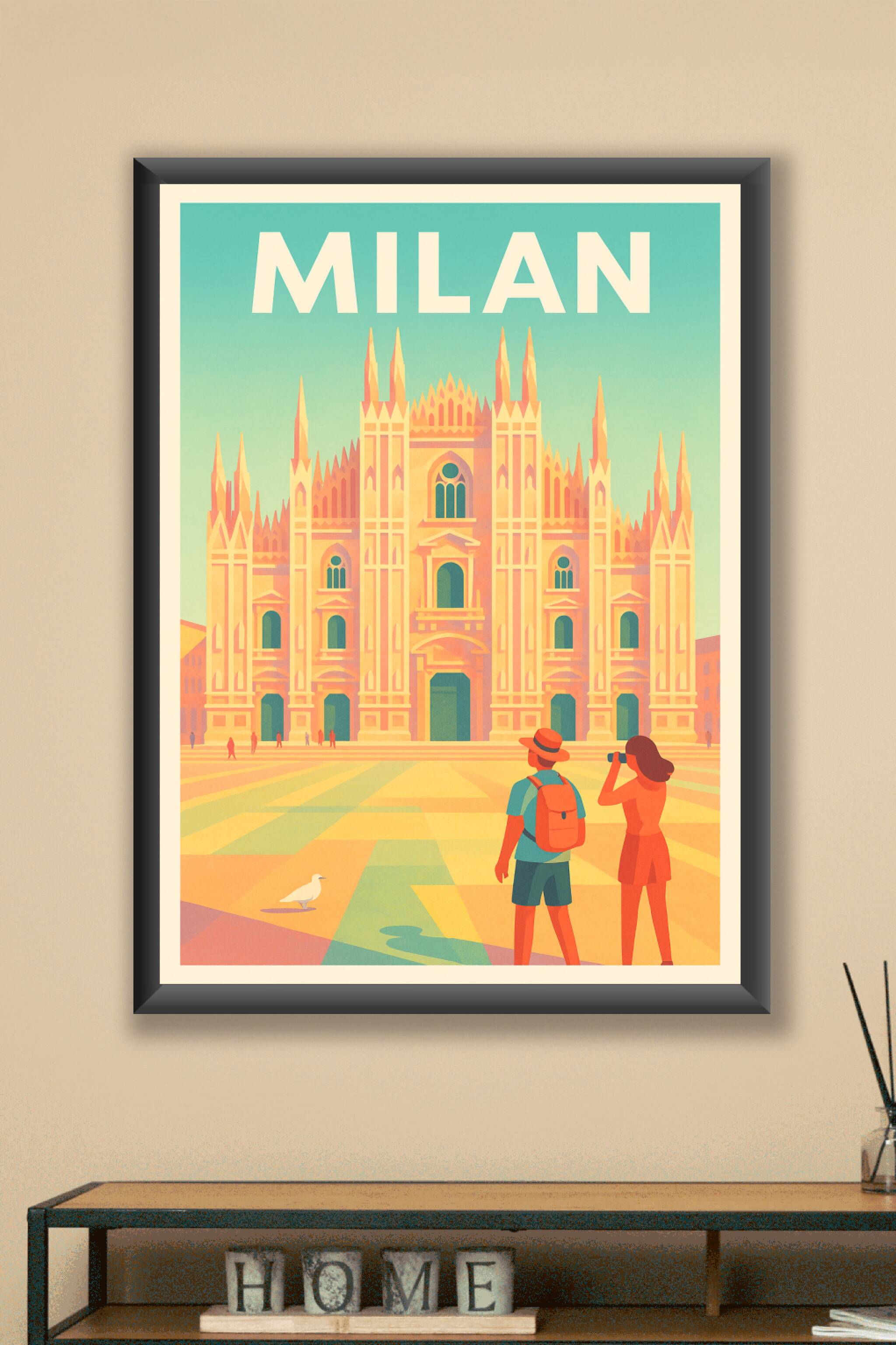 Plongez au cœur de Milan avec cette affiche illustrant la majestueuse cathédrale de la ville, un joyau architectural qui fascine les visiteurs. Ce poster coloré capture la lumière douce et les détails uniques de ce monument emblématique, tout en apportant une touche vintage moderne à votre décoration intérieure. Disponible en tirage "Fine Art" sur papier 305g coton, cette affiche bénéficie d'une qualité d'impression d'exception, 100% fabriquée en France. Choisissez parmi plusieurs formats, de A1 à A4, avec ou sans cadre, pour sublimer votre salon, bureau ou offrir un souvenir unique aux passionnés de voyage et d'art.