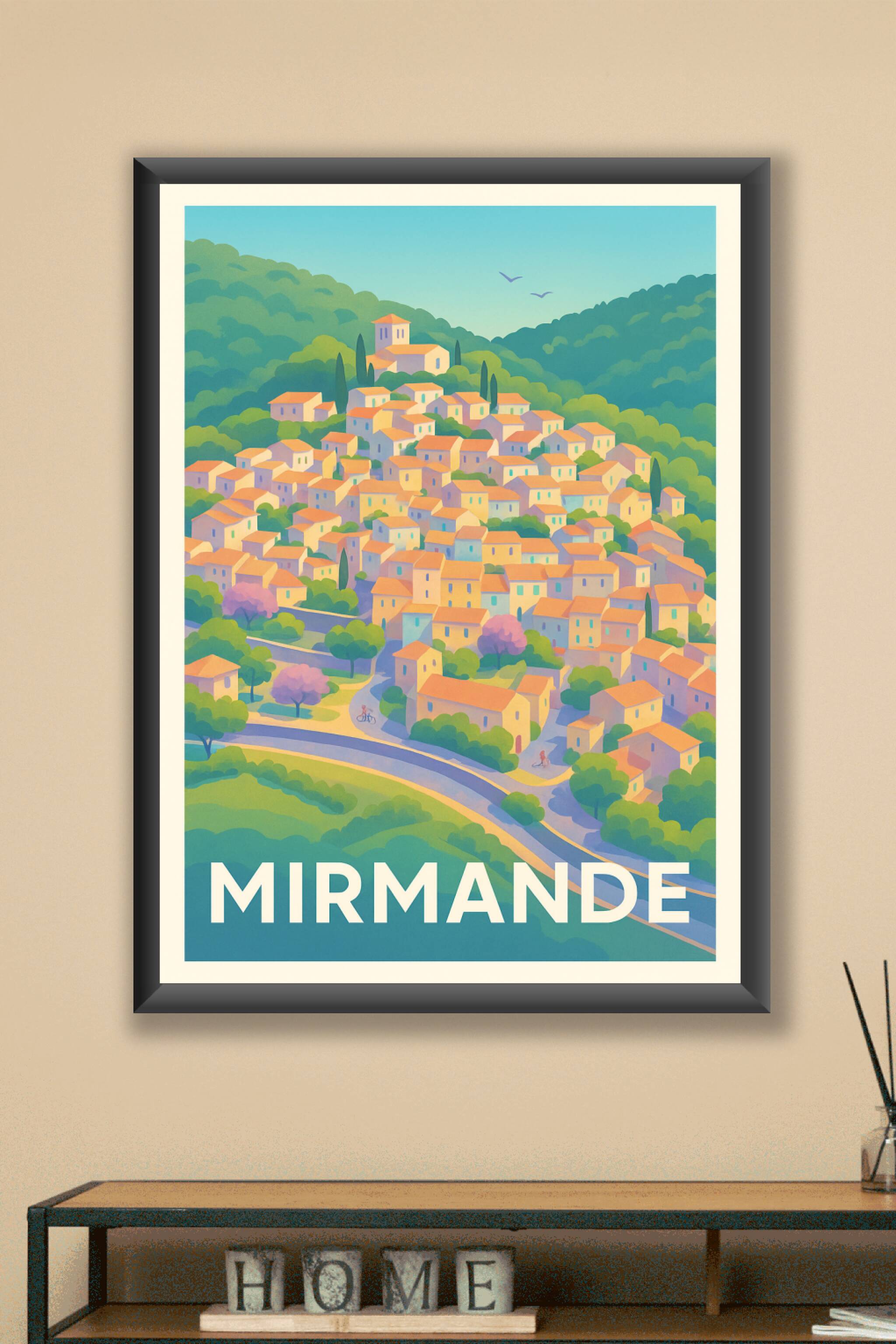Découvrez l'envoûtante douceur de vivre provençale avec cette affiche représentant le village de Mirmande, lové au cœur des collines verdoyantes. Cette poster aux couleurs pastel met en scène les toits orangés typiques et l’harmonie naturelle qui fait tout le charme de ce village médiéval. Imprimée en tirage "Fine Art" sur papier 305g coton, cette affiche garantit une qualité d'impression exceptionnelle et des couleurs vibrantes, parfaites pour embellir votre intérieur ou offrir un cadeau unique. Disponible en formats A1 à A4, avec ou sans cadre, elle s'adapte à tous les espaces et styles décoratifs. Profitez d'un tirage premium 100% fabriqué en France pour faire entrer l'esprit de la Provence dans votre maison.