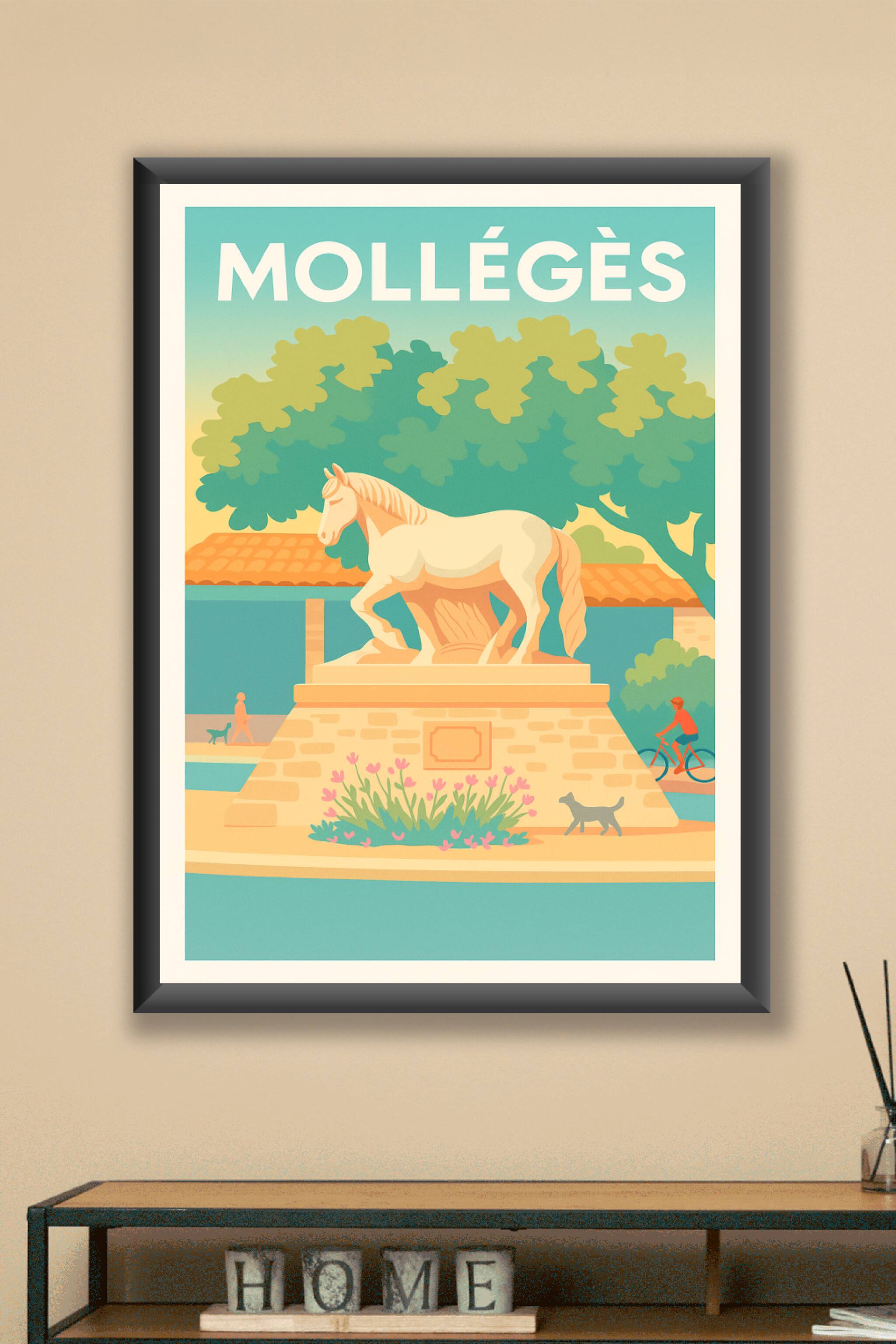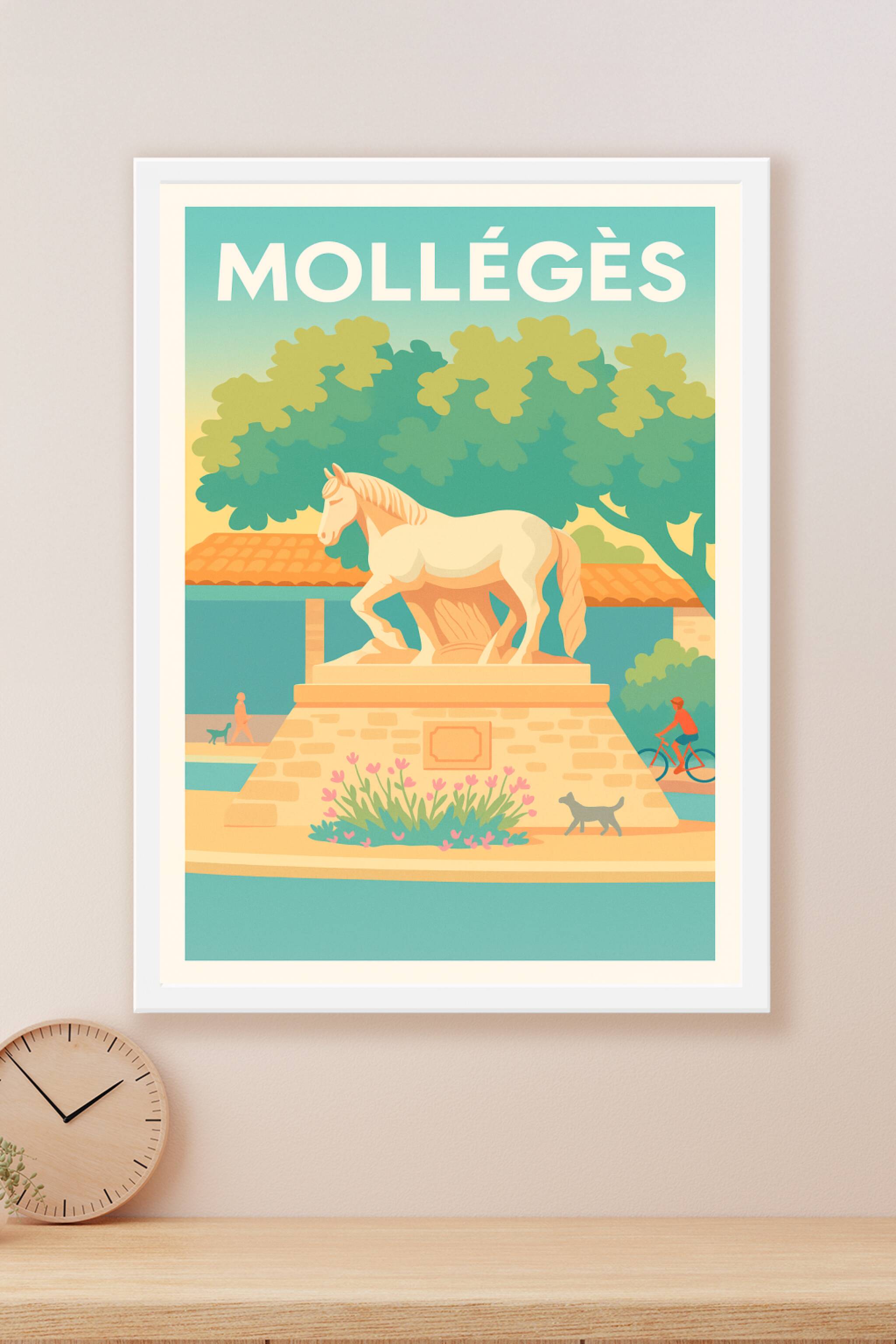 Découvrez le charme paisible de Mollégès avec cette affiche vintage illustrant la célèbre statue du cheval blanc, emblème de la ville. Ce poster au...