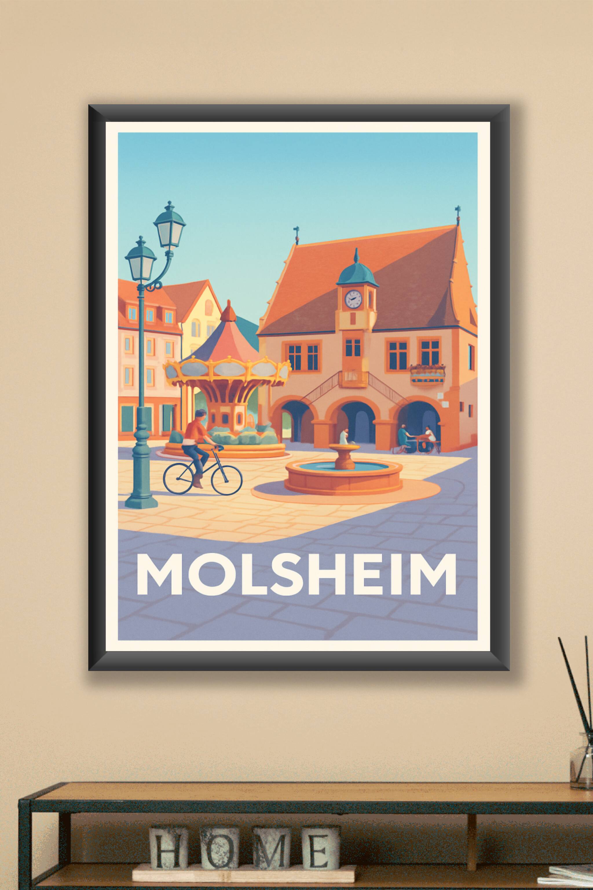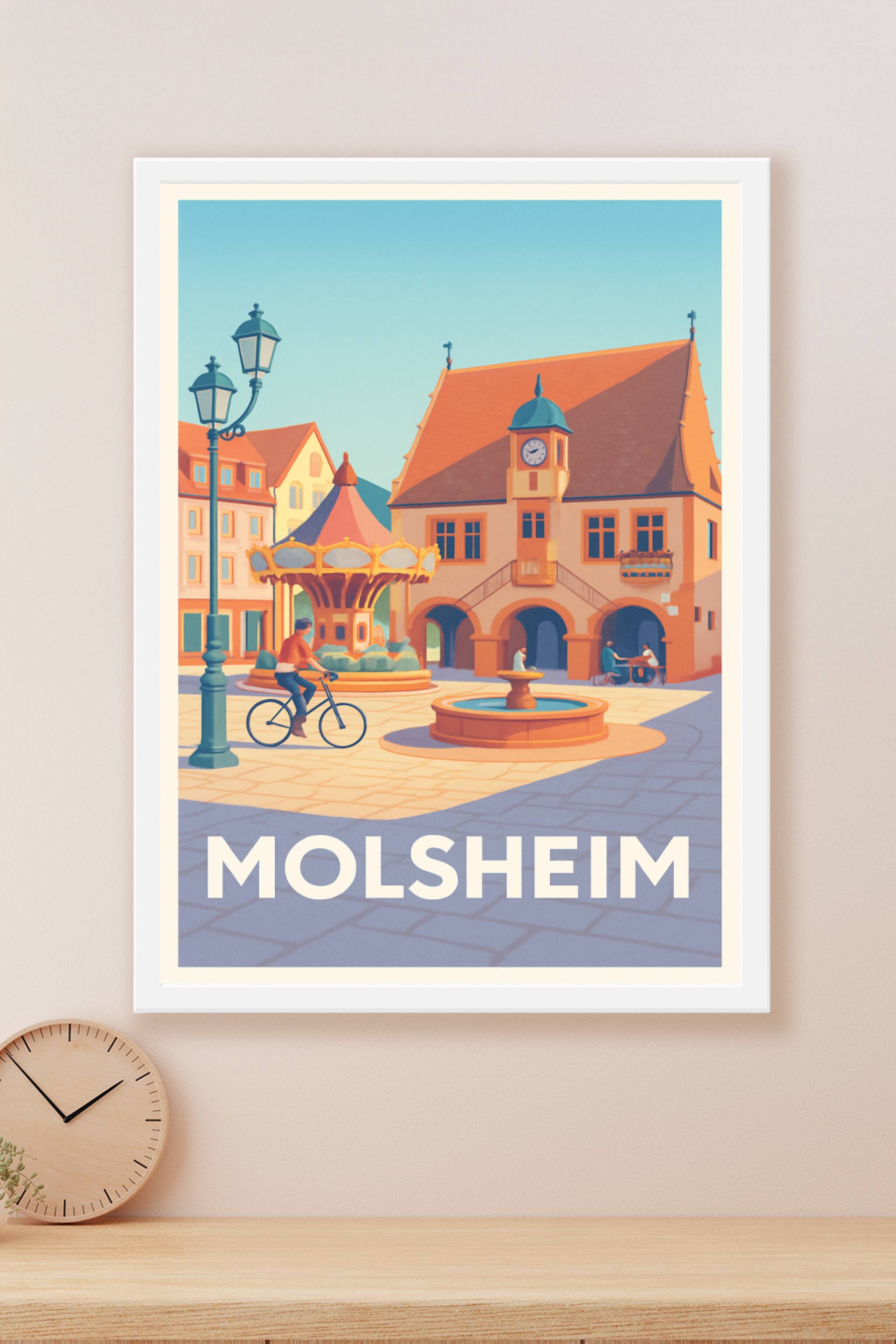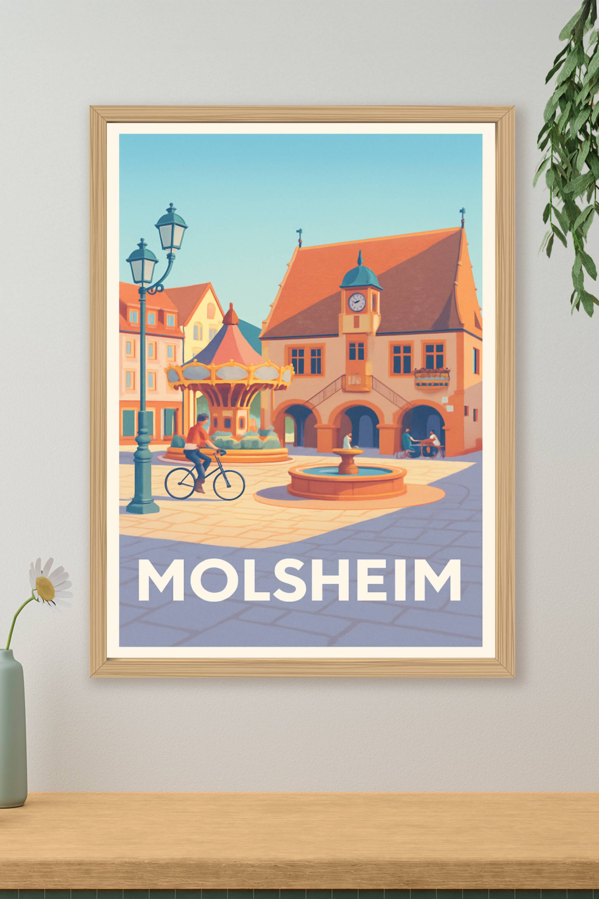 Découvrez le charme pittoresque de Molsheim avec cette affiche illustrée qui capture une scène paisible de son centre historique, entre la fontaine...