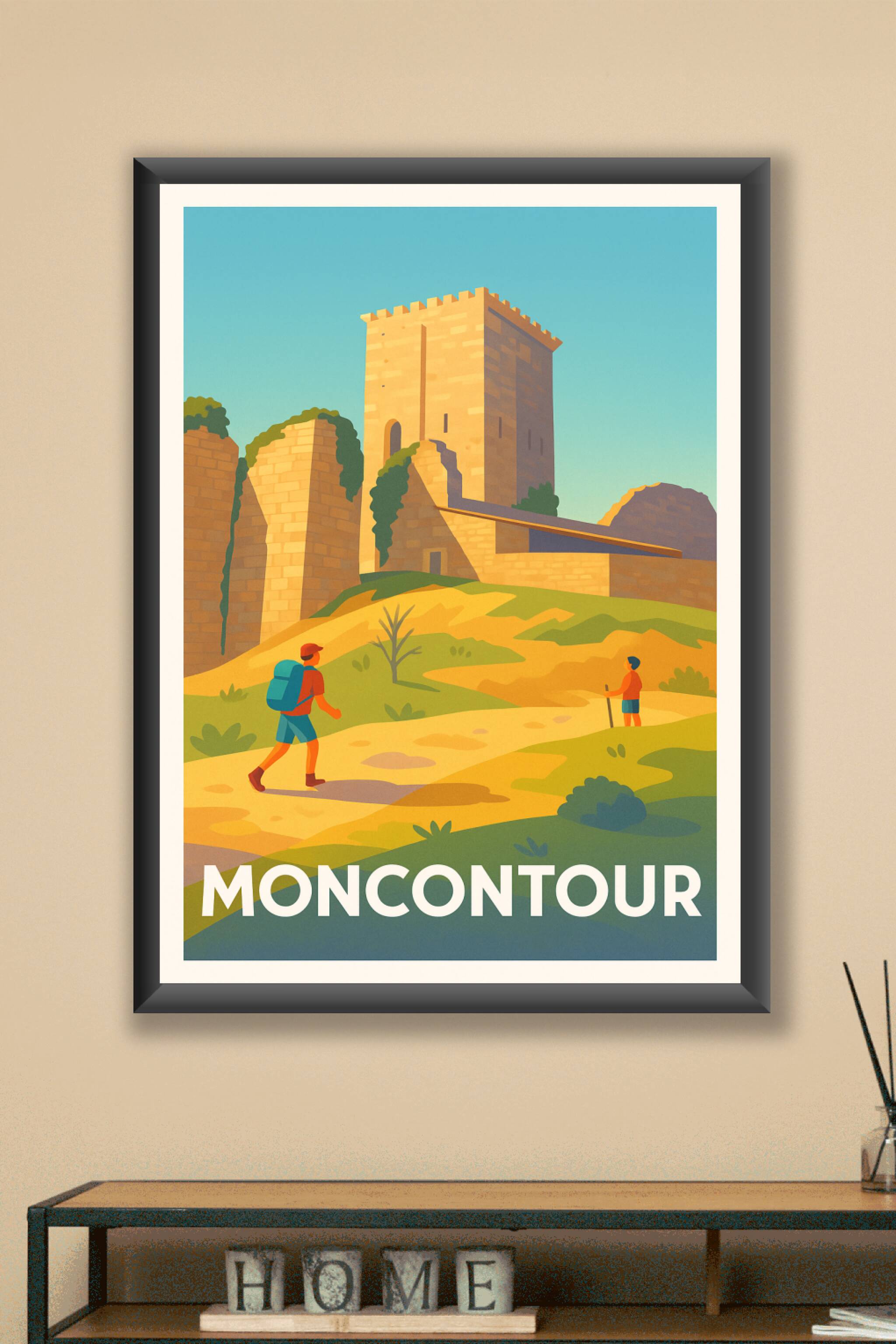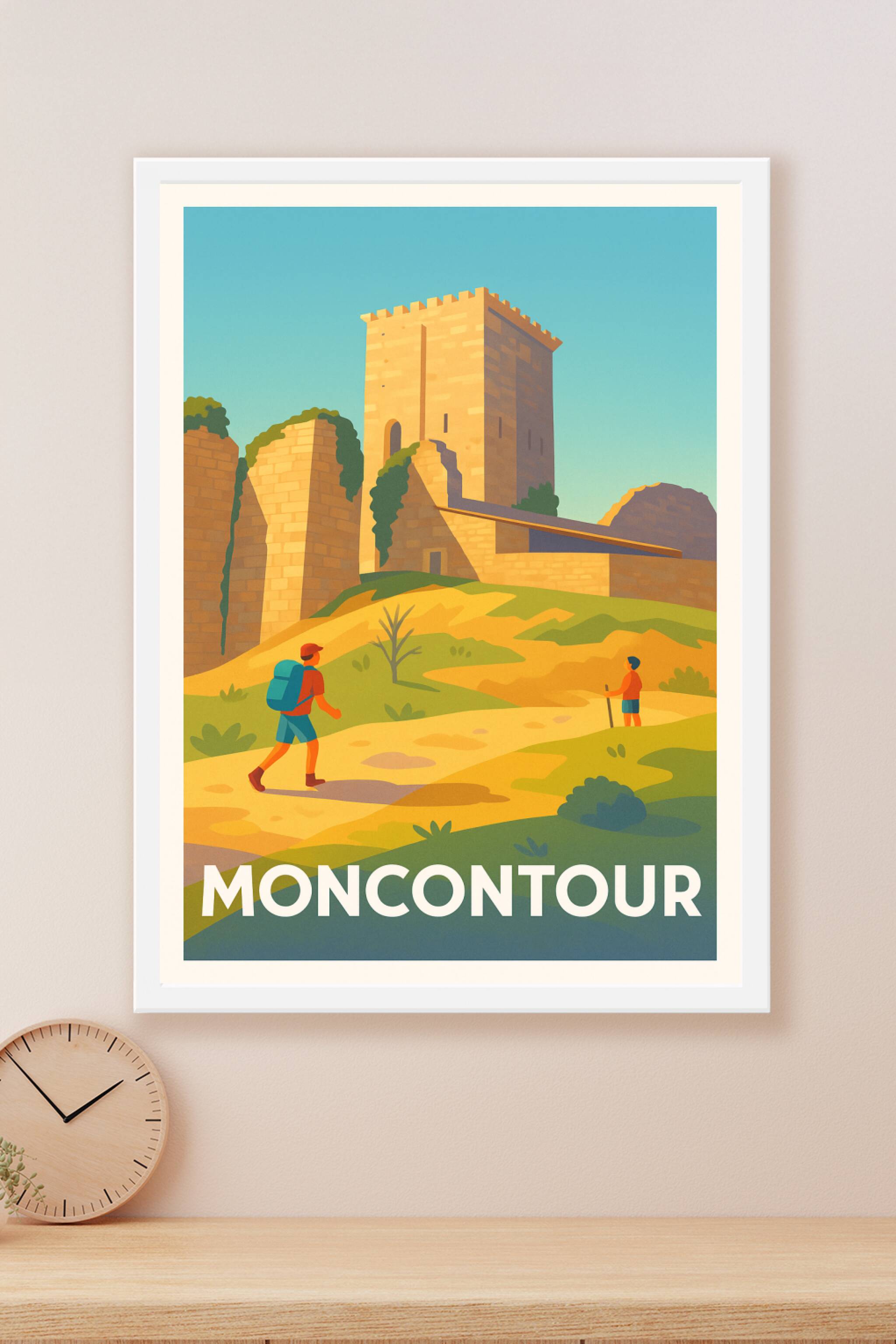 Découvrez l'élégance rustique de Moncontour avec cette affiche illustrée qui met en lumière ses emblématiques ruines et la beauté de ses paysages v...
