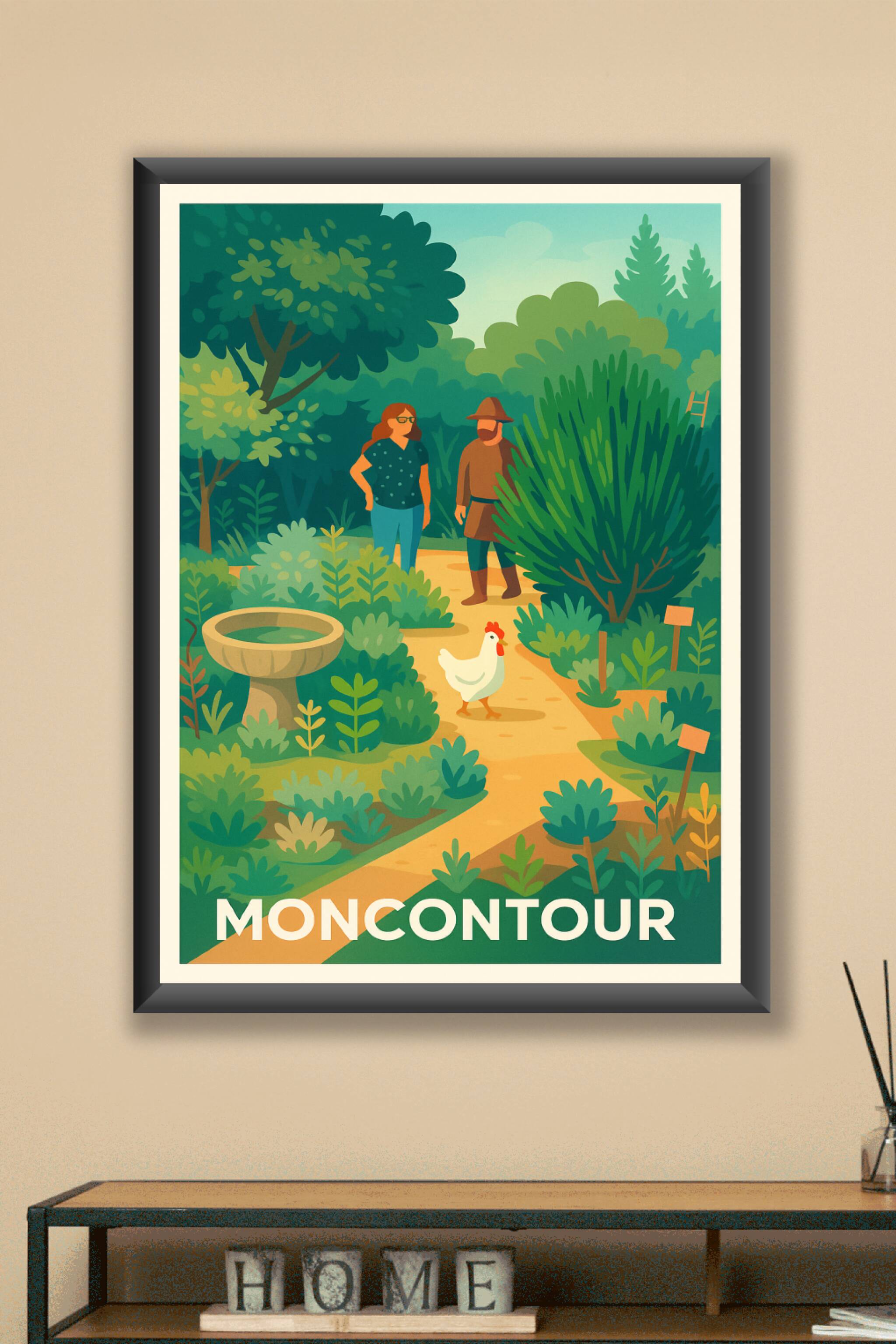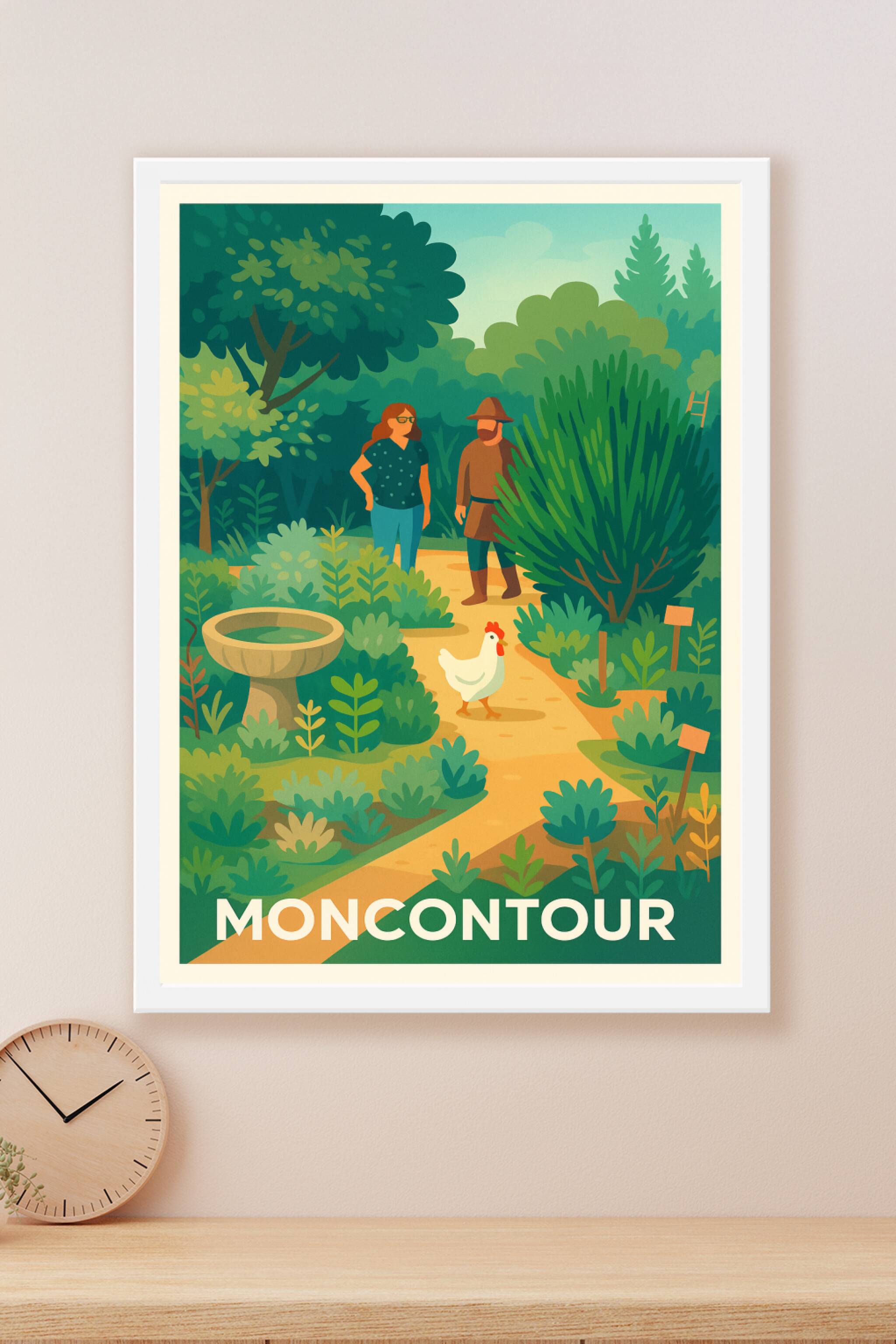 Découvrez la sérénité unique de Moncontour à travers cette affiche illustrée qui capture l'essence de ses jardins luxuriants et de ses rencontres c...