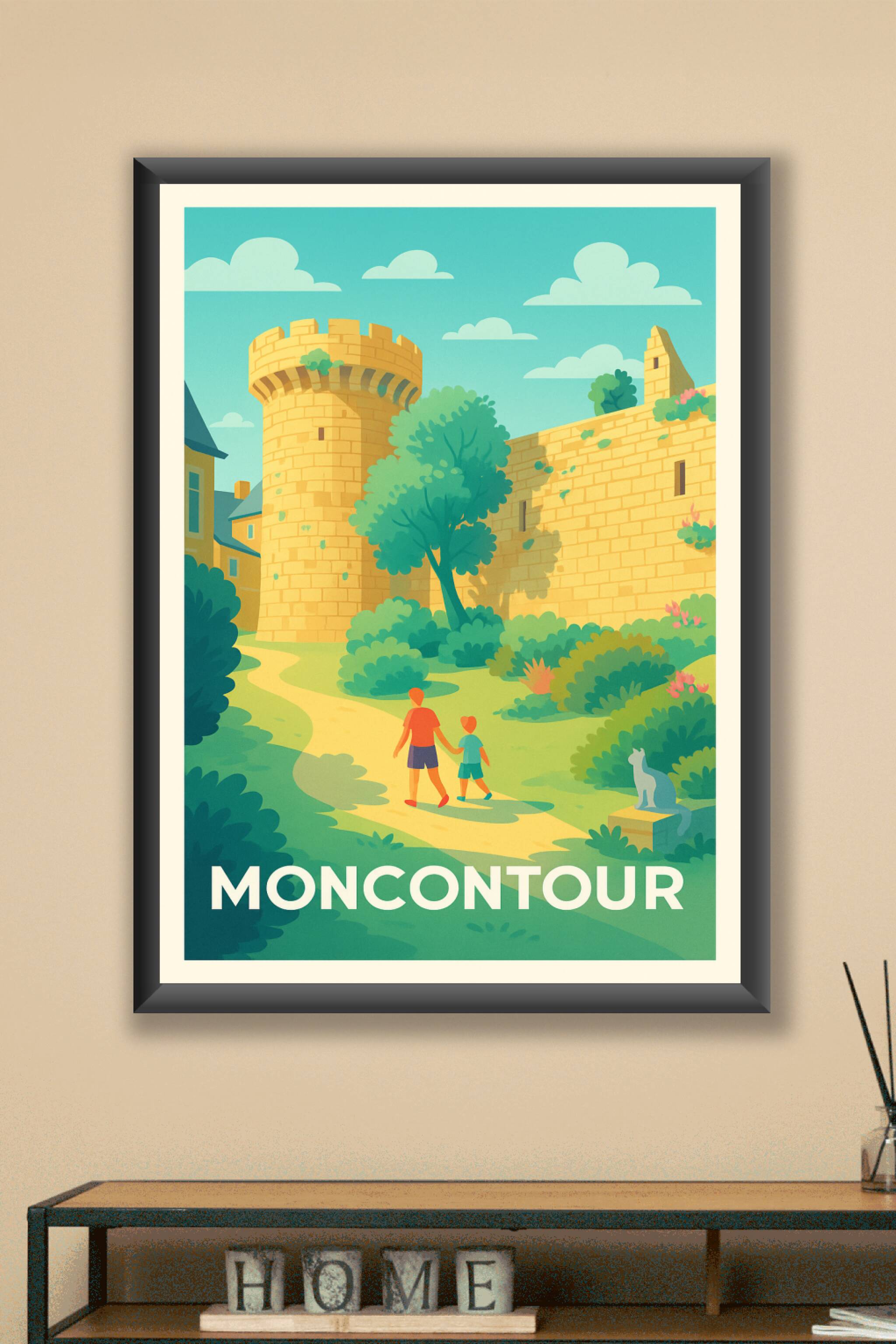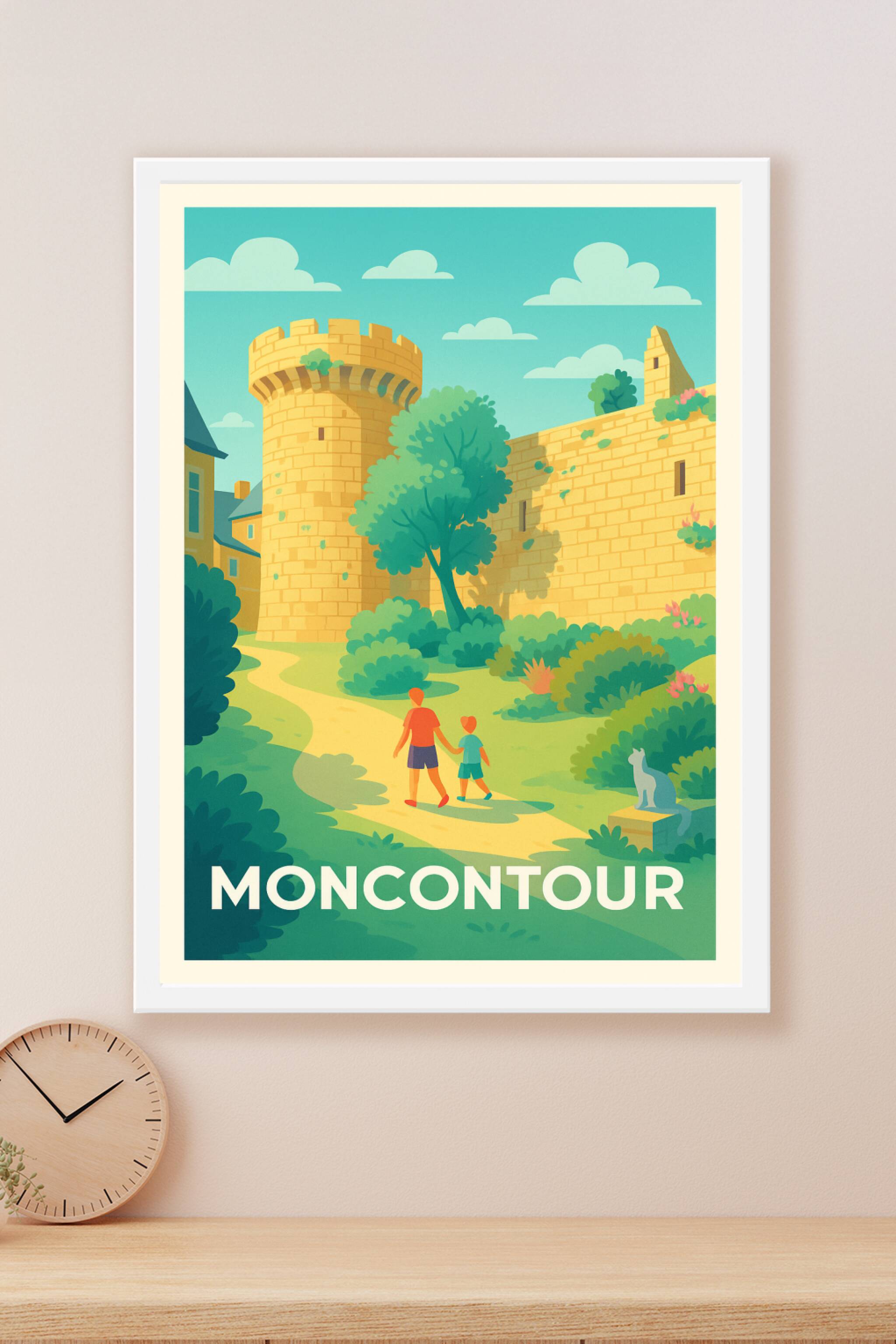 Découvrez le charme médiéval de Moncontour avec cette affiche illustrée aux couleurs douces et apaisantes. Cette scène paisible, mettant en avant u...