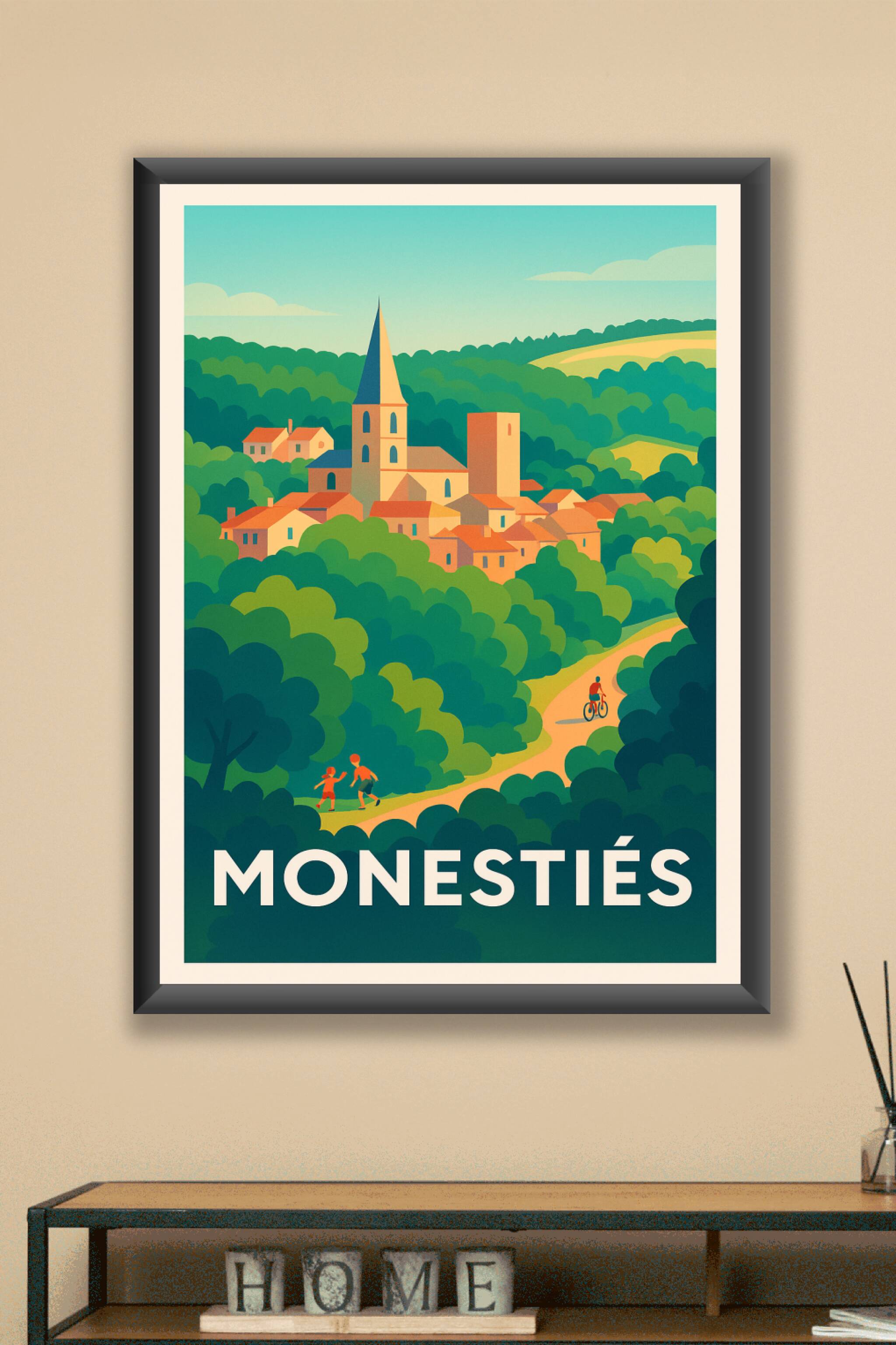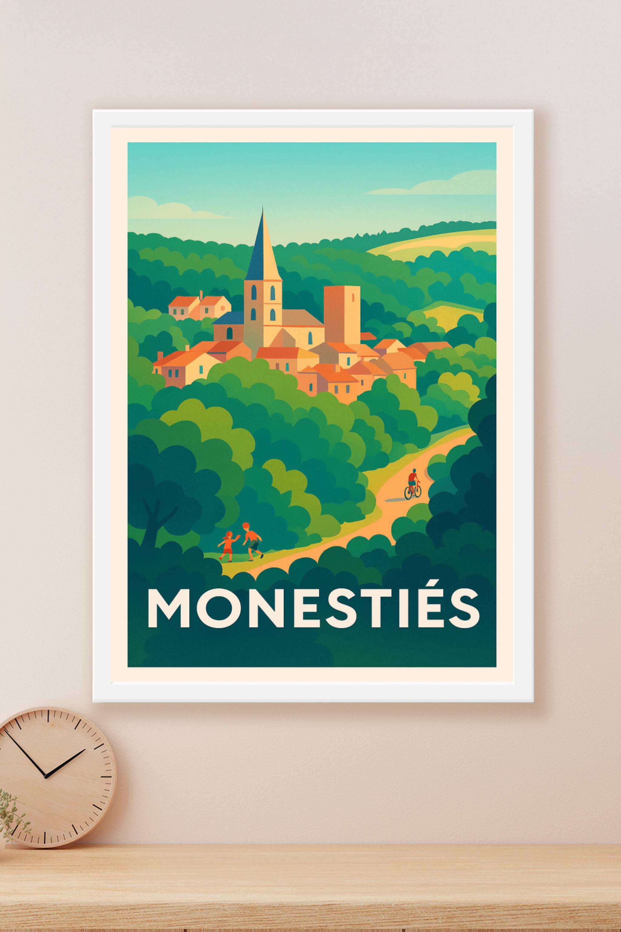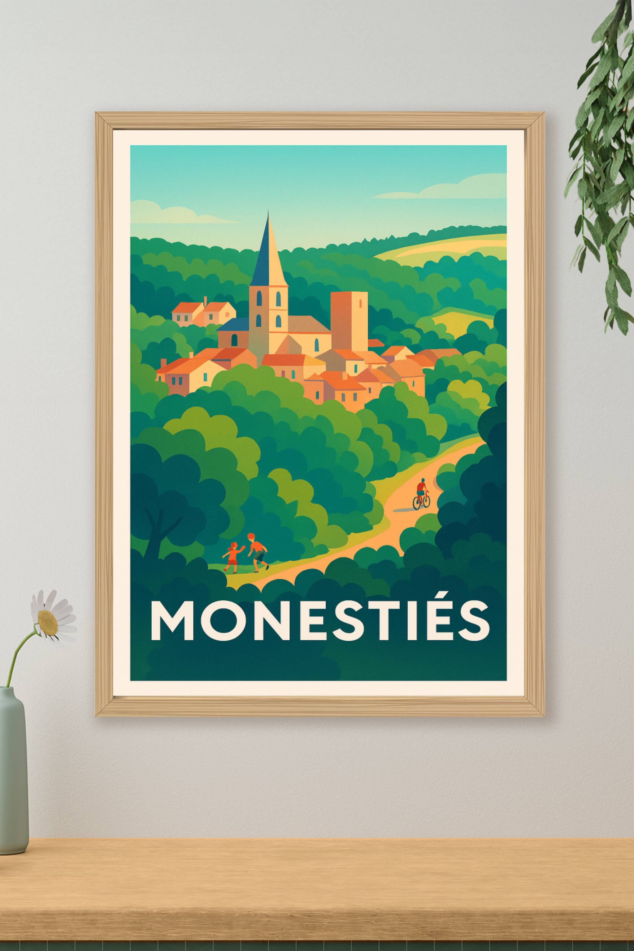 Découvrez l'élégance paisible du village de Monestiés avec cette affiche illustrée aux couleurs douces et chaleureuses. Ce poster évoque les ruelle...