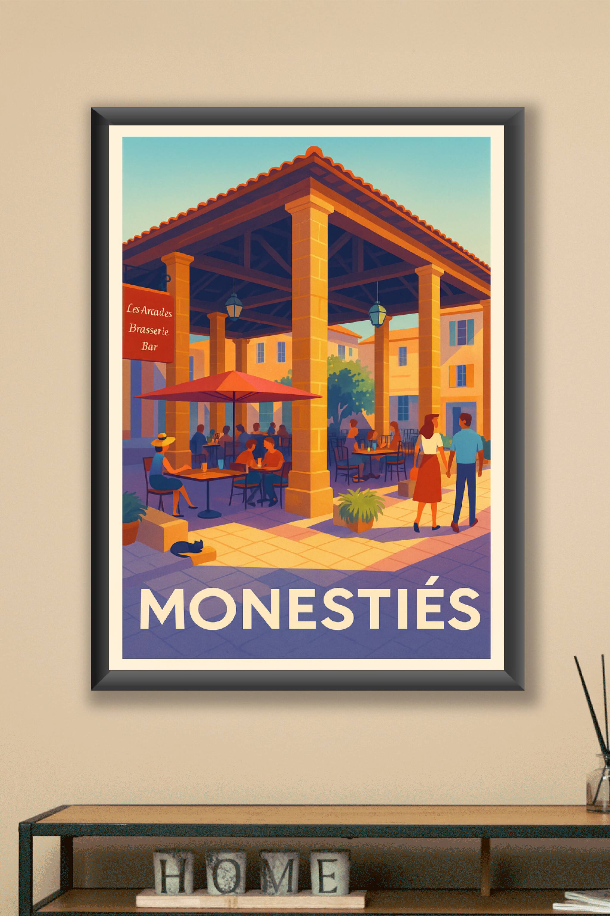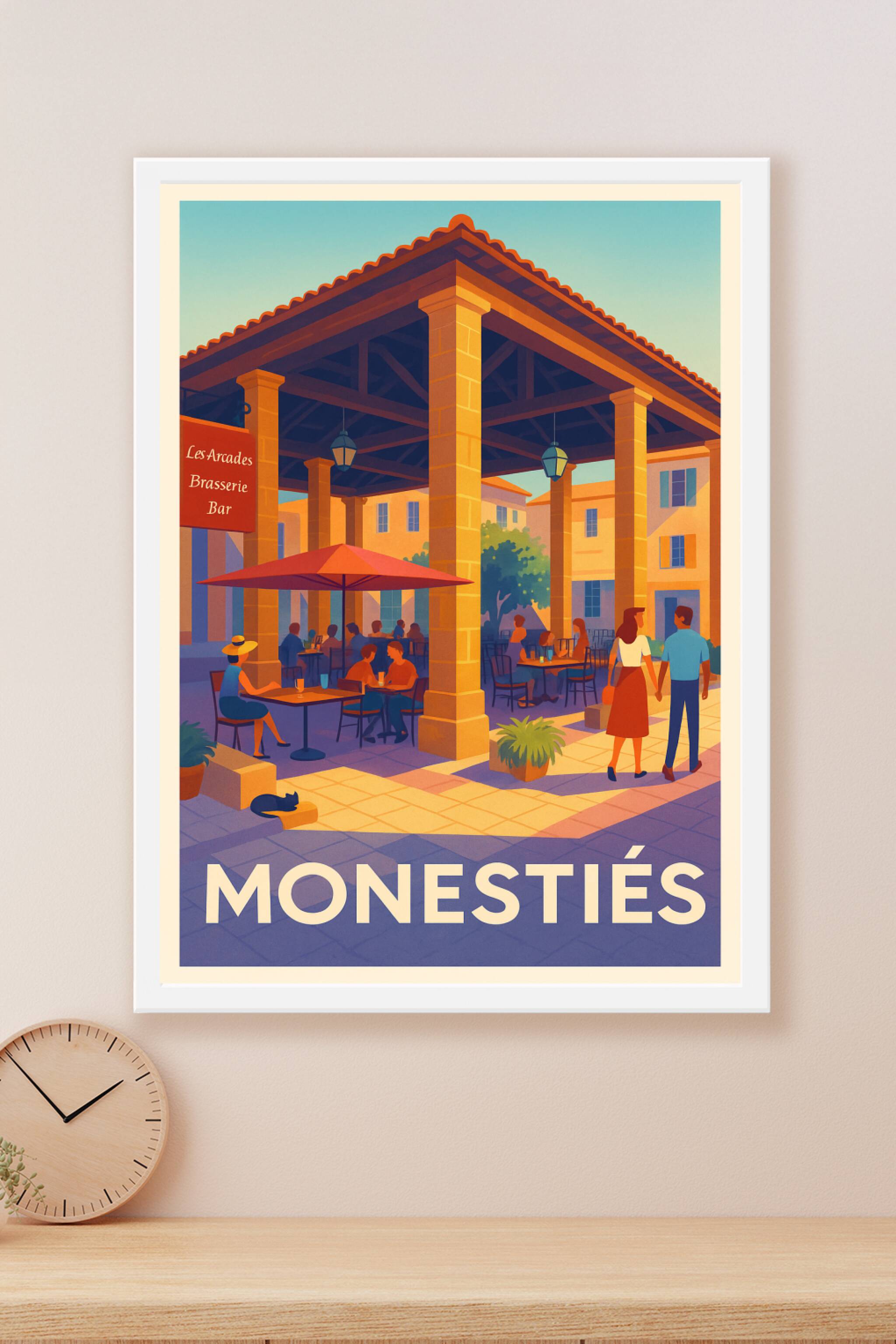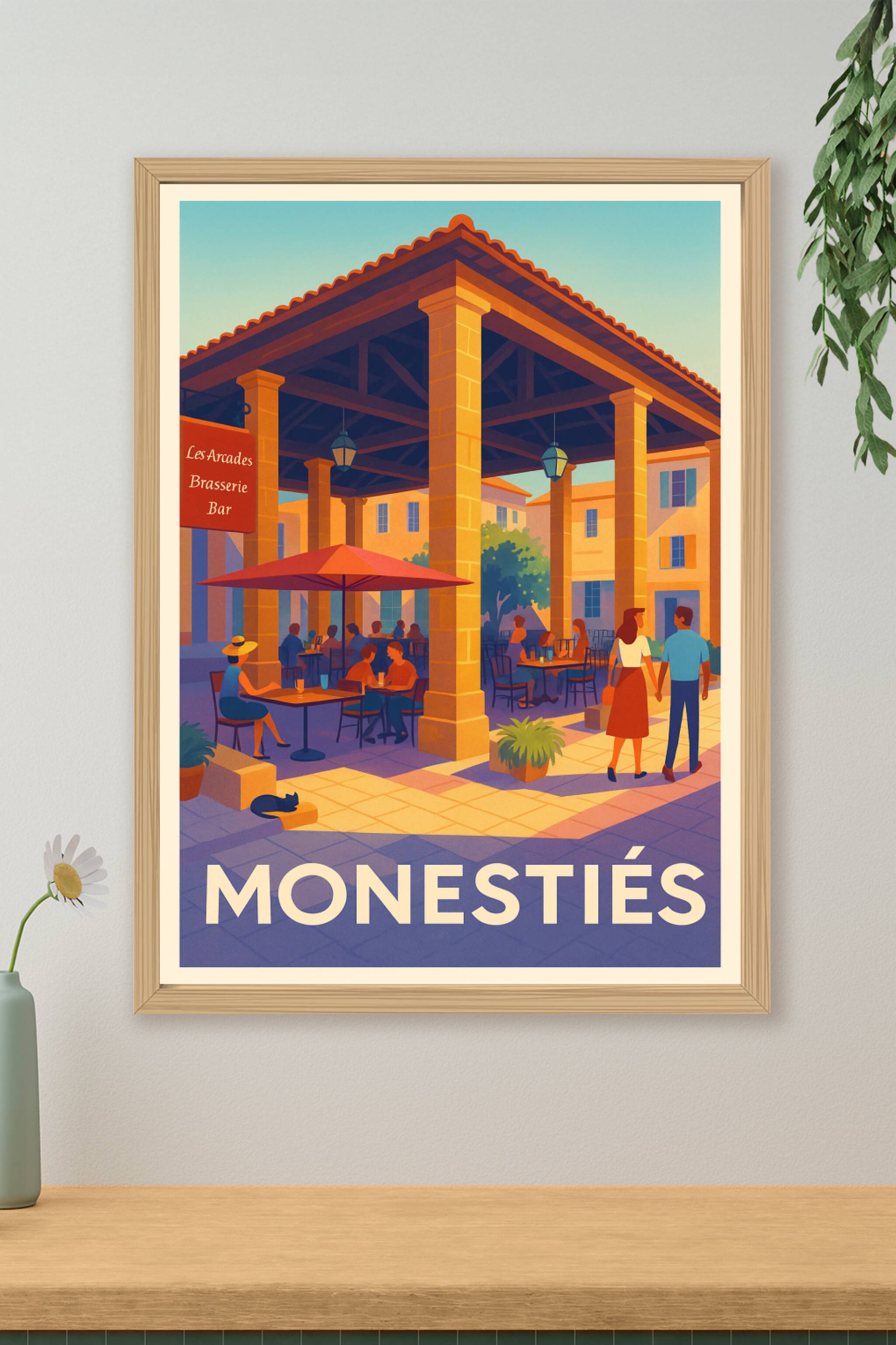 Découvrez le charme authentique de Monestiés avec cette affiche illustrant la douceur de vivre sous les arcades accueillantes d'une brasserie local...