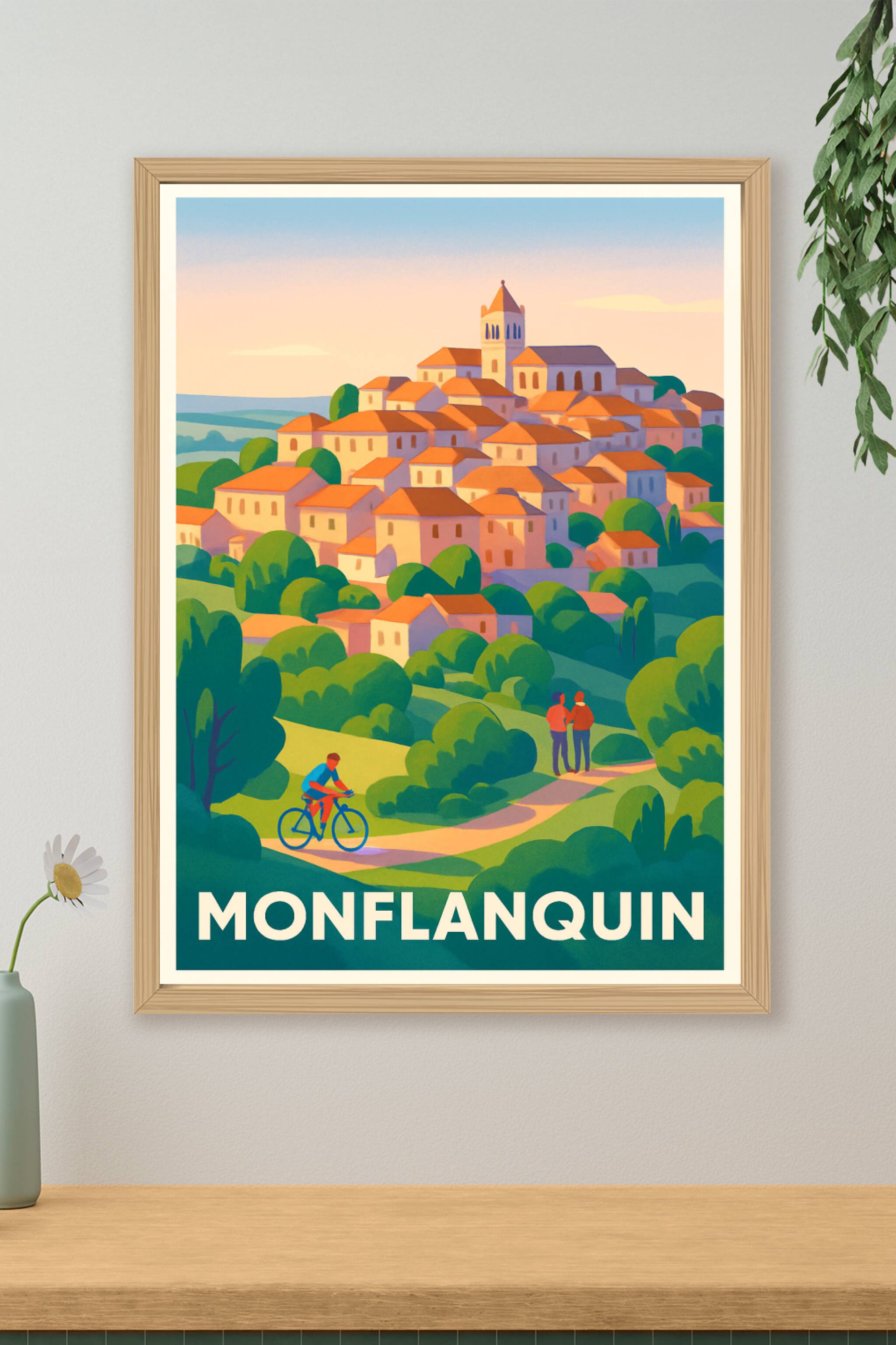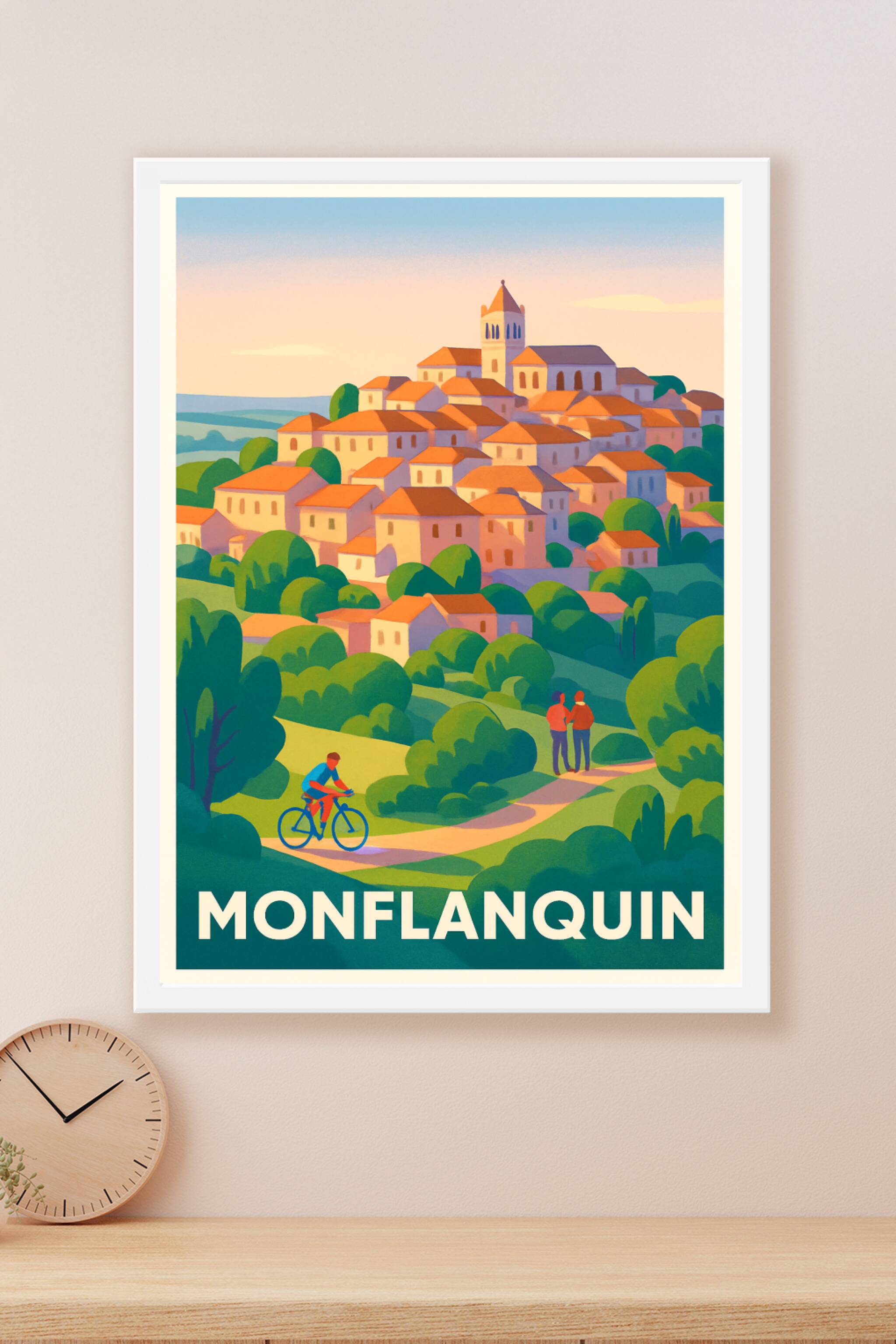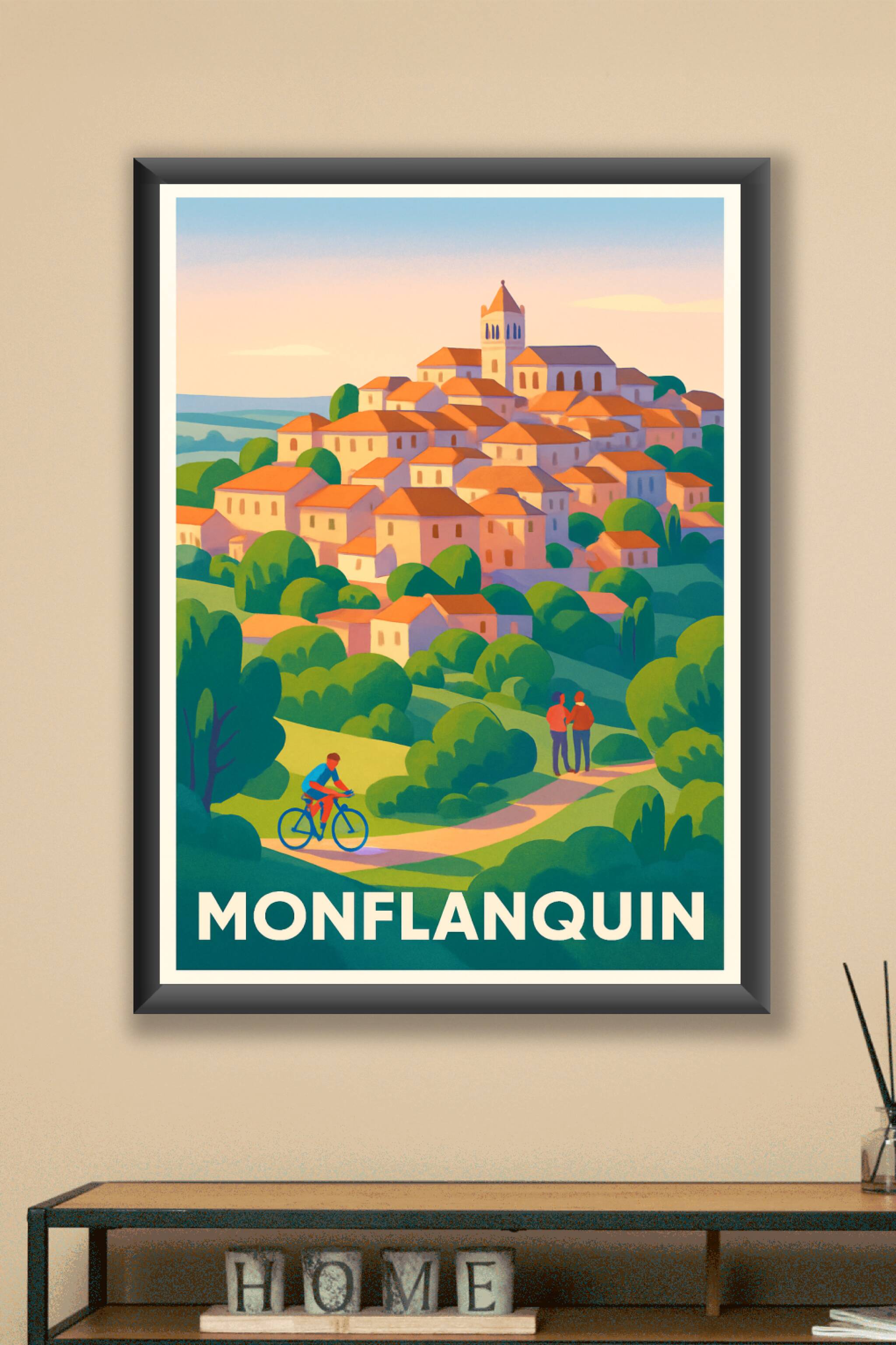 Découvrez le charme intemporel de Monflanquin avec cette affiche illustrée mettant en scène ses toits orangés baignés par une lumière douce et chal...