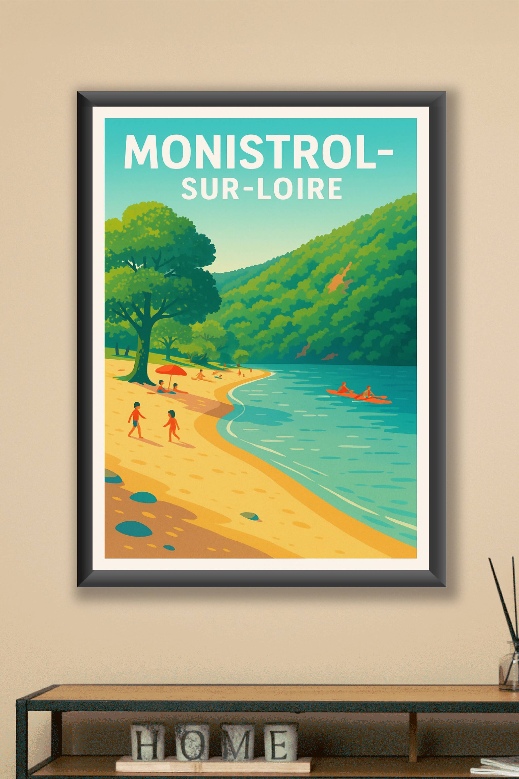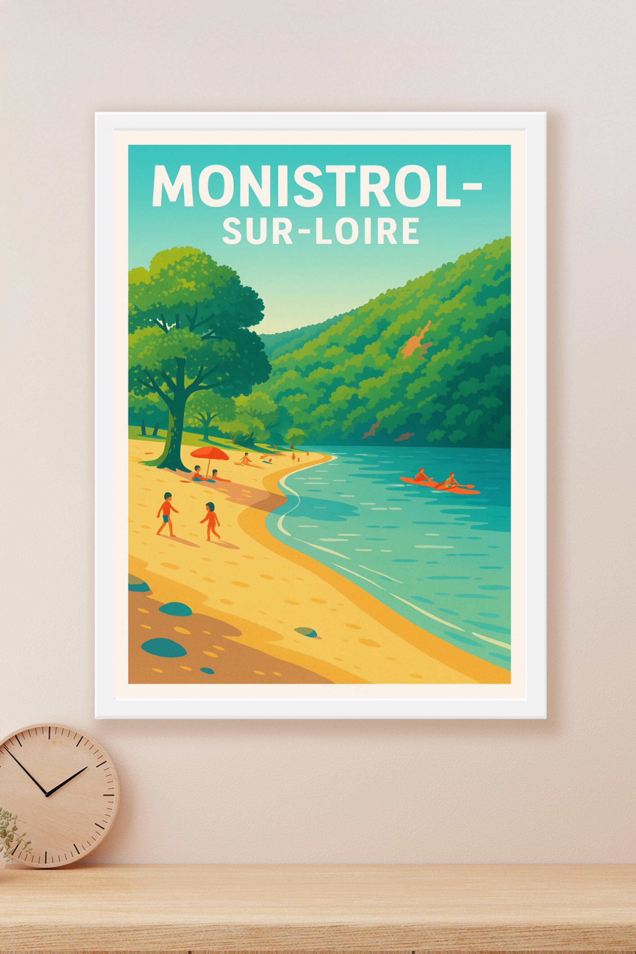 Offrez-vous une parenthèse bucolique avec cette affiche illustrant la douceur de vivre à Monistrol-sur-Loire, au bord de la Loire, entre plages dor...