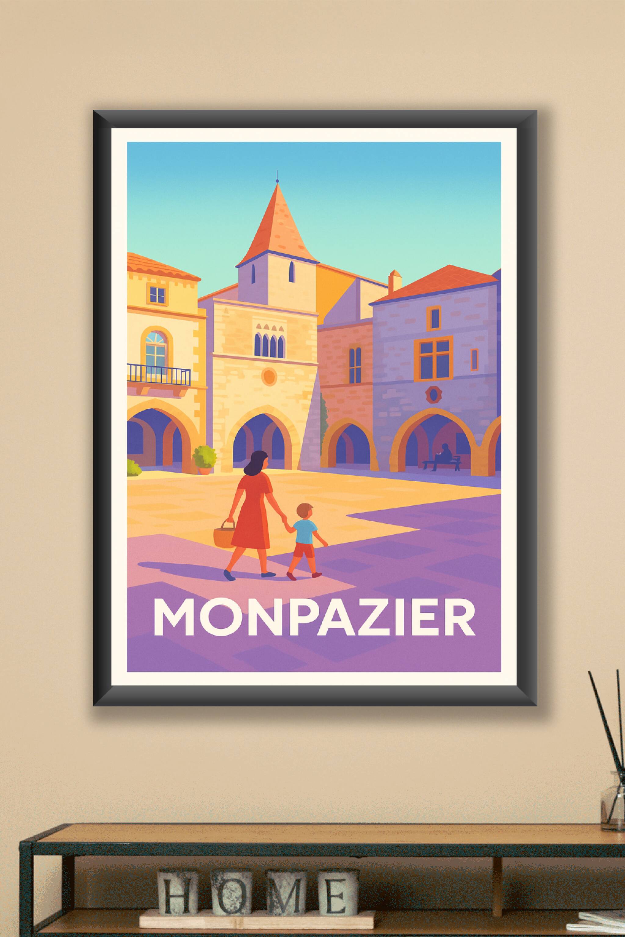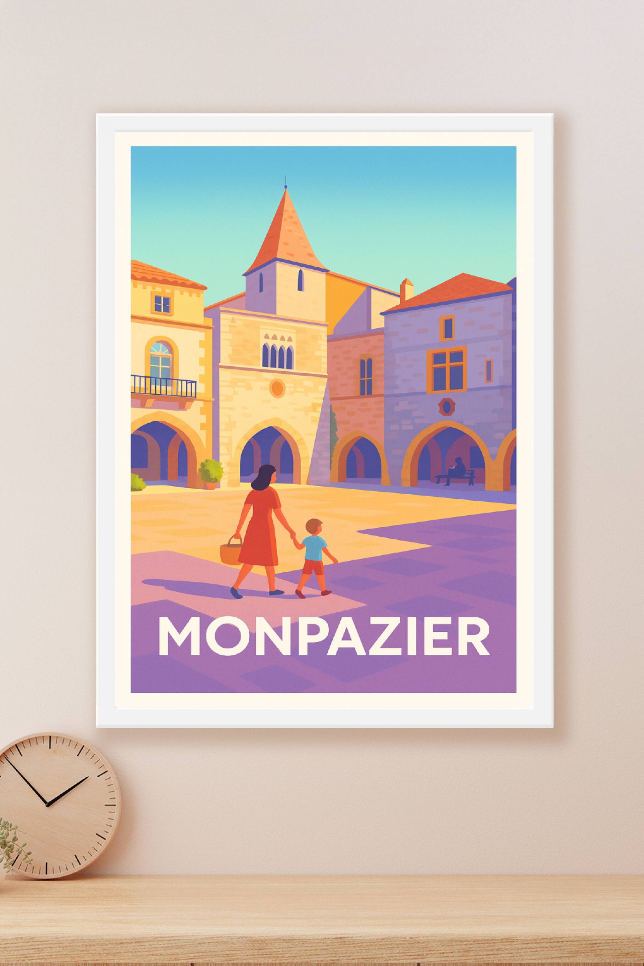 Découvrez le charme unique de Monpazier avec cette affiche illustrée aux couleurs chaudes et apaisantes. Ce poster met en avant les arcades médiéva...