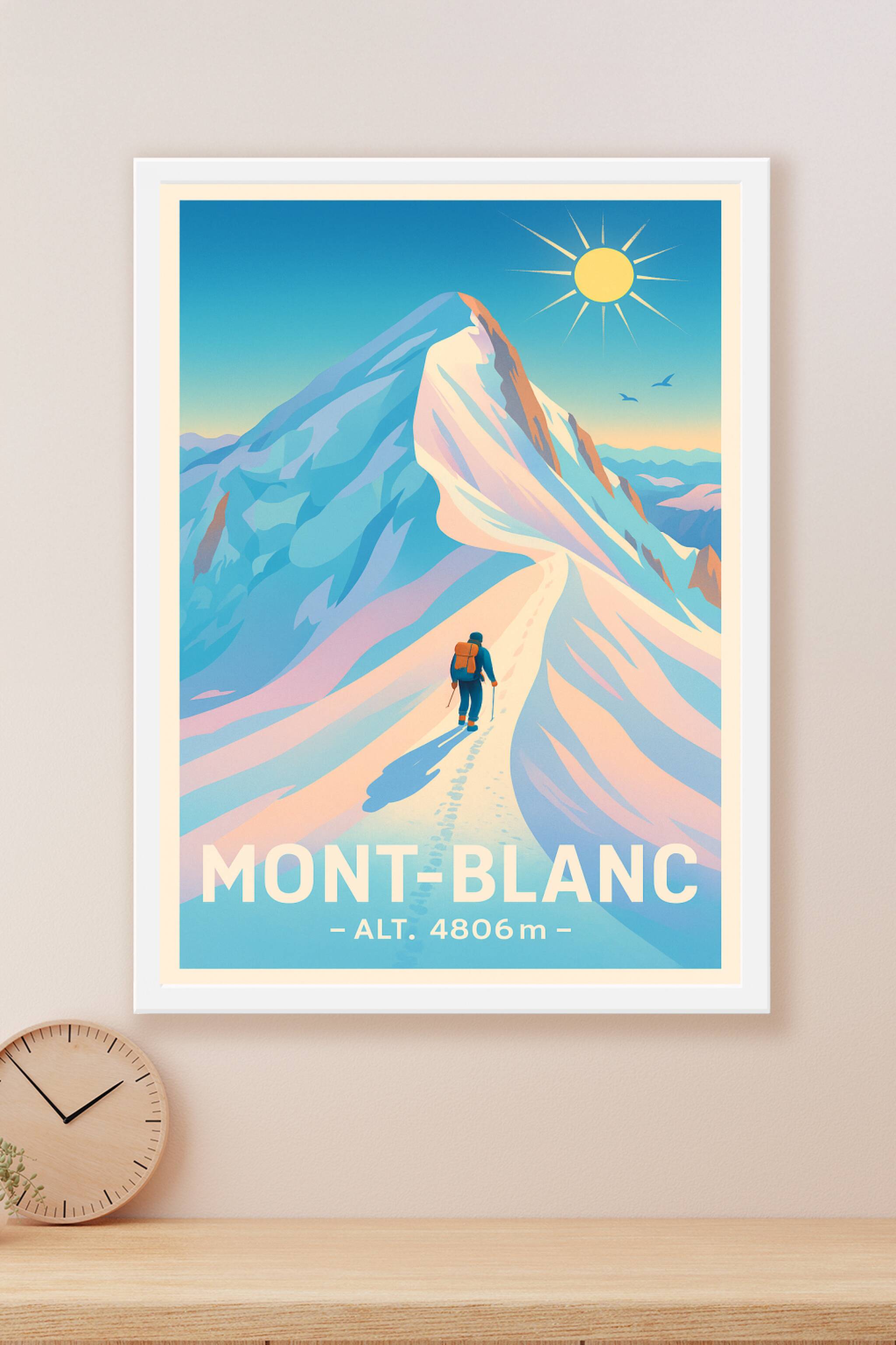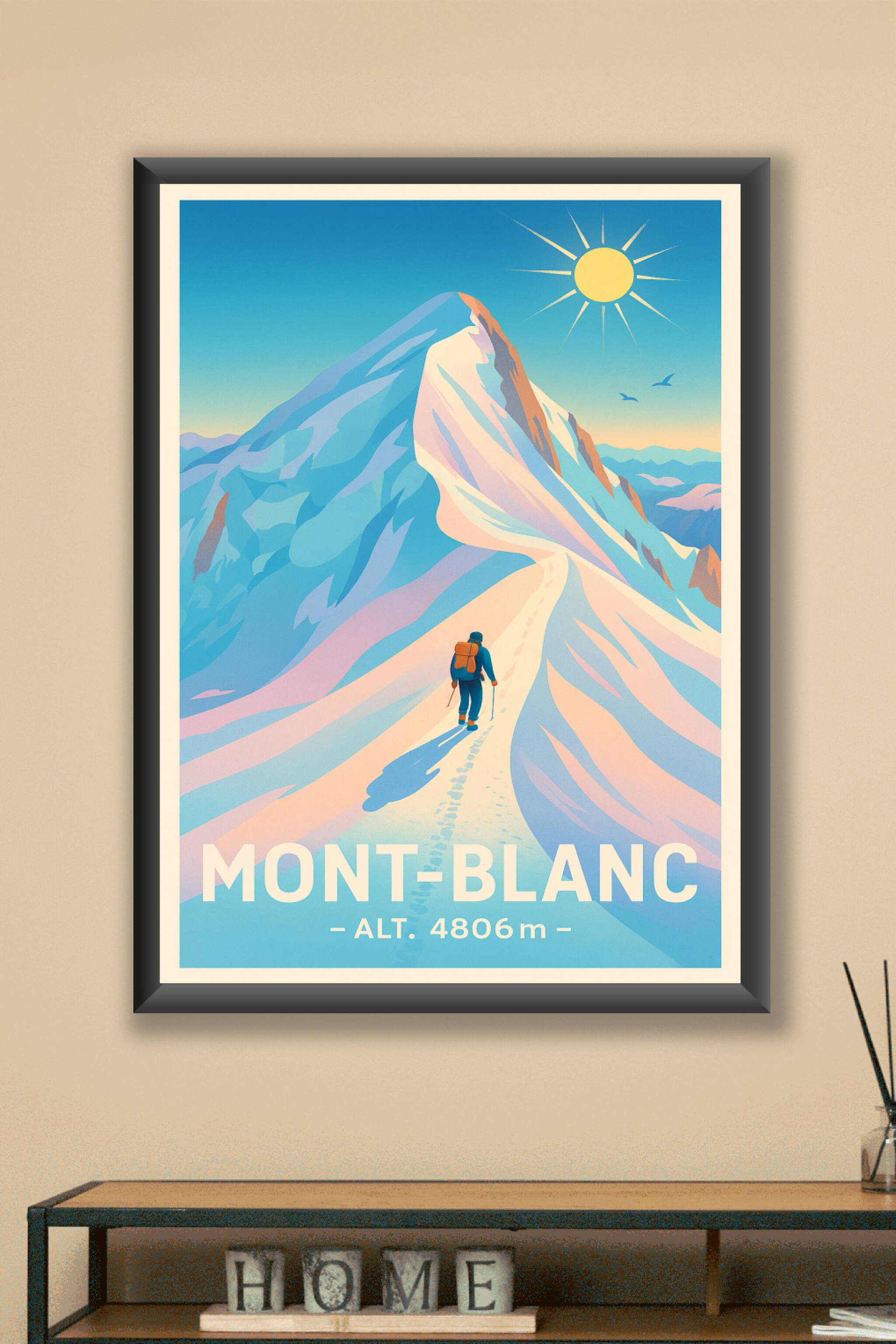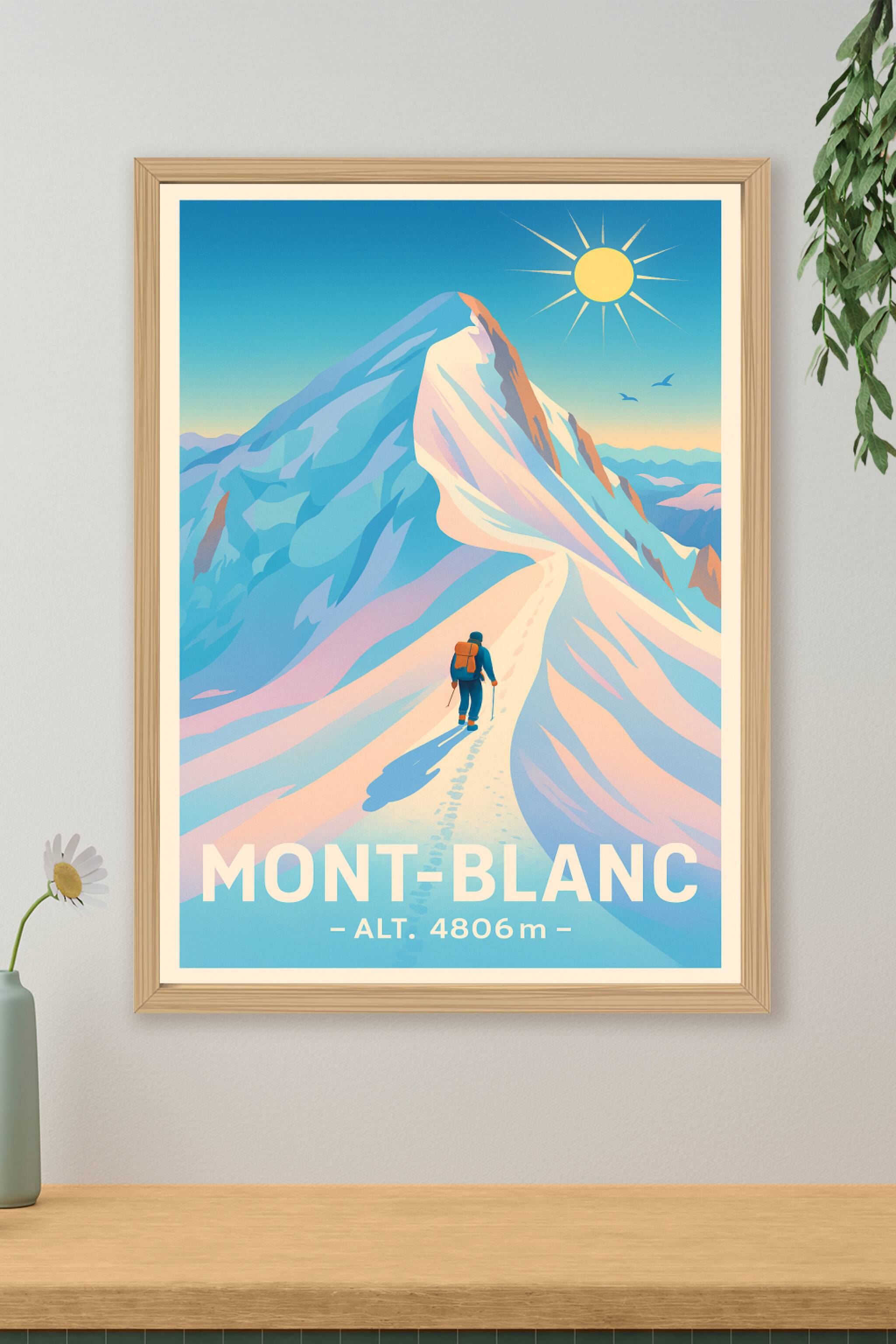 Découvrez la majesté du Mont-Blanc à travers cette affiche illustrée au design épuré et intemporel. Ce poster met en scène l'ascension d'un alpinis...