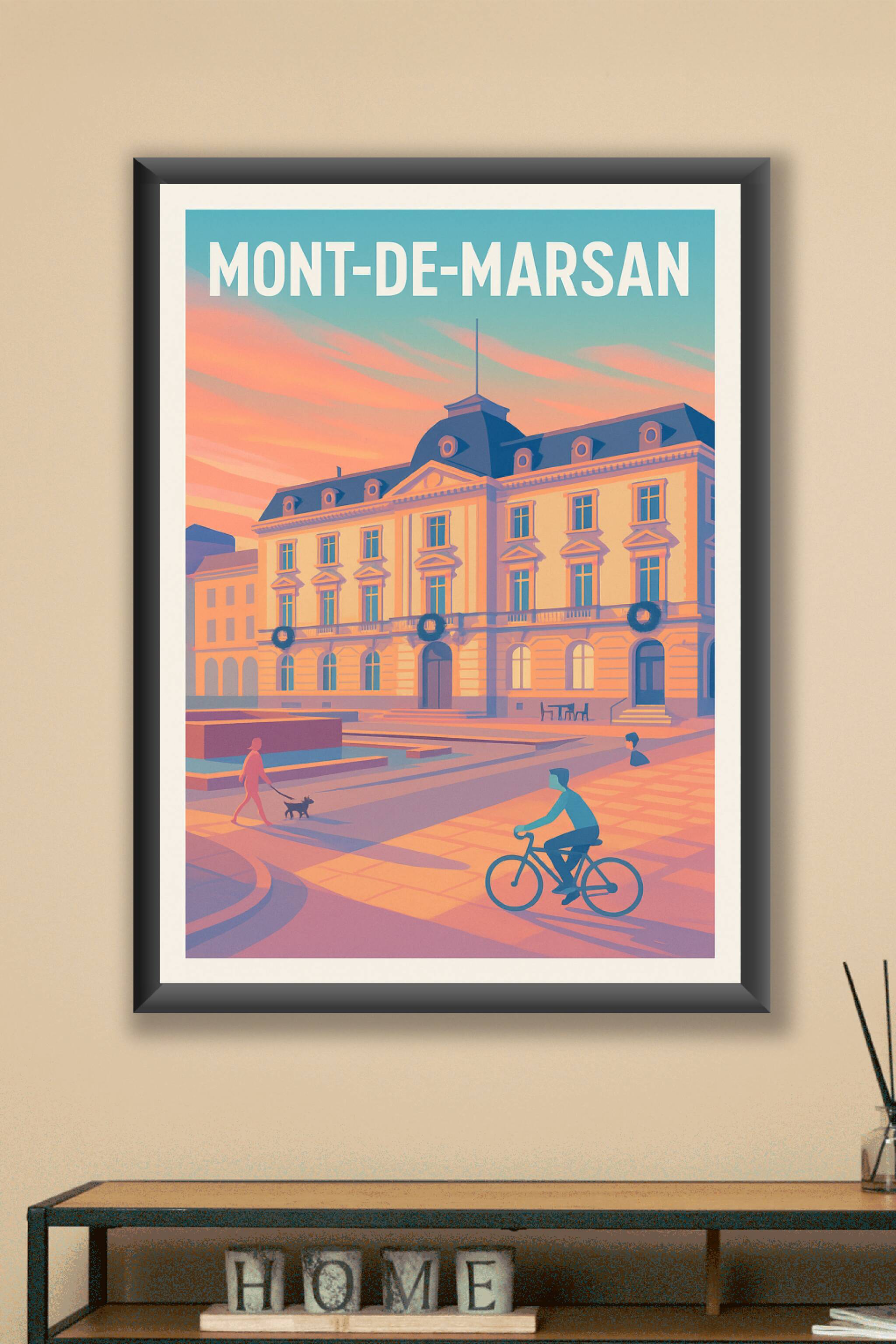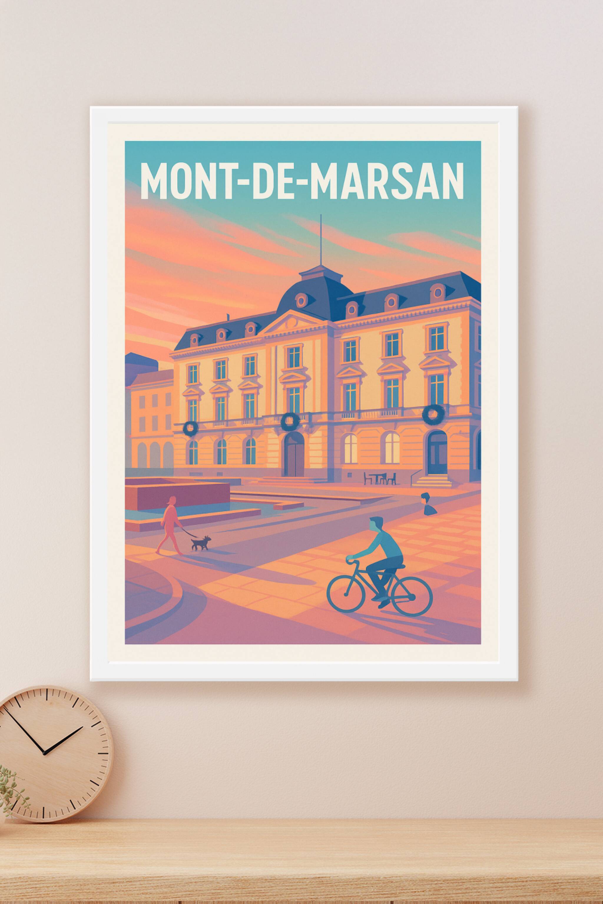Découvrez cette magnifique affiche illustrant la douceur du coucher de soleil sur Mont-de-Marsan. Ce poster met en valeur l'architecture emblématique de la ville dans une palette de couleurs chaudes et apaisantes, capturant un instant de vie paisible où balades à vélo et promenades au chien dessinent une atmosphère conviviale et chaleureuse. Imprimé en tirage "Fine Art" sur papier 305g coton, ce poster vous garantit une qualité d'impression exceptionnelle et durable. Disponible en formats A1 à A4, cette affiche est proposée avec ou sans cadre pour s'adapter parfaitement à votre intérieur. Offrez à votre décoration une touche d'élégance locale avec ce produit 100% fabriqué en France, idéal pour les amateurs de Mont-de-Marsan ou comme cadeau raffiné.