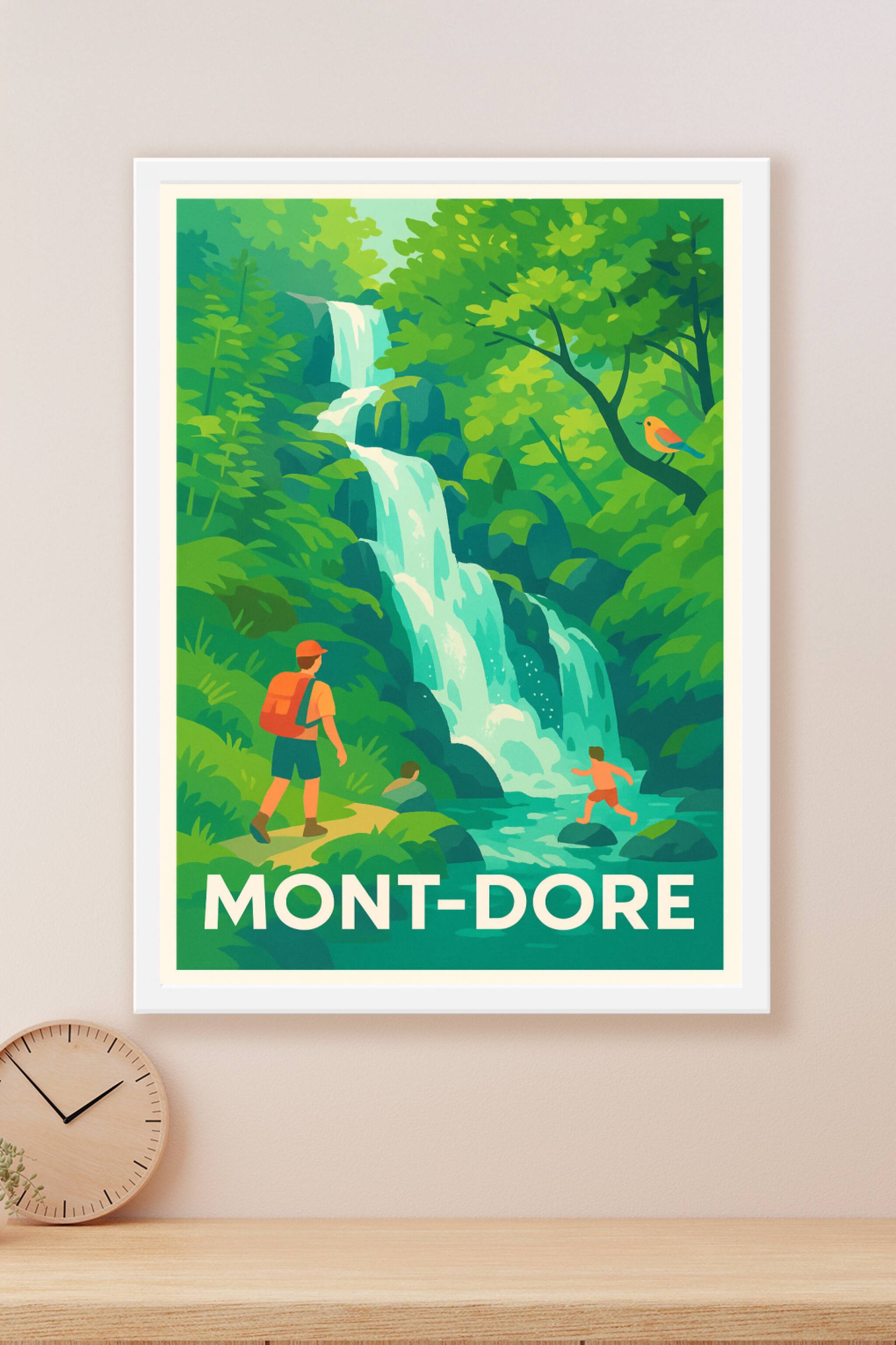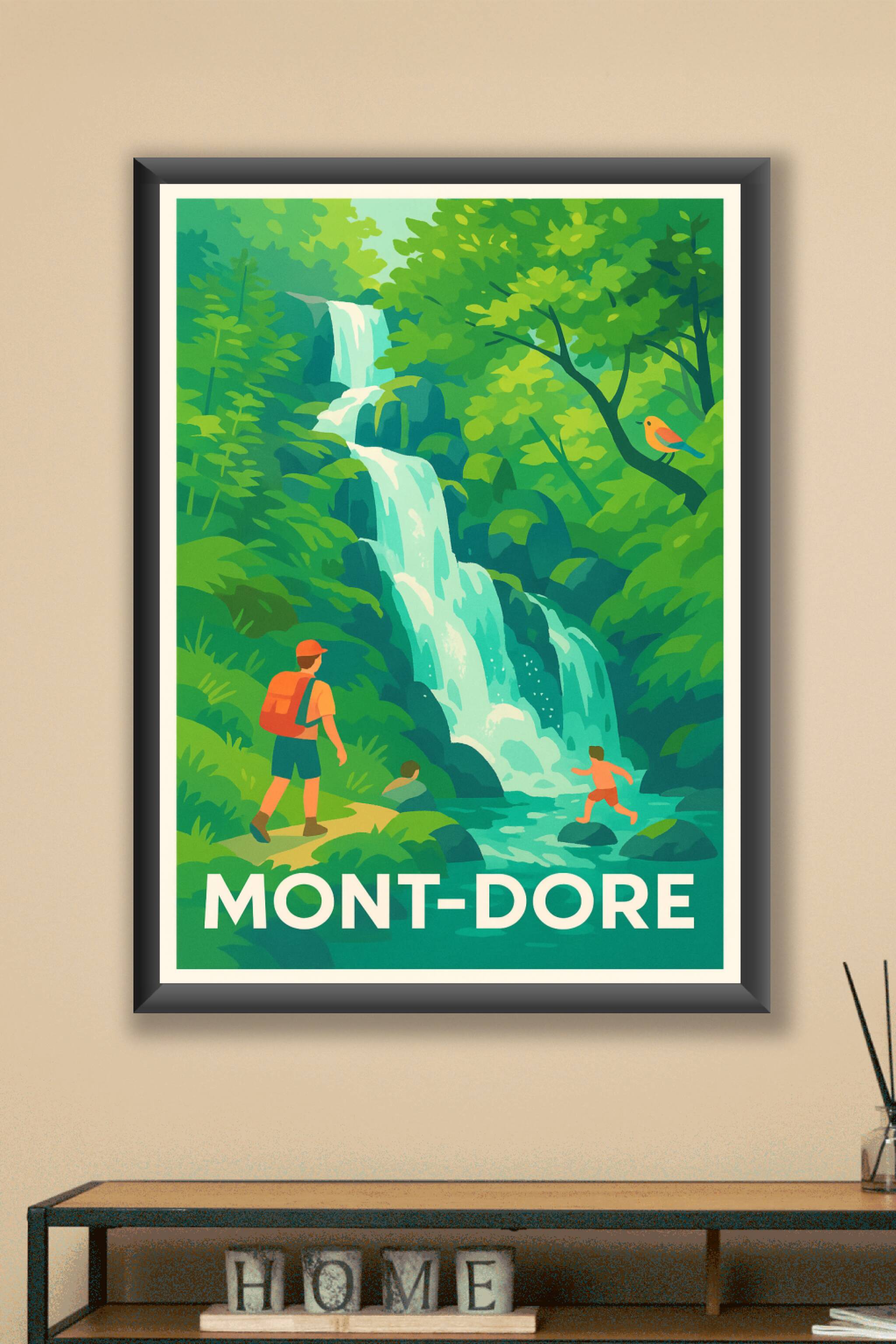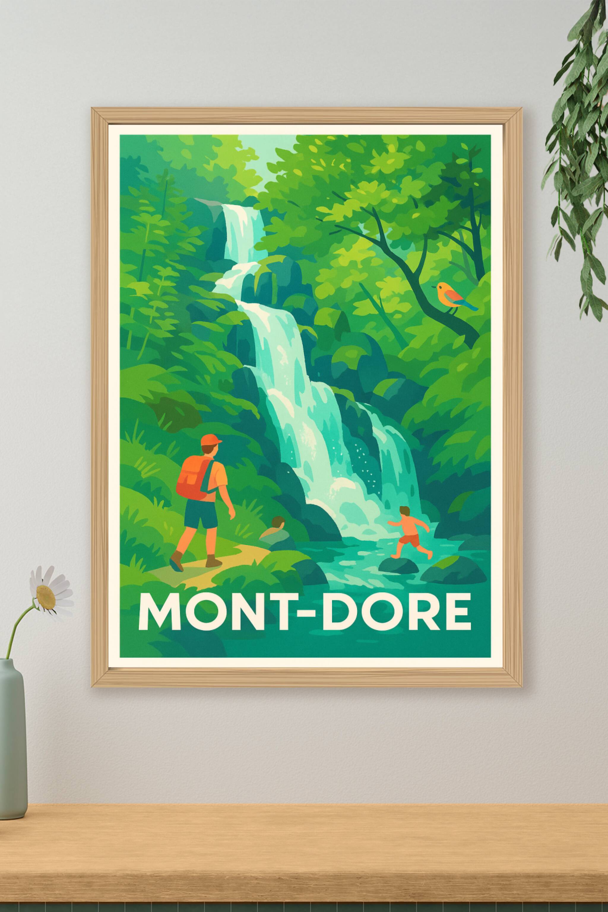 Découvrez la beauté sauvage de Mont-Dore à travers cette affiche captivante illustrant une cascade rafraîchissante entourée d'une végétation luxuri...