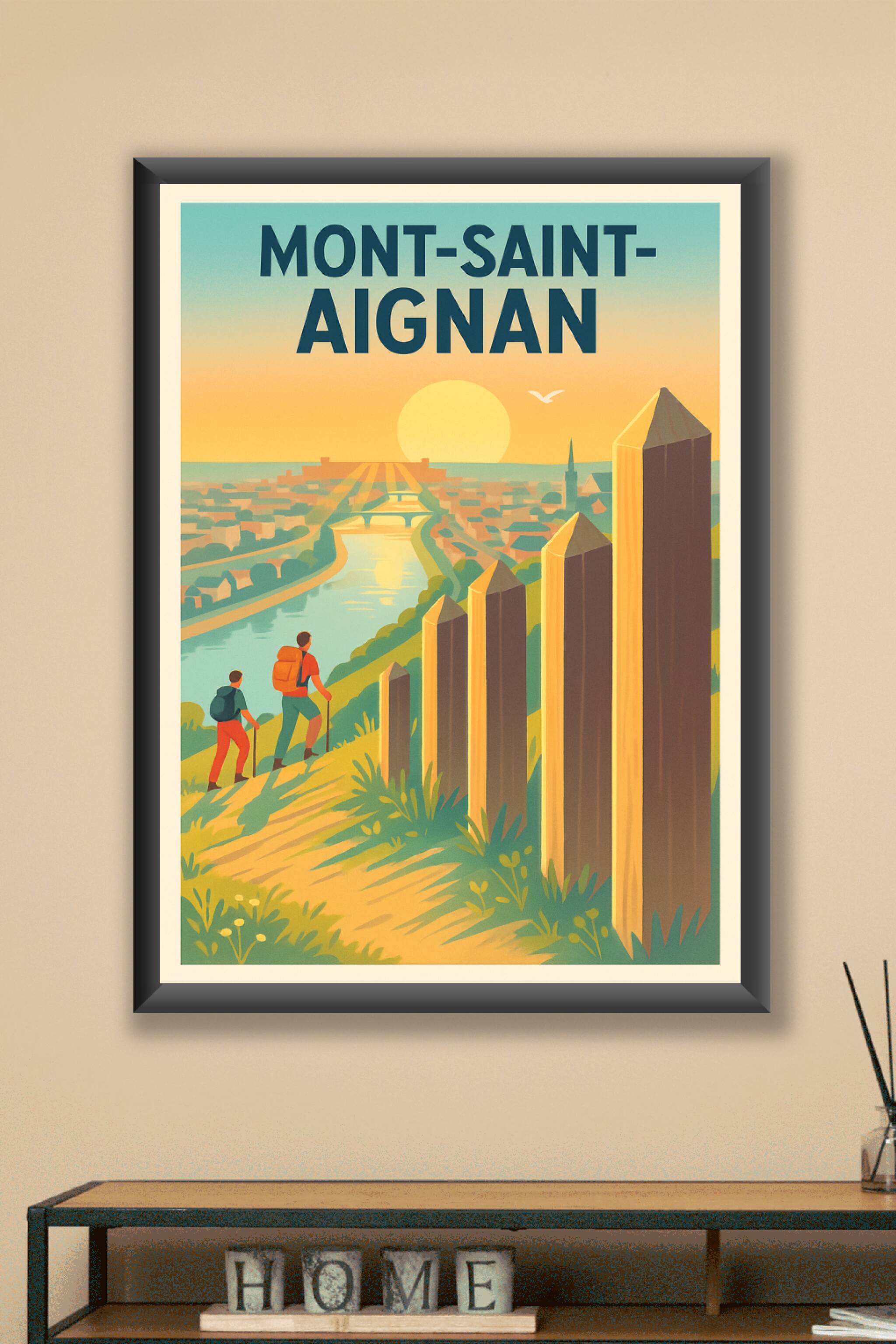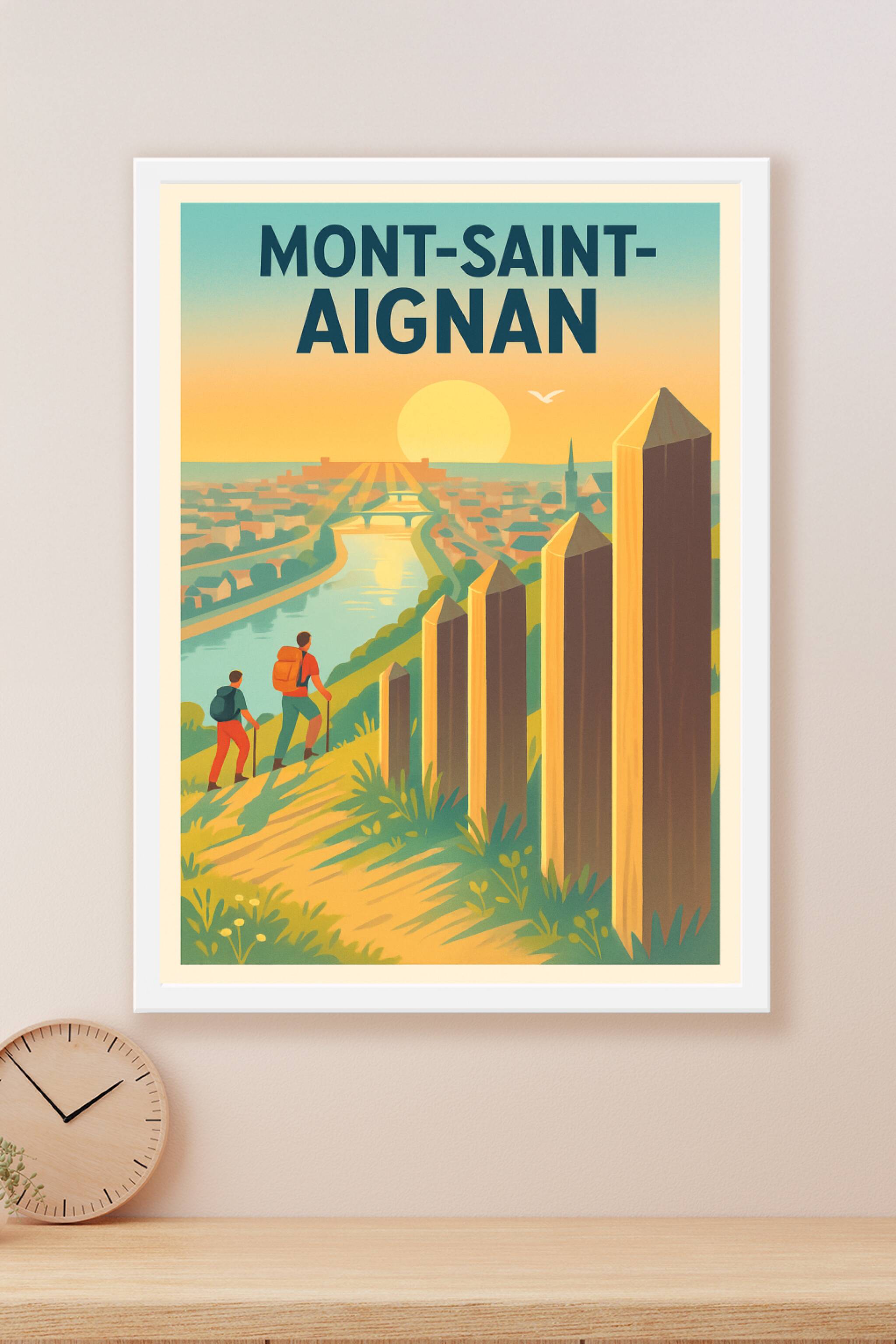Découvrez l'envoûtant paysage de Mont-Saint-Aignan avec cette affiche au style rétro chic, où deux randonneurs admirent le coucher de soleil sur la...