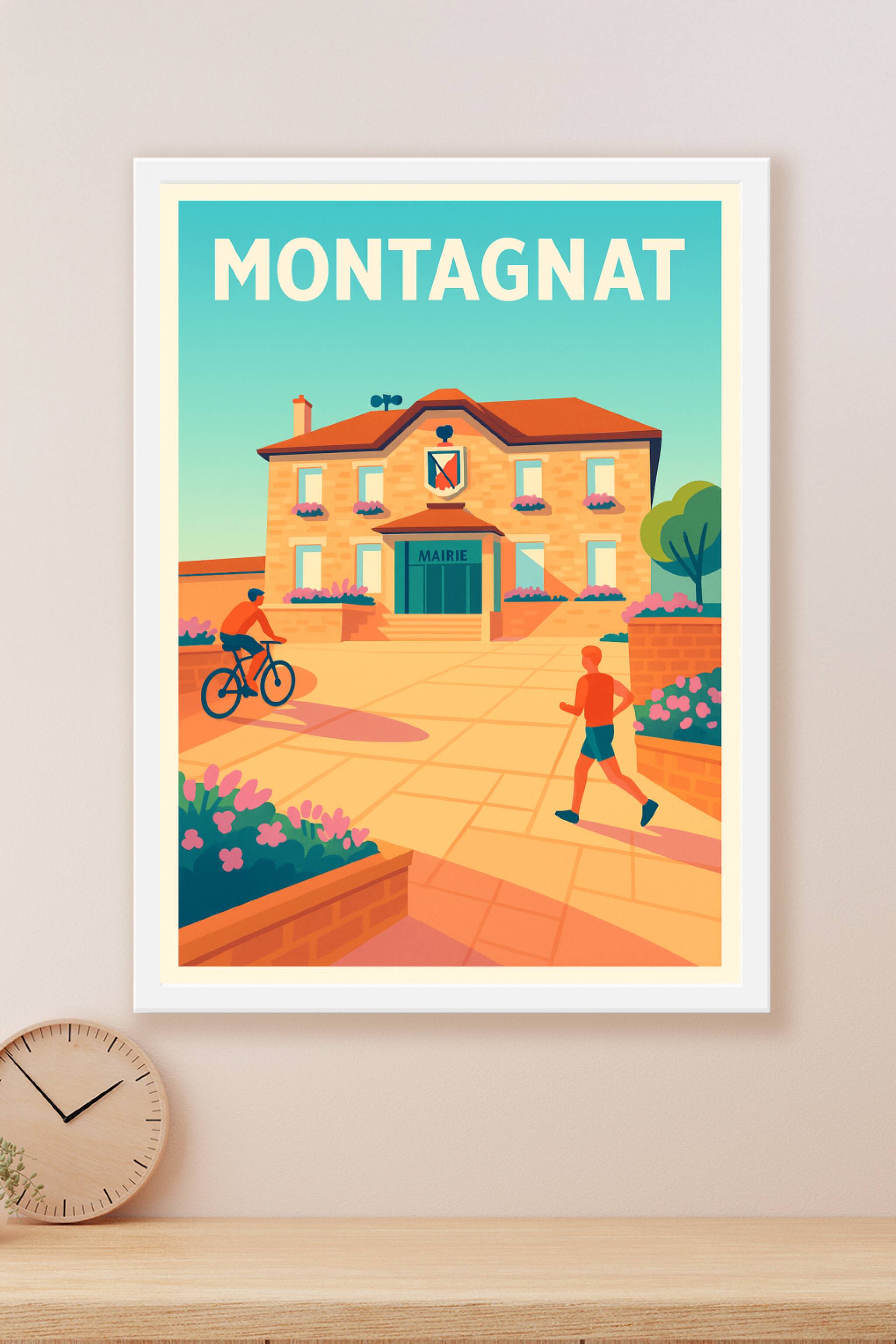 Découvrez l'affiche Montagnat qui capture l'essence paisible de ce charmant village avec un style graphique lumineux et accueillant. Cette représen...