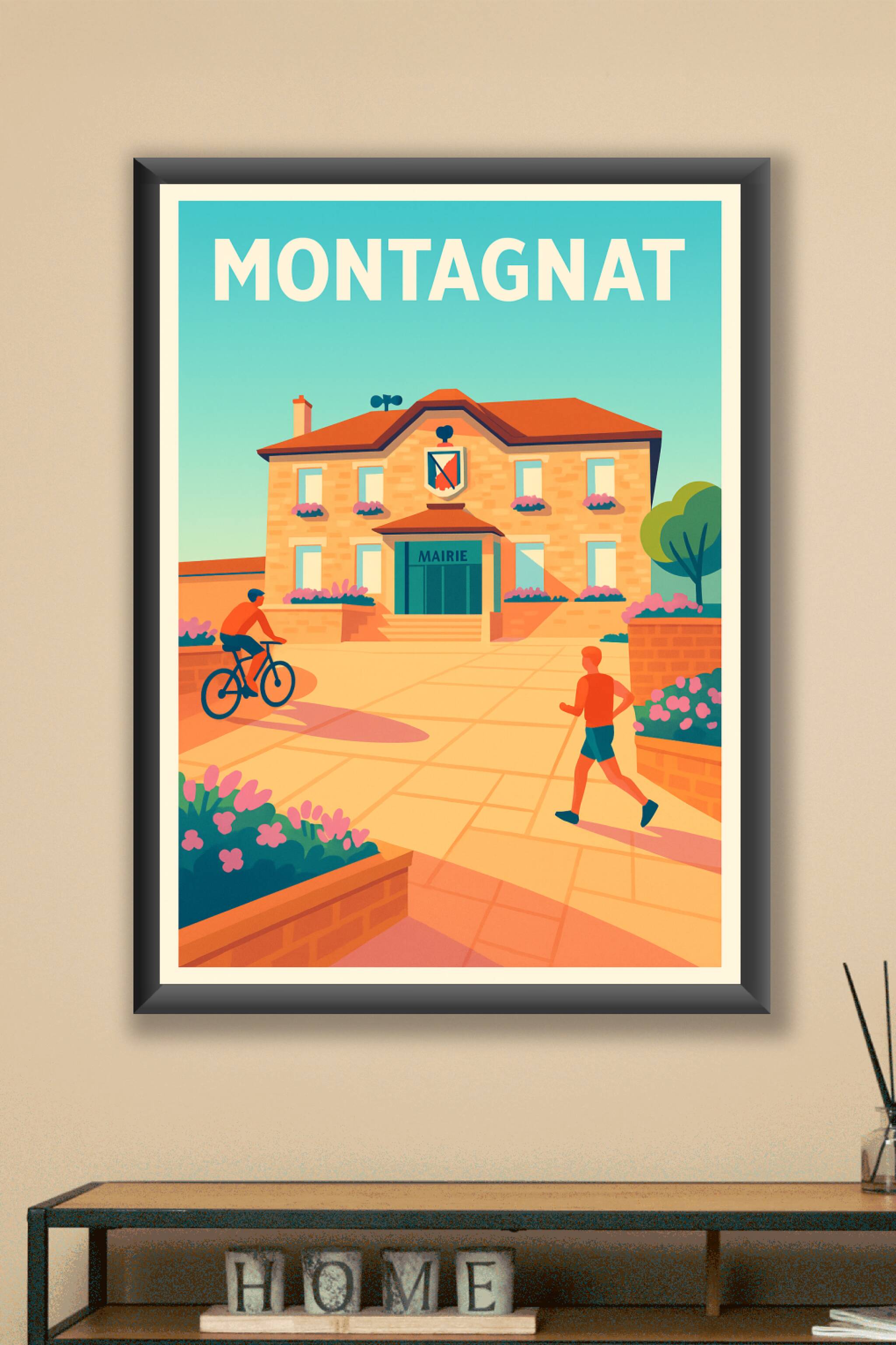 Découvrez l'affiche Montagnat qui capture l'essence paisible de ce charmant village avec un style graphique lumineux et accueillant. Cette représentation de la mairie, entourée de verdure et d’habitants actifs, invite à une immersion dans une ambiance tranquille et conviviale. Imprimée en tirage "Fine Art" sur papier 305g coton, cette affiche garantit une qualité d'impression exceptionnelle et une durabilité optimale. Disponible en formats A1 à A4, avec ou sans cadre, ce poster apportera une touche d'élégance et de douceur à votre décoration intérieure. Fabriquée en France, cette affiche Montagnat est le cadeau idéal pour les amoureux de cette région ou pour enrichir votre collection d'œuvres artistiques locales.
