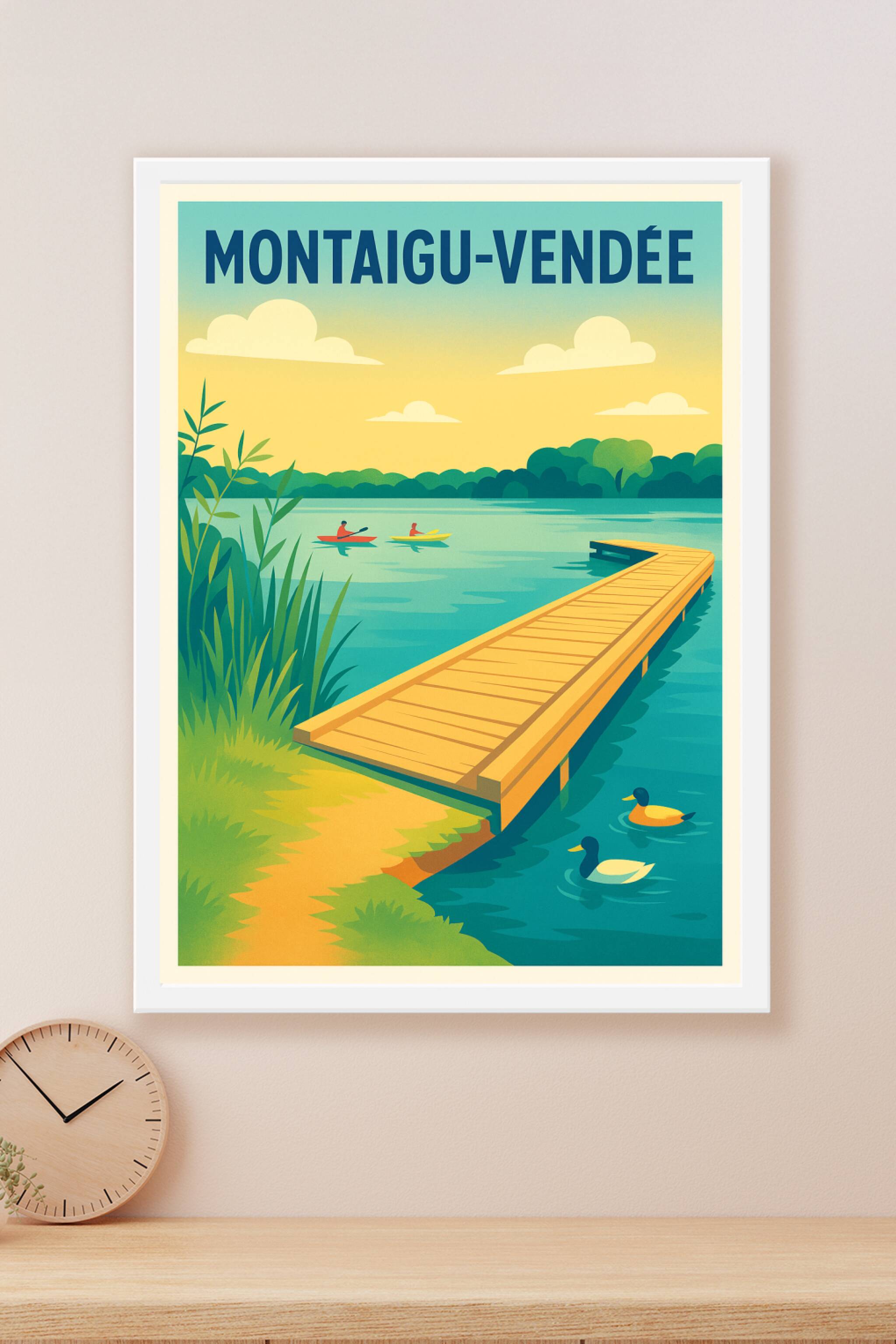 Offrez-vous une invitation à la détente avec cette affiche inspirée par les paysages paisibles de Montaigu-Vendée. Ce poster évoque les instants calmes au bord de l'eau, entre kayaks glissant sur le lac et canards nageant tranquillement, avec une passerelle en bois menant vers l'aventure. Imprimée en tirage "Fine Art" sur papier 305g coton, cette affiche garantit une qualité d'impression exceptionnelle, aux couleurs vives et durables. Disponible en formats A1 à A4, avec ou sans cadre, ce poster apportera une ambiance sereine et naturelle à votre intérieur. Fabriqué en France, il constitue un cadeau idéal pour les amateurs de nature et de paysages authentiques.
