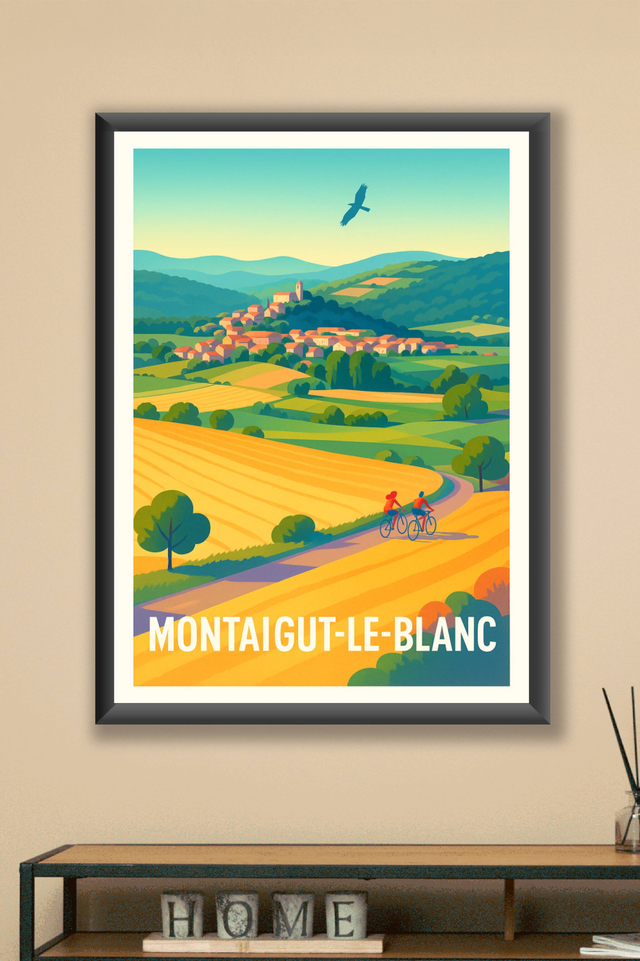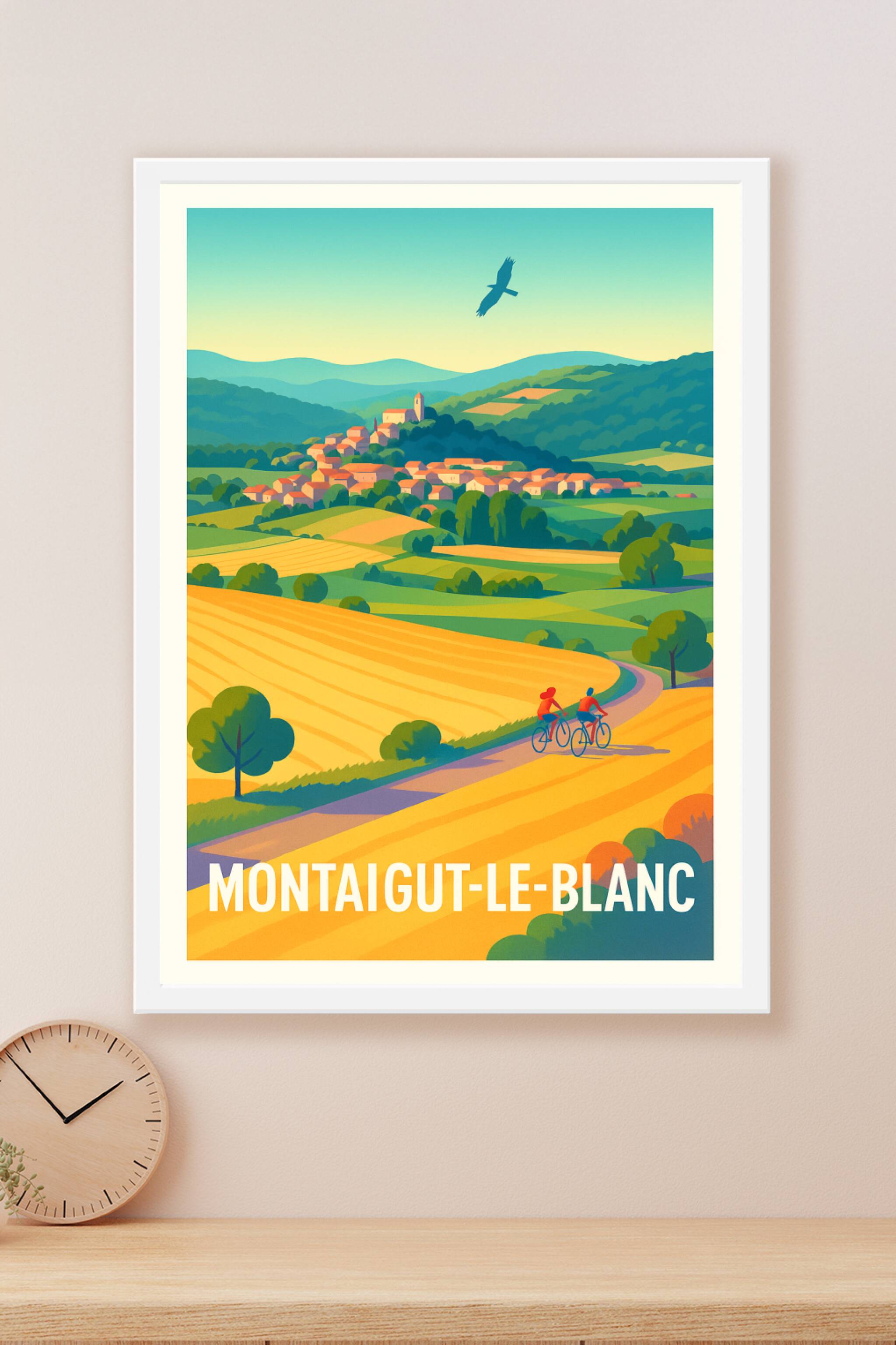 Appréciez la sérénité et la beauté champêtre de Montaigut-le-Blanc avec cette affiche illustrée aux couleurs chaudes et harmonieuses. Le poster représente un paysage vallonné typique, où deux cyclistes parcourent une route sinueuse entourée de champs dorés et de collines verdoyantes.L'impression fine art garantit une qualité irréprochable, réalisée sur papier 305g coton pour des détails précis et des couleurs éclatantes. Ce poster est disponible en formats A1 à A4, avec ou sans cadre, idéal pour apporter une touche de douceur et de nature à votre décoration intérieur. Offrez-vous ce tirage premium, fabriqué en France, qui sublimera votre espace et ravira les amoureux de paysages authentiques.
