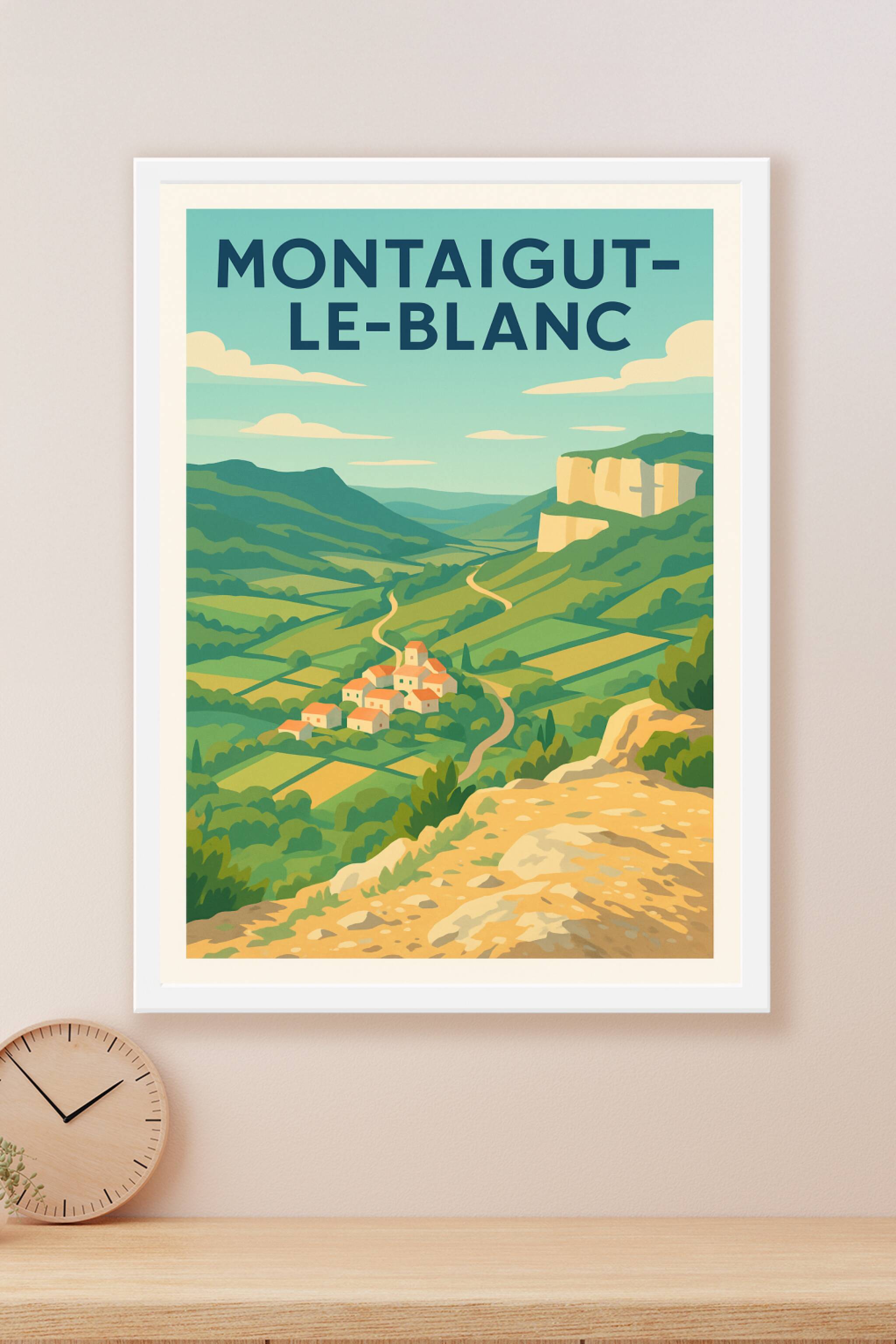 Découvrez le charme bucolique de Montaigut-le-Blanc avec cette affiche illustrée qui met en valeur la beauté naturelle et la sérénité des vallées v...