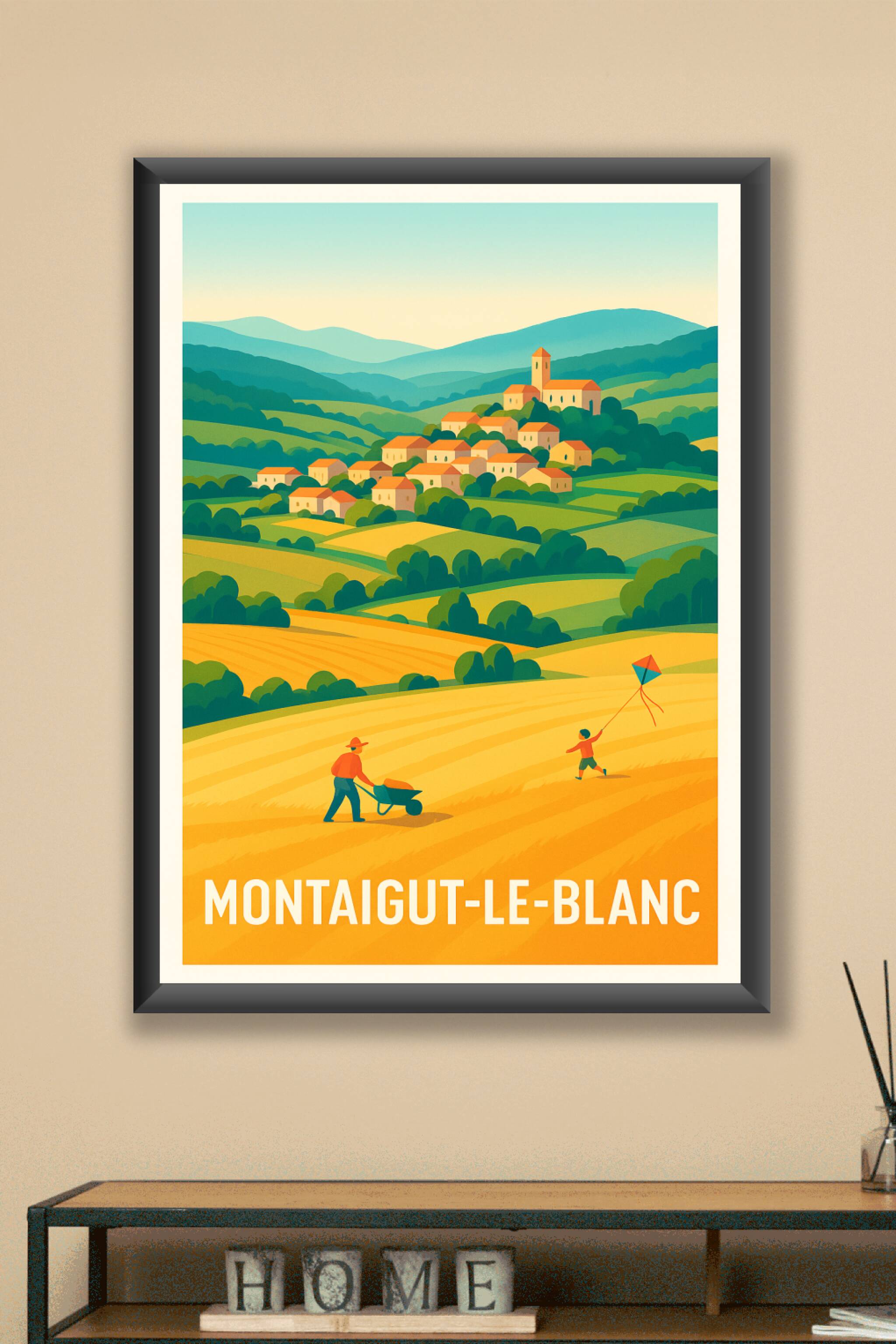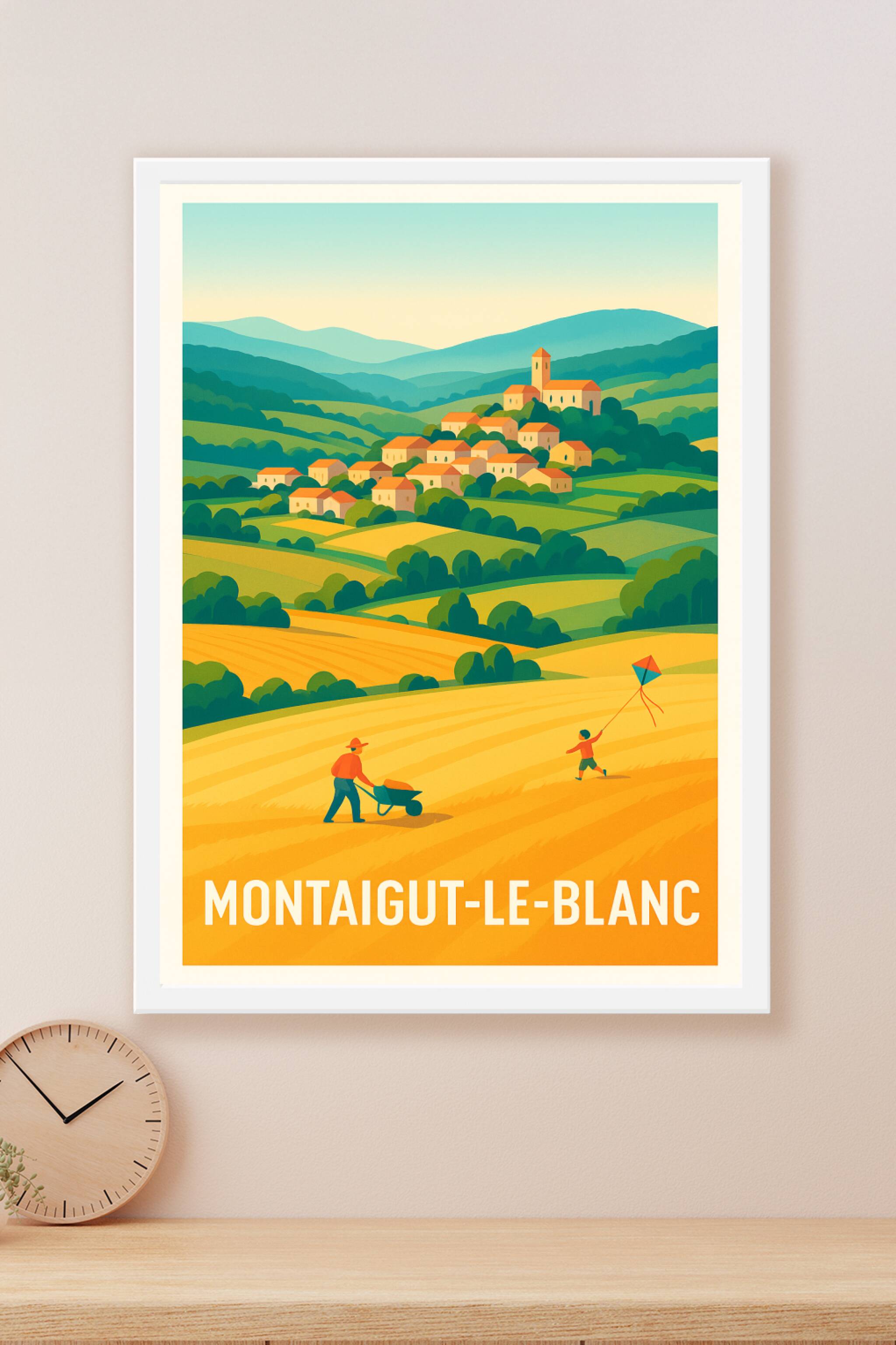 Découvrez la douceur de vivre à Montaigut-le-Blanc avec cette affiche au style vintage, illustrant un village niché au cœur des collines verdoyante...