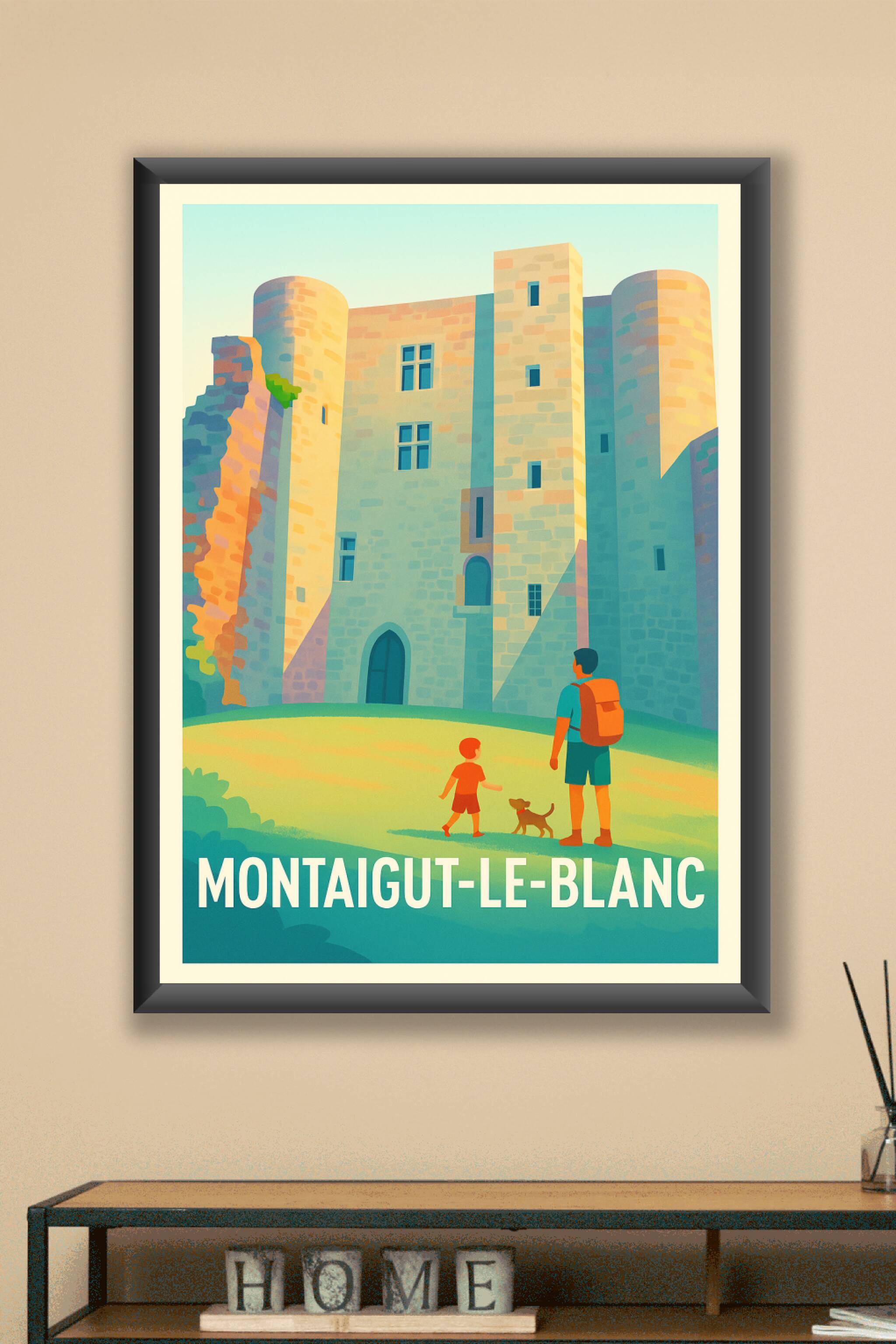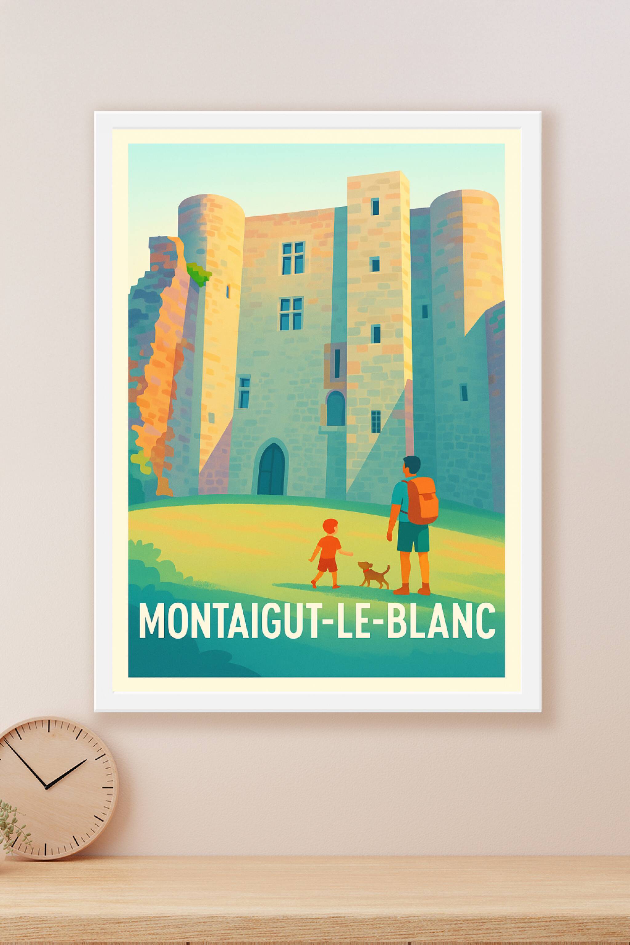 Découvrez la beauté historique et l'ambiance paisible de Montaigut-le-Blanc avec cette affiche illustrée captivante mettant en valeur son majestueu...