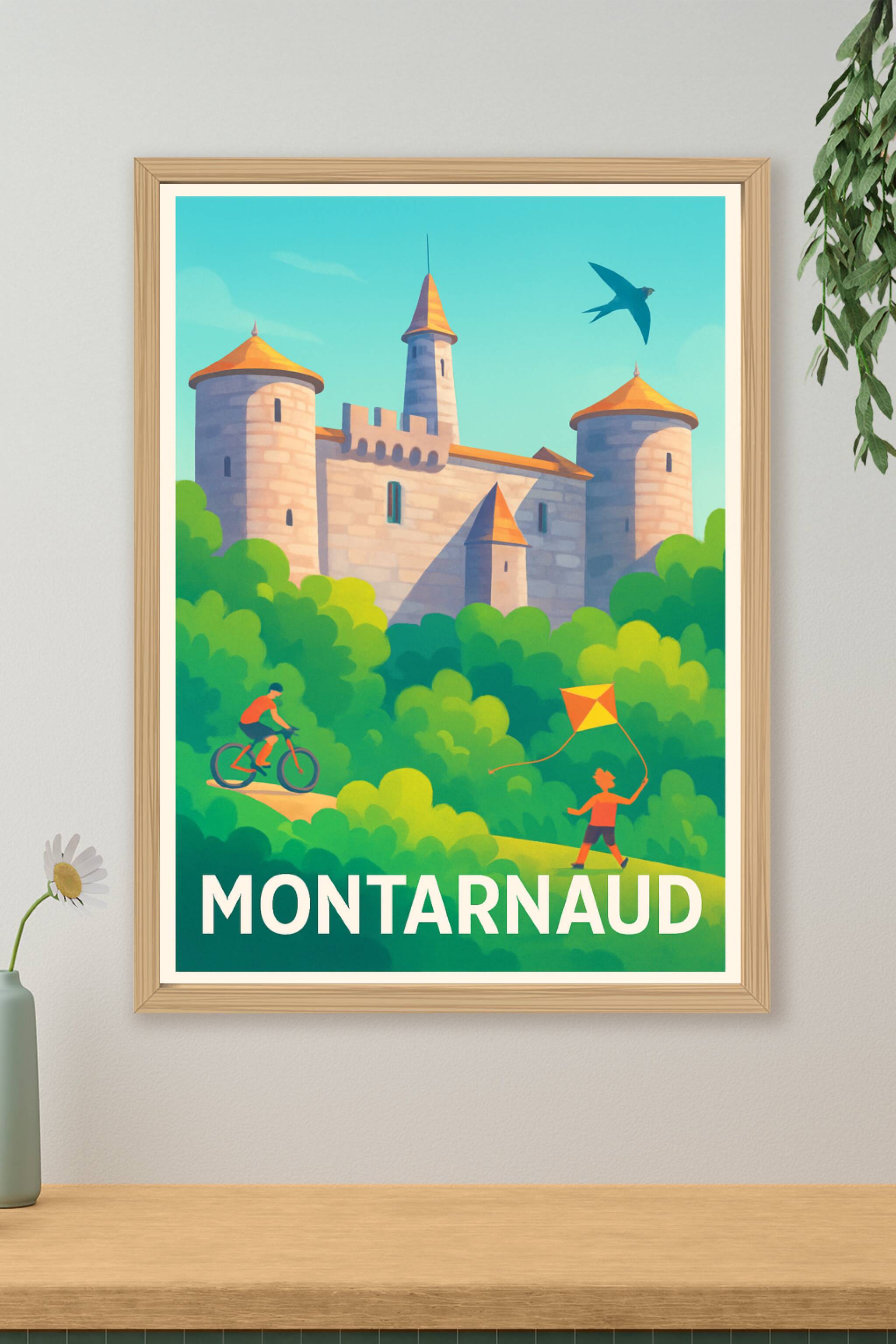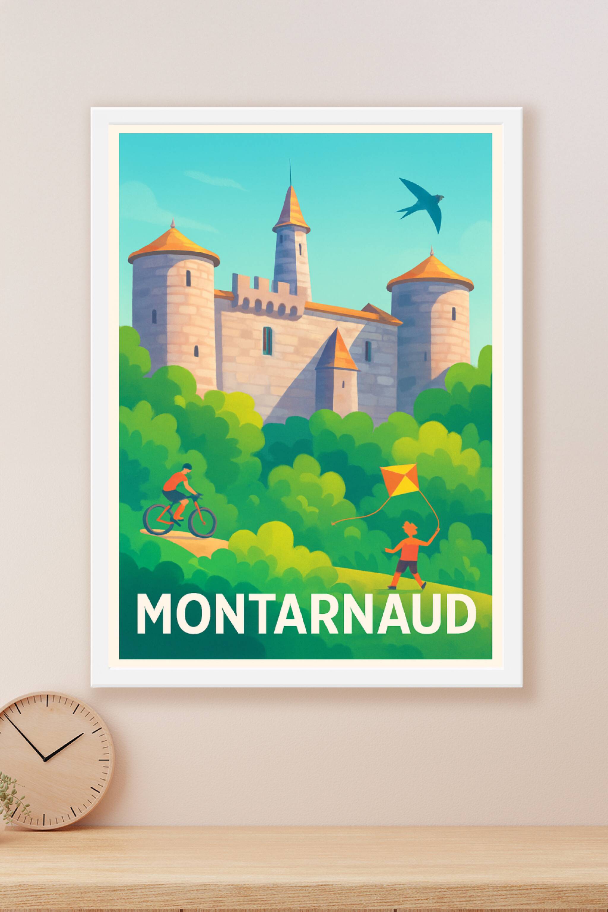 Découvrez l'affiche illustrée de Montarnaud qui capture avec finesse son château historique entouré d'une nature luxuriante et animée par des perso...