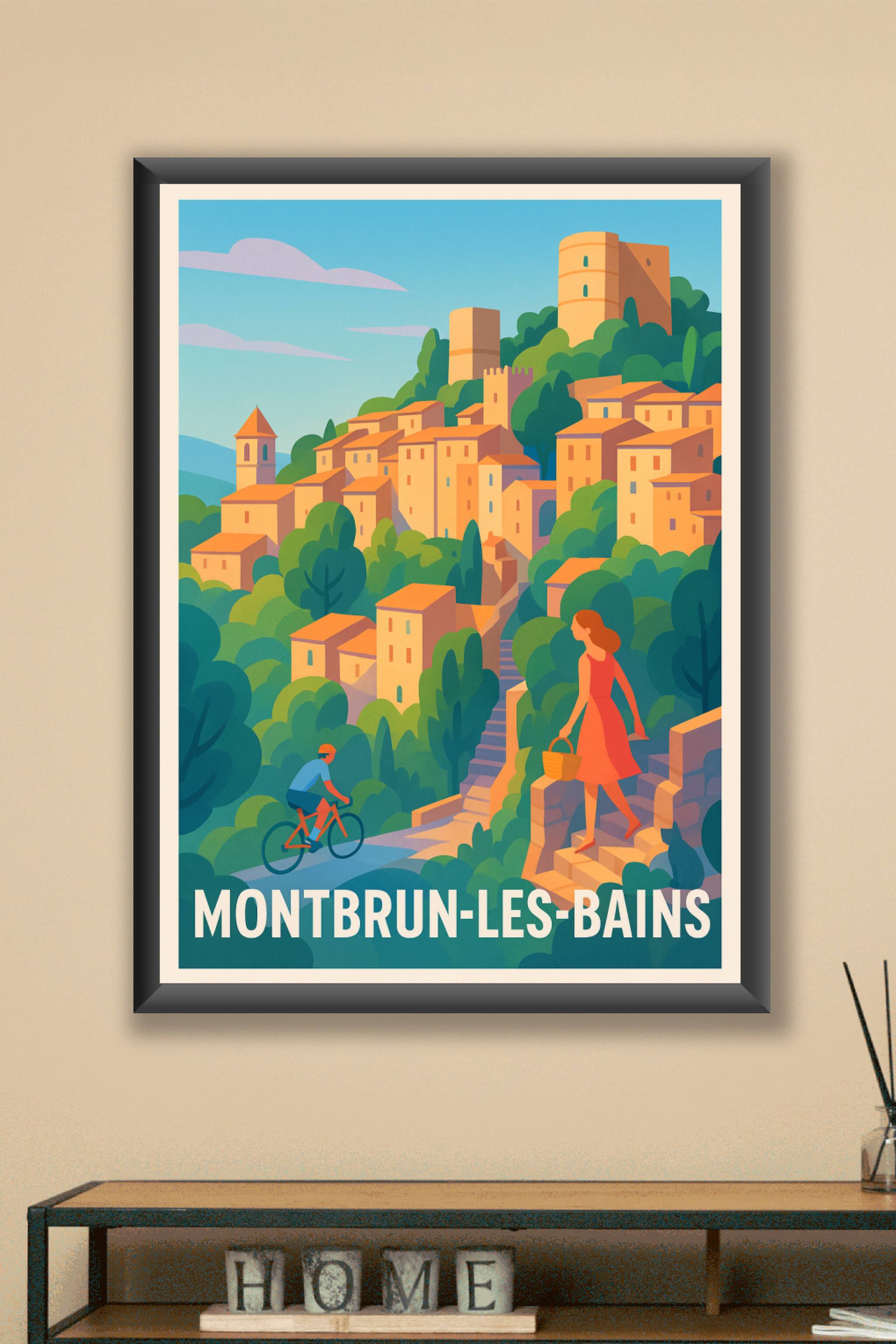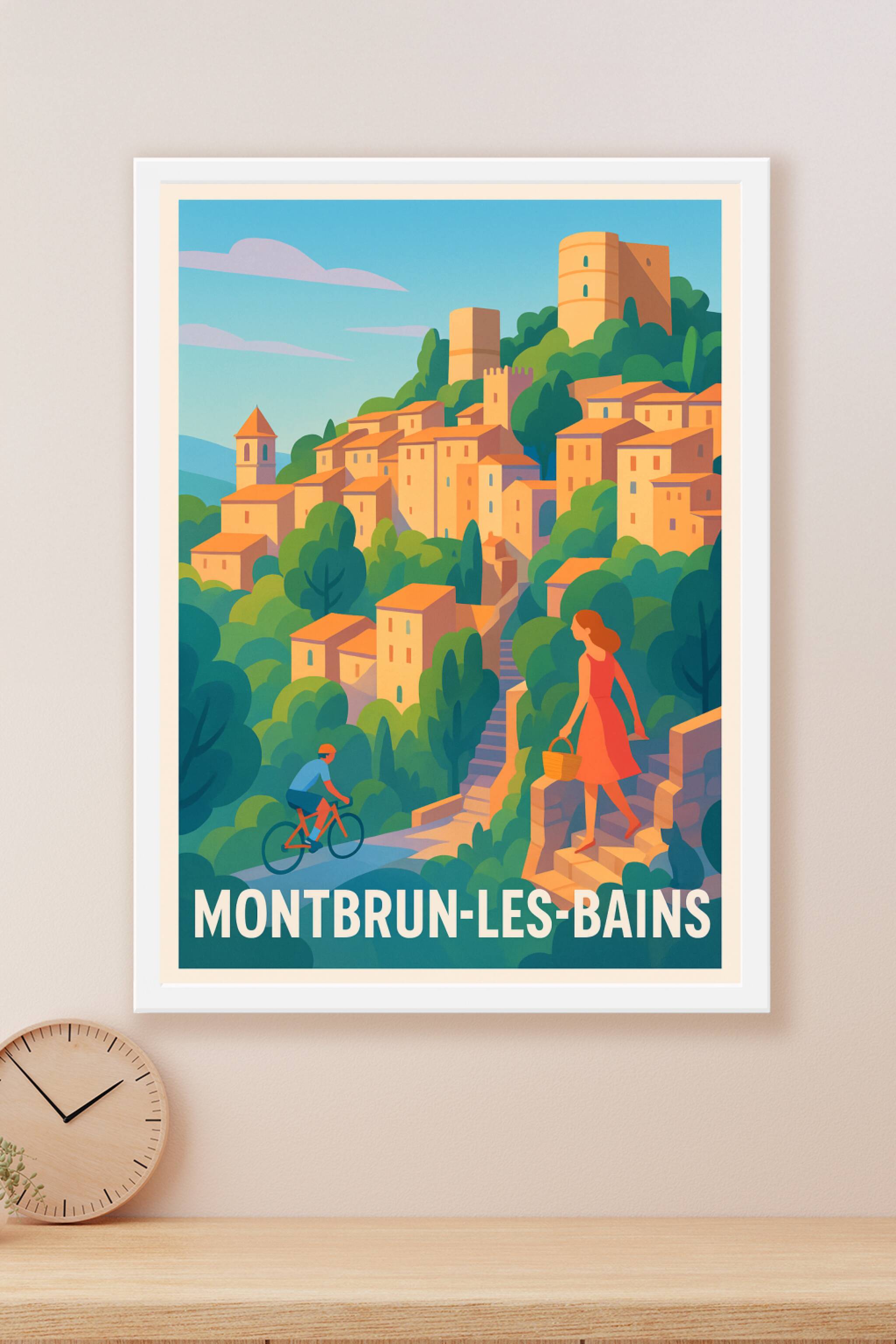 Découvrez toute la douceur et le charme pittoresque de Montbrun-les-Bains avec cette affiche illustrée pleine de couleurs chaudes et d’ambiance pro...