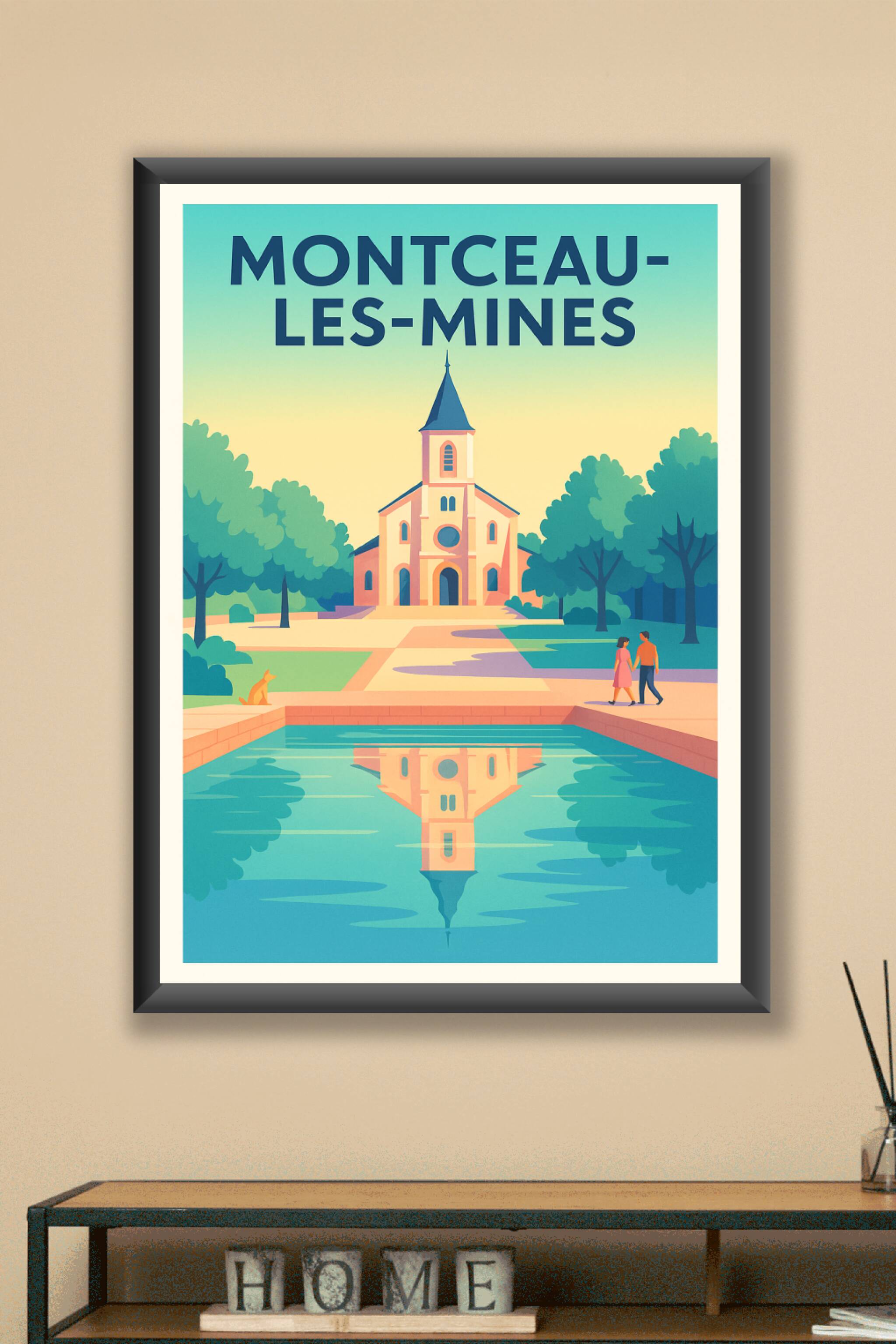 Découvrez cette affiche au style vintage qui met en lumière la charmante ville de Montceau-les-Mines à travers l'illustration d'une église majestueuse reflétée sur un plan d'eau paisible. Ce poster capture l'atmosphère de calme et de douceur qui caractérise ce lieu unique. Disponible en tirage "Fine Art" sur un papier 305g coton de haute qualité, cette affiche vous garantit une impression soignée et durable. Choisissez parmi les formats A1 à A4, avec ou sans cadre, pour sublimer votre intérieur ou offrir un cadeau raffiné aux amateurs d'art et de patrimoine. Profitez d'une production 100% française pour une décoration qui allie authenticité et élégance.